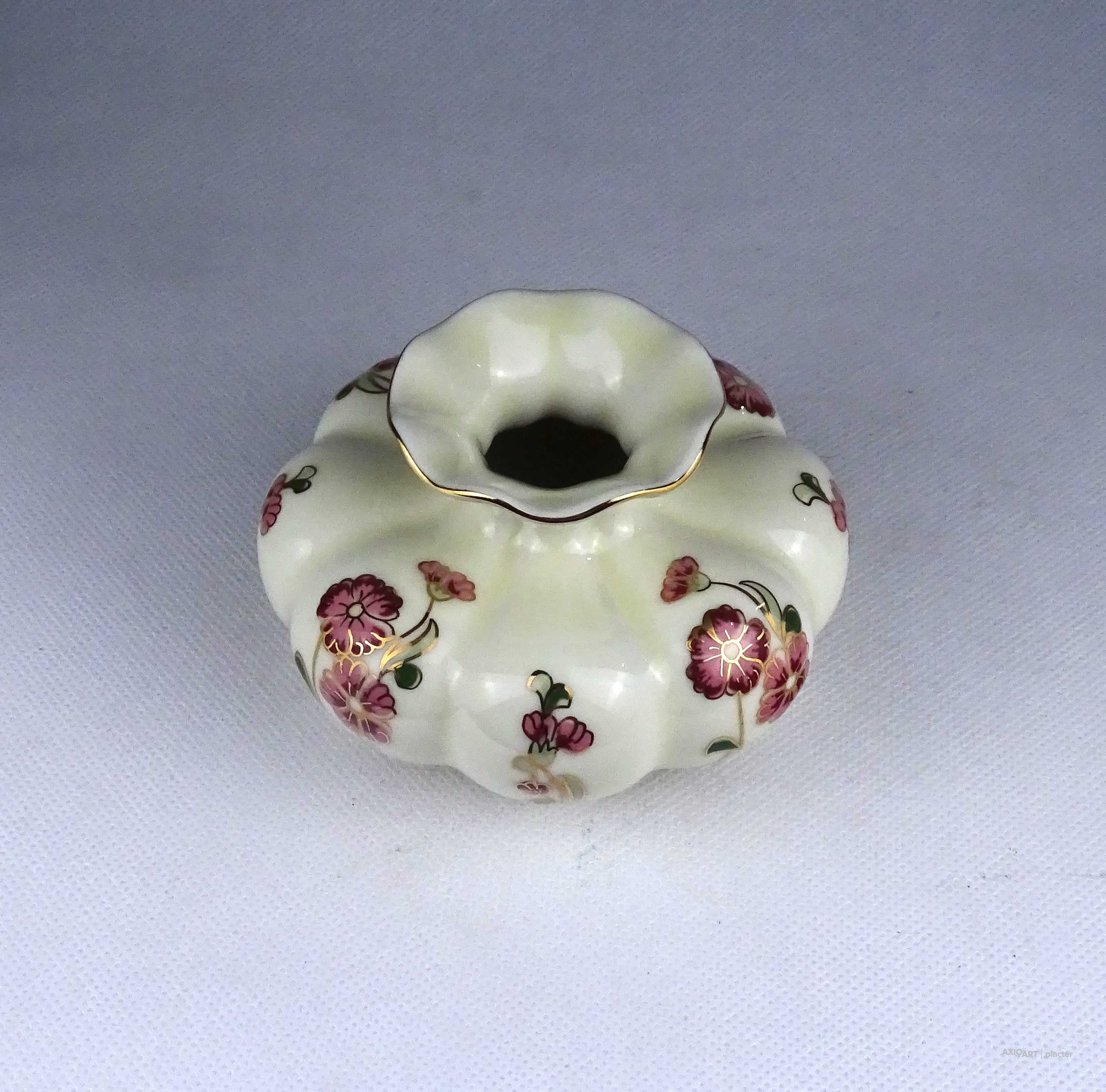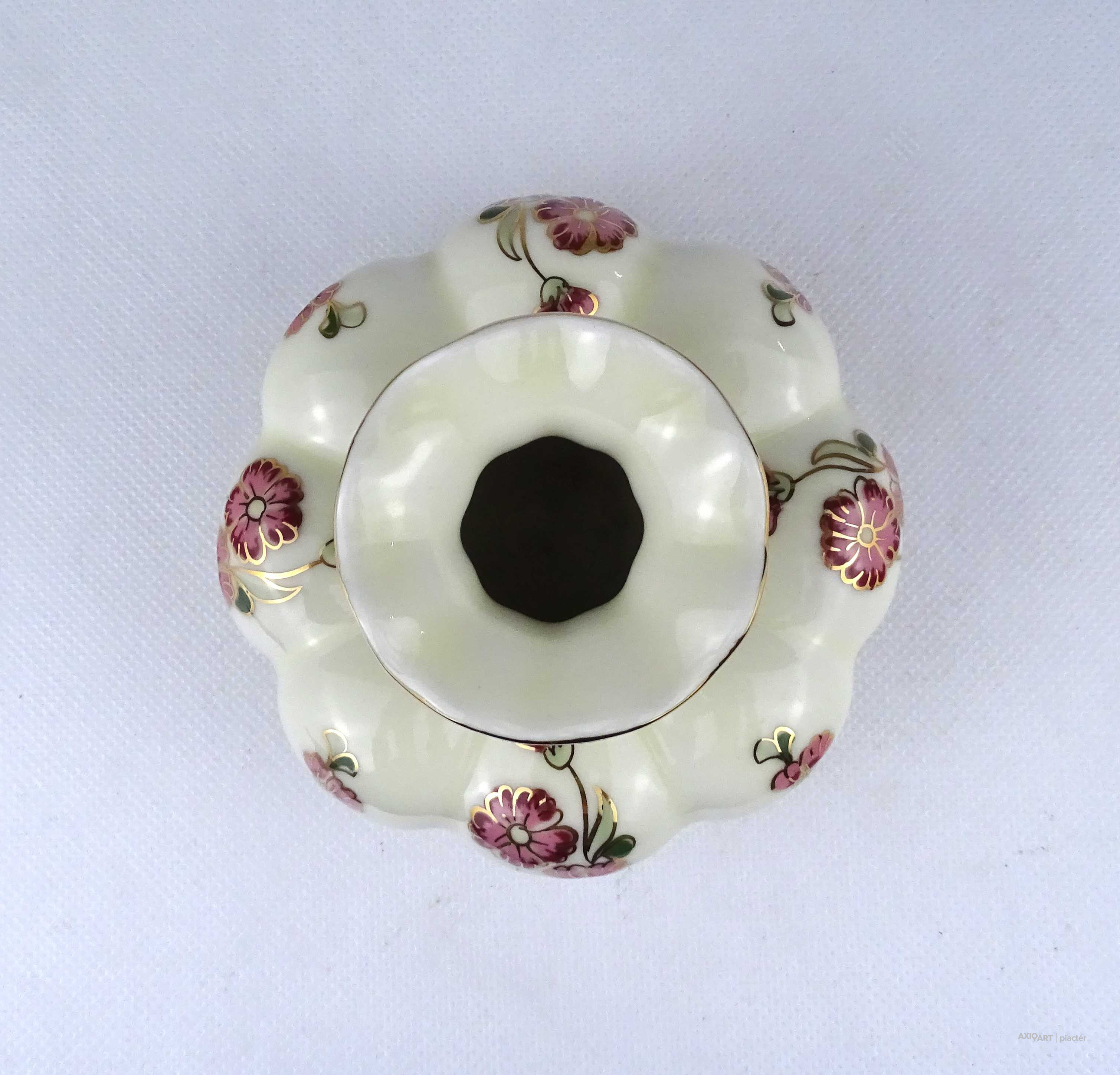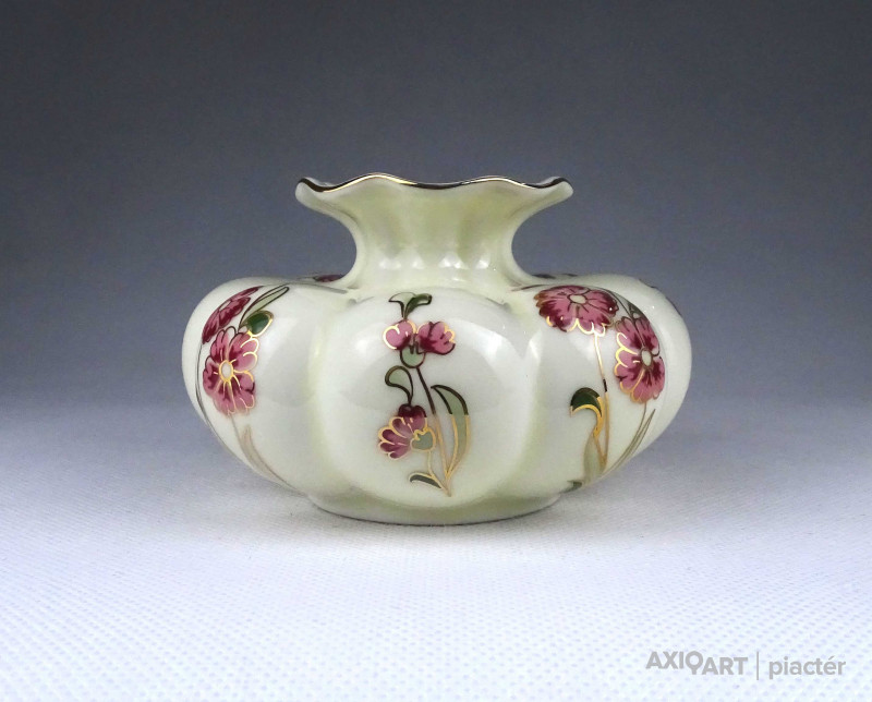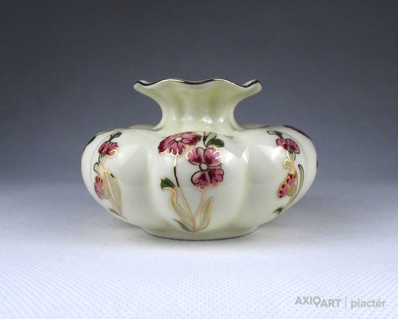 [1Z716/Z023] Hibátlan állapotú, aranyozással gazdagon díszített, vajszínű, virágmintás, gerezdes Zsolnay porcelán váza. Alján zöld Zsolnay öttornyú márkajelzés: ZSOLNAY HUNGARY 1868 PÉCS HAND-PAINTED Arannyal formaszám: 5219/69/53 Magasság: 15 cm Szélesség: 10 cm Súly: 0.4 kg