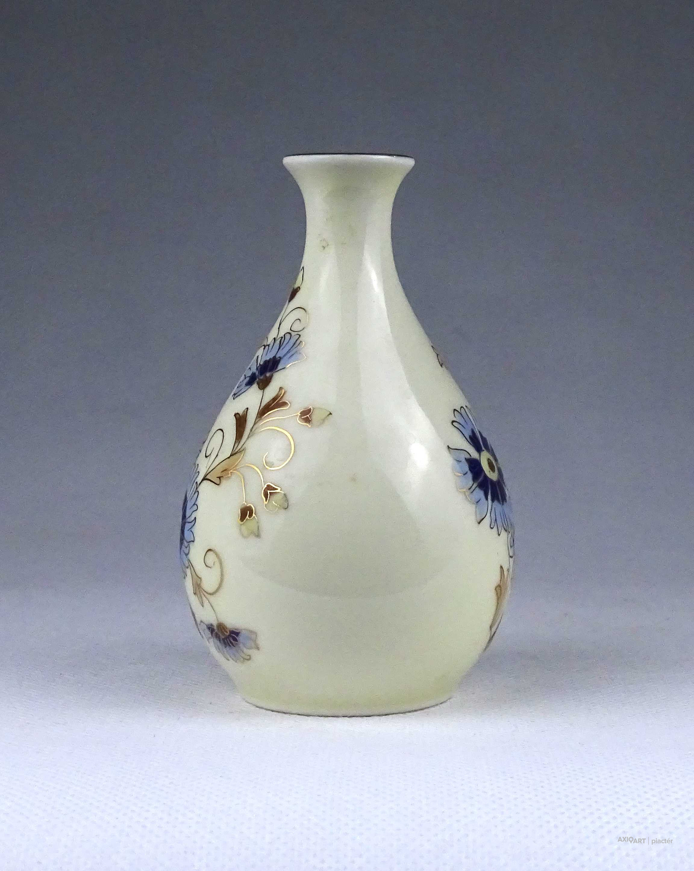 Hibátlan állapotú, vajszínű, gazdagon aranyozott, búzavirág mintás Zsolnay porcelán díszváza, ibolyaváza.