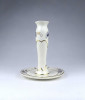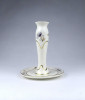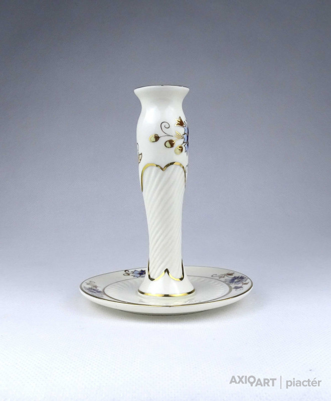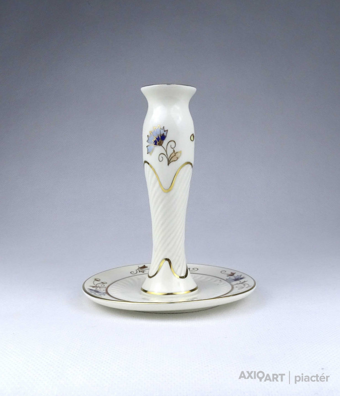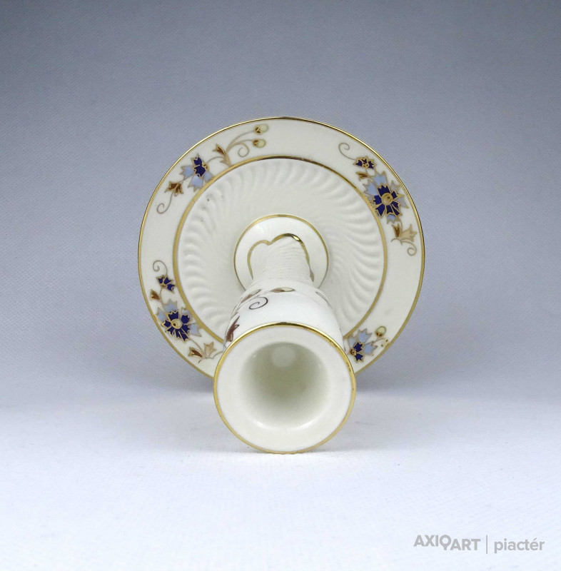 [1Z776/X333] Hibátlan állapotú, vajszínű, aranyozással gazdagon díszített, búzavirág mintás Zsolnay porcelán talpas gyertyatartó. Alján zöld színű Zsolnay öttornyú márkajelzés: ZSOLNAY HUNGARY 1853 PÉCS HAND-PAINTED 2000 Arannyal formaszám: 3287/059 Magasság: 14 cm Szélesség: 11.5 cm Súly: 0.19 kg