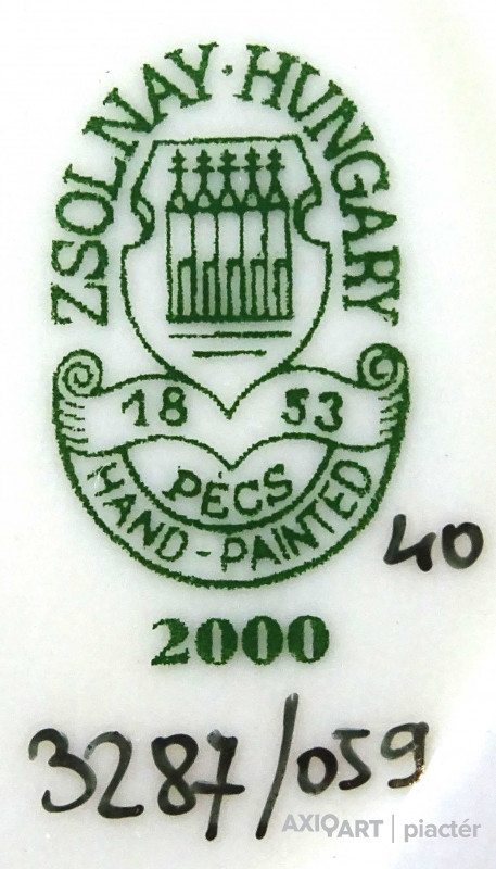 Alján zöld színű Zsolnay öttornyú márkajelzés:
