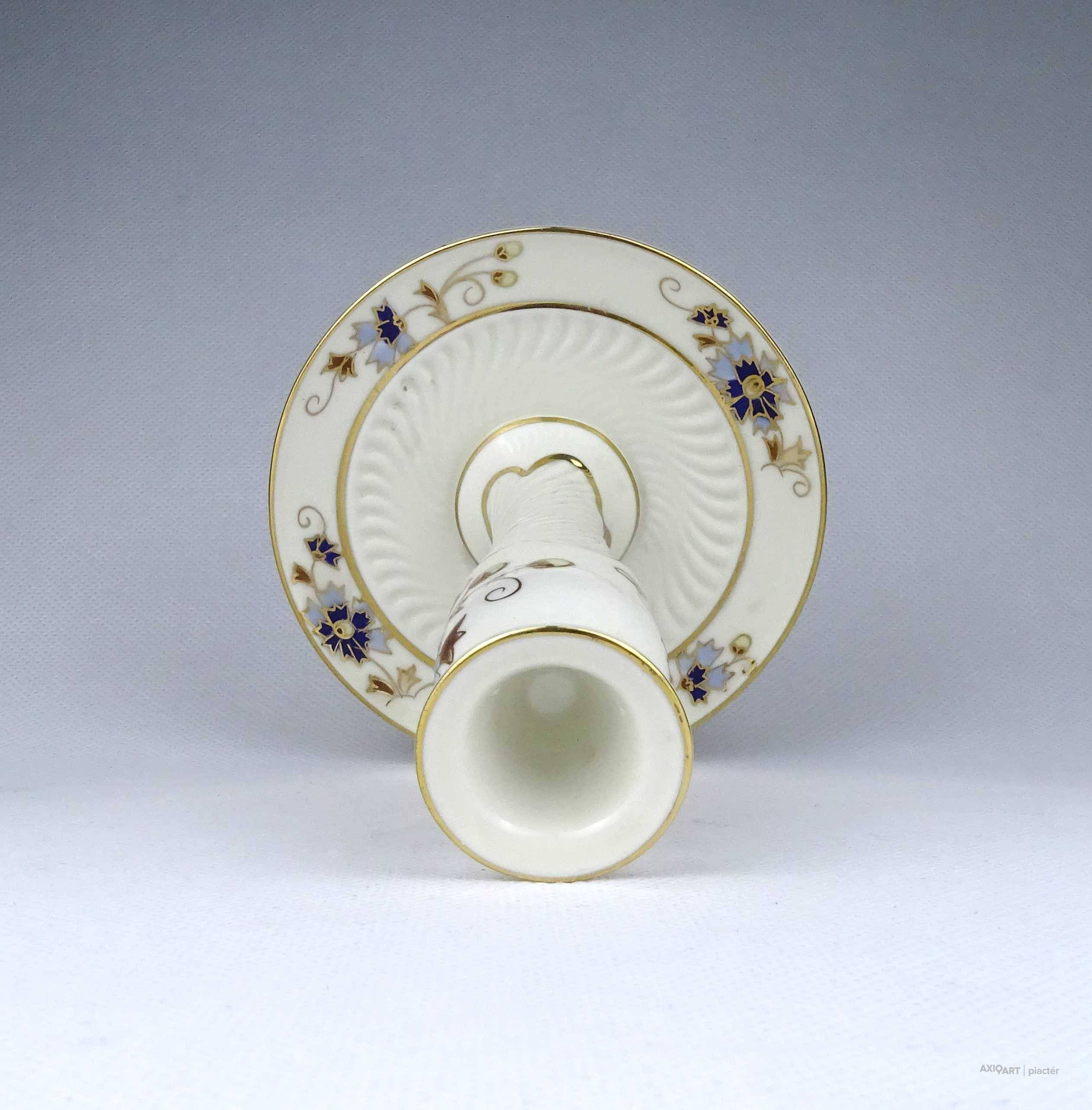 Hibátlan állapotú, vajszínű, aranyozással gazdagon díszített, búzavirág mintás Zsolnay porcelán talpas gyertyatartó.