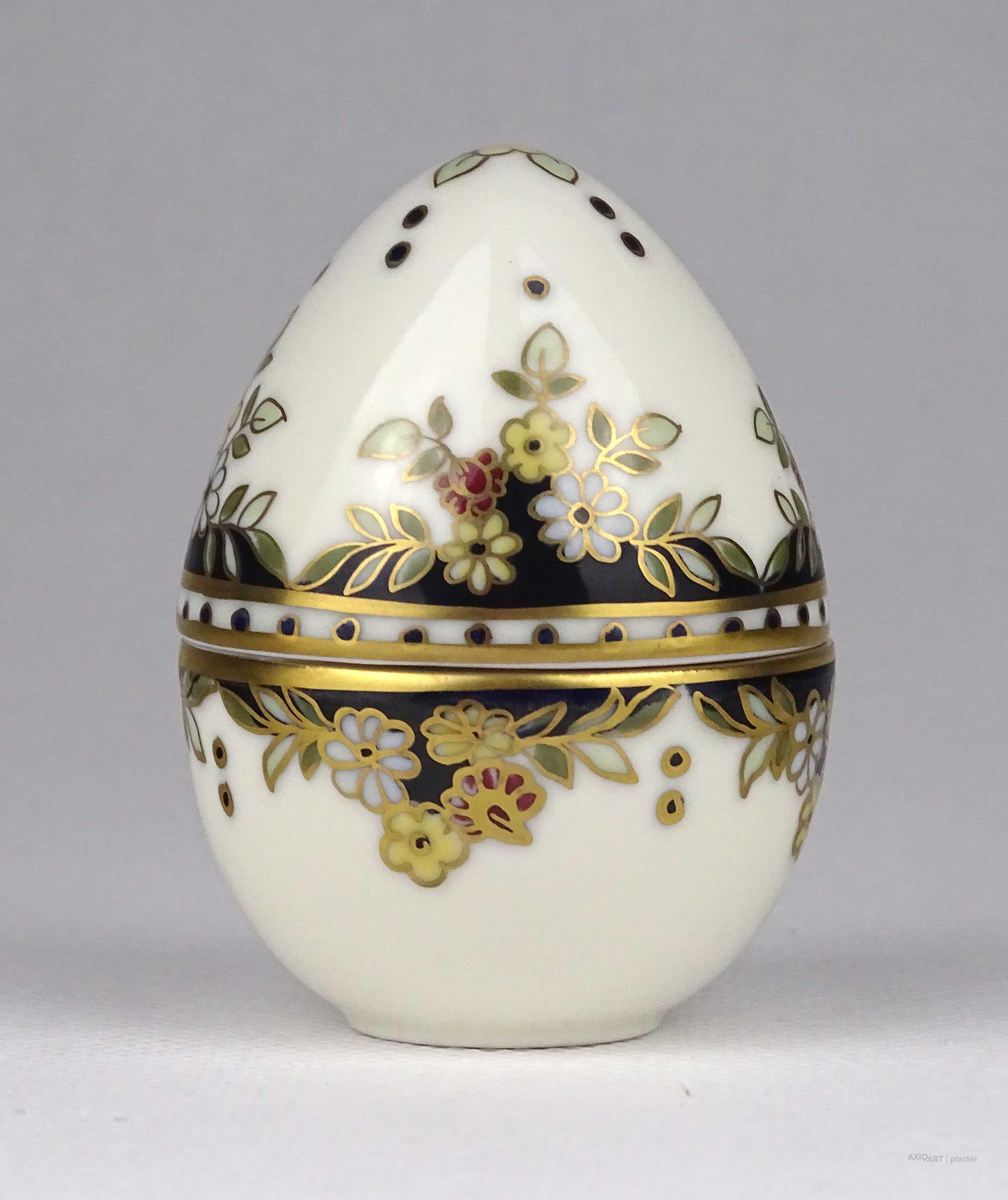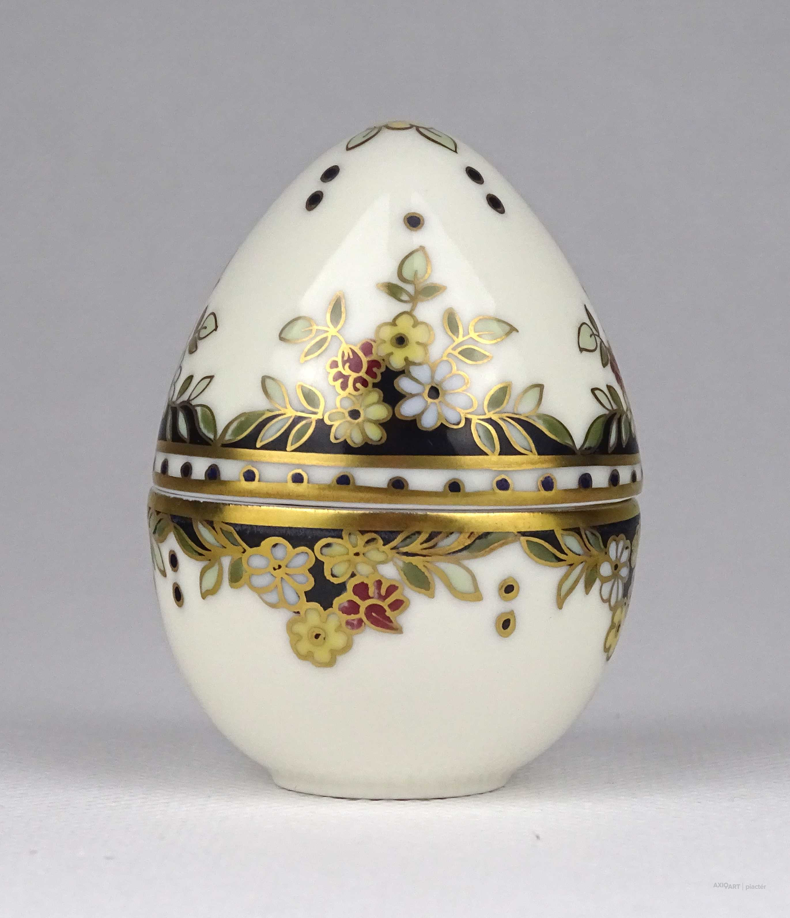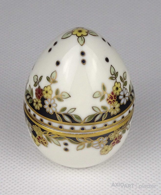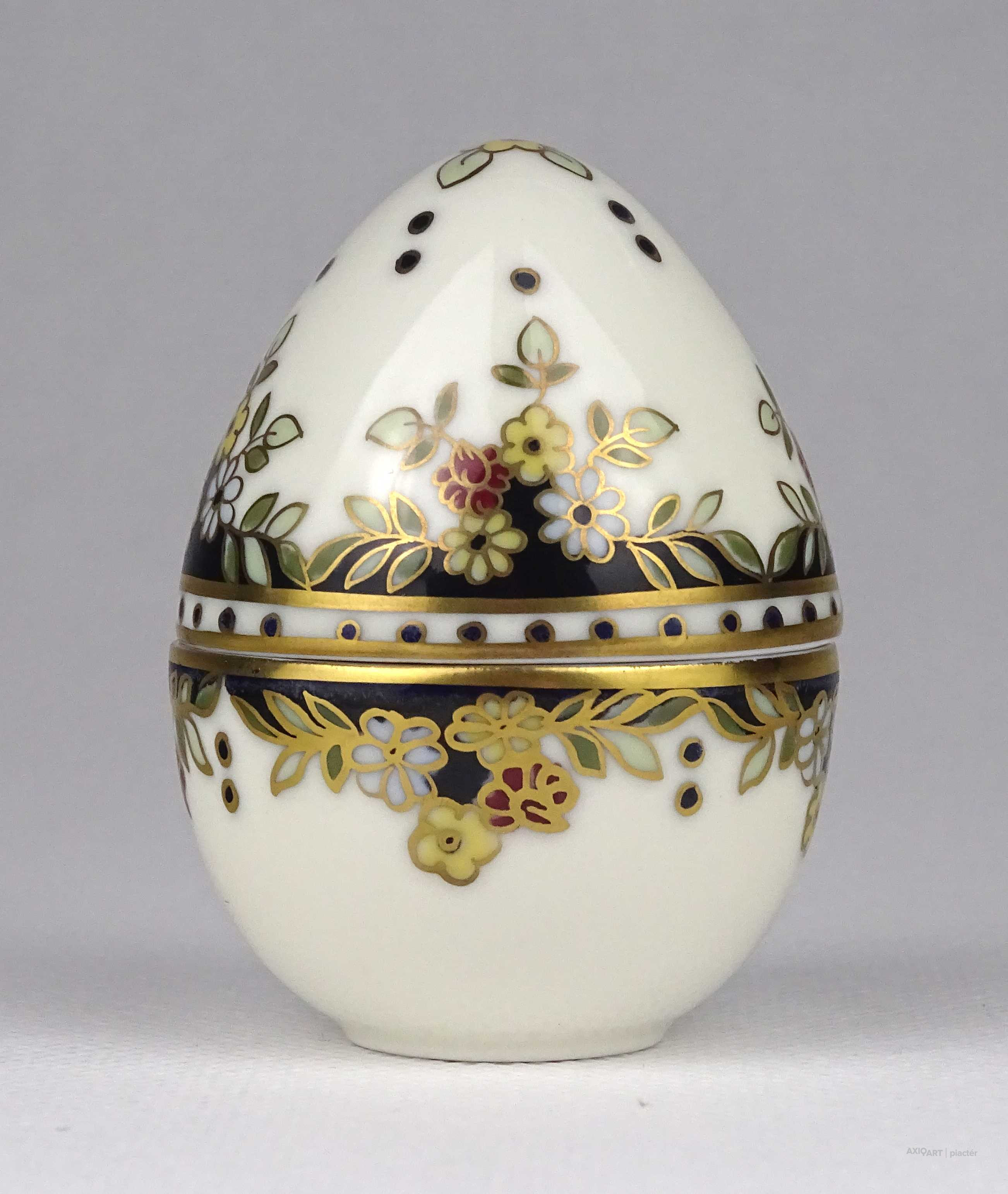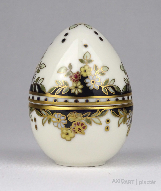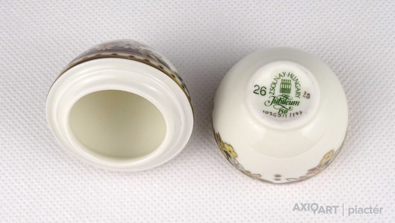 [1X600/Z022] Hibátlan állapotú, vajszínű, álló tojás alakú, különleges Sissy mintás Zsolnay porcelán gyűrűtartó, ékszertartó bonbonier. Alján zöld színű jubileumi Zsolnay öttornyú márkajelzés: ZSOLNAY HUNGARY JUBILEUM 150 Arannyal formaszám: 10369/II/144 Magasság: 6.6 cm Szélesség: 4.9 cm Súly: 0.07 kg