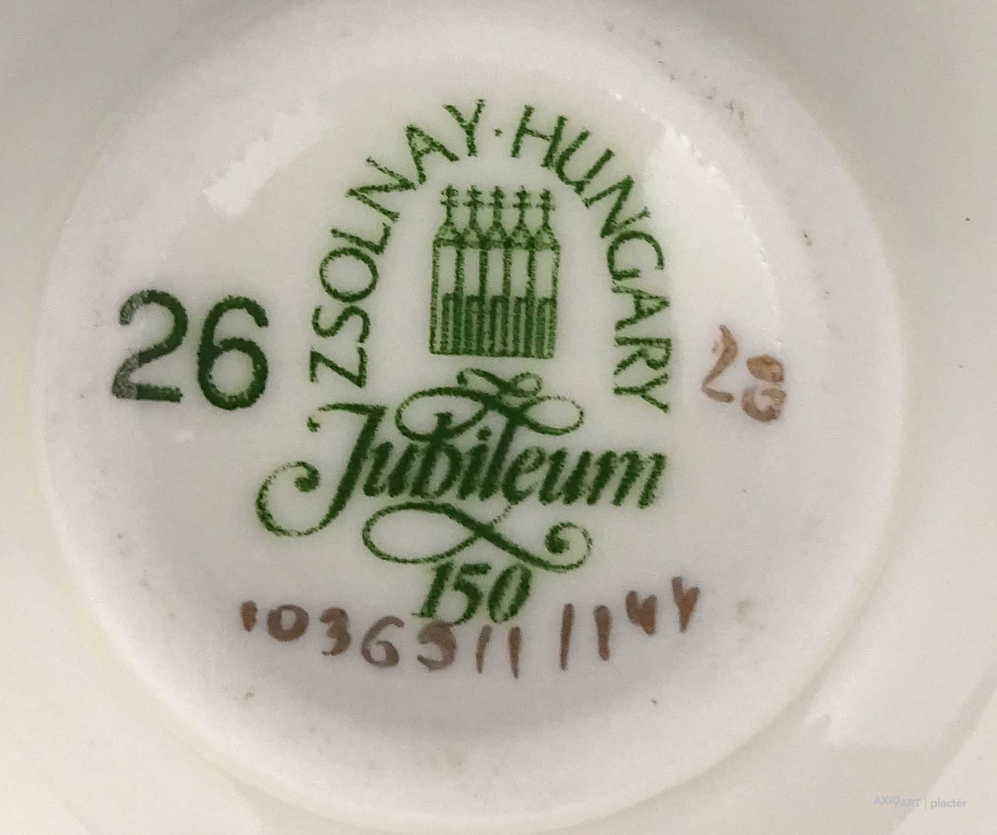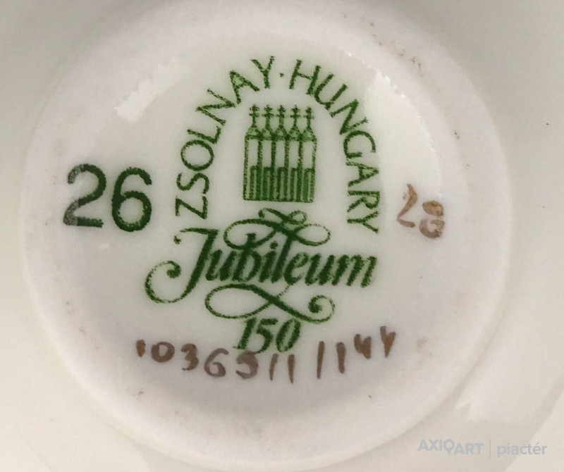 Alján zöld színű jubileumi Zsolnay öttornyú márkajelzés: