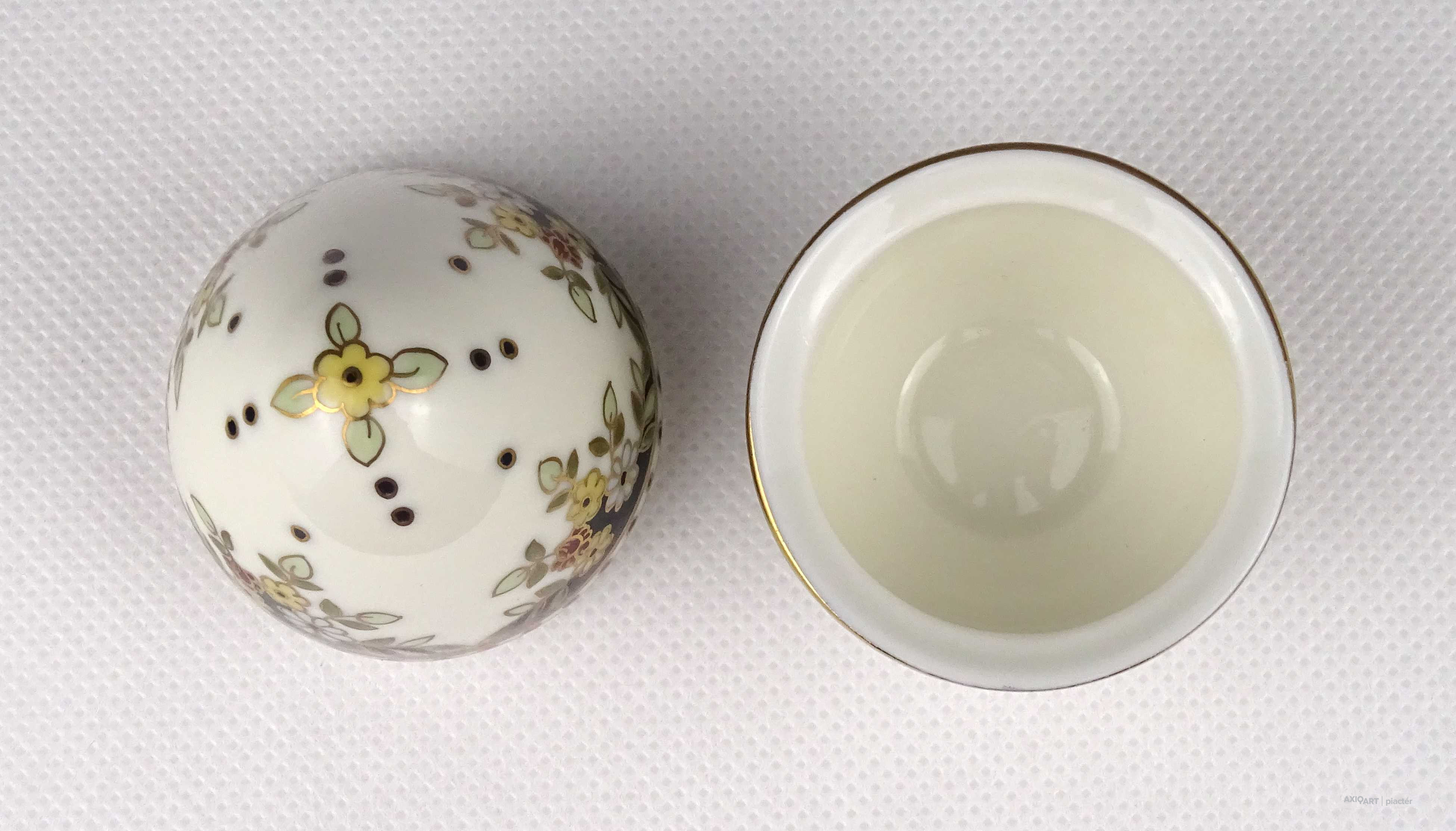 Hibátlan állapotú, vajszínű, álló tojás alakú, különleges Sissy mintás Zsolnay porcelán gyűrűtartó, ékszertartó bonbonier.