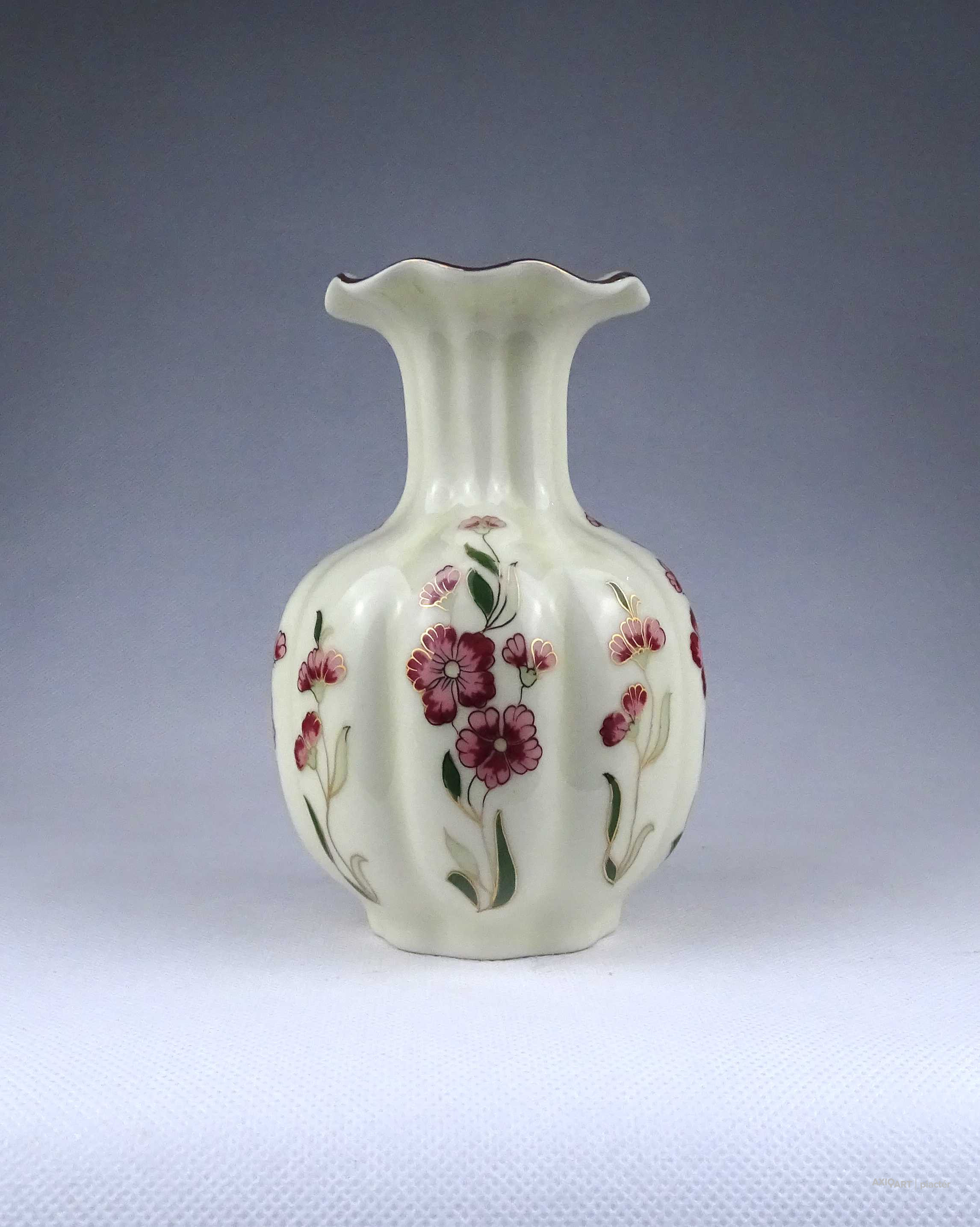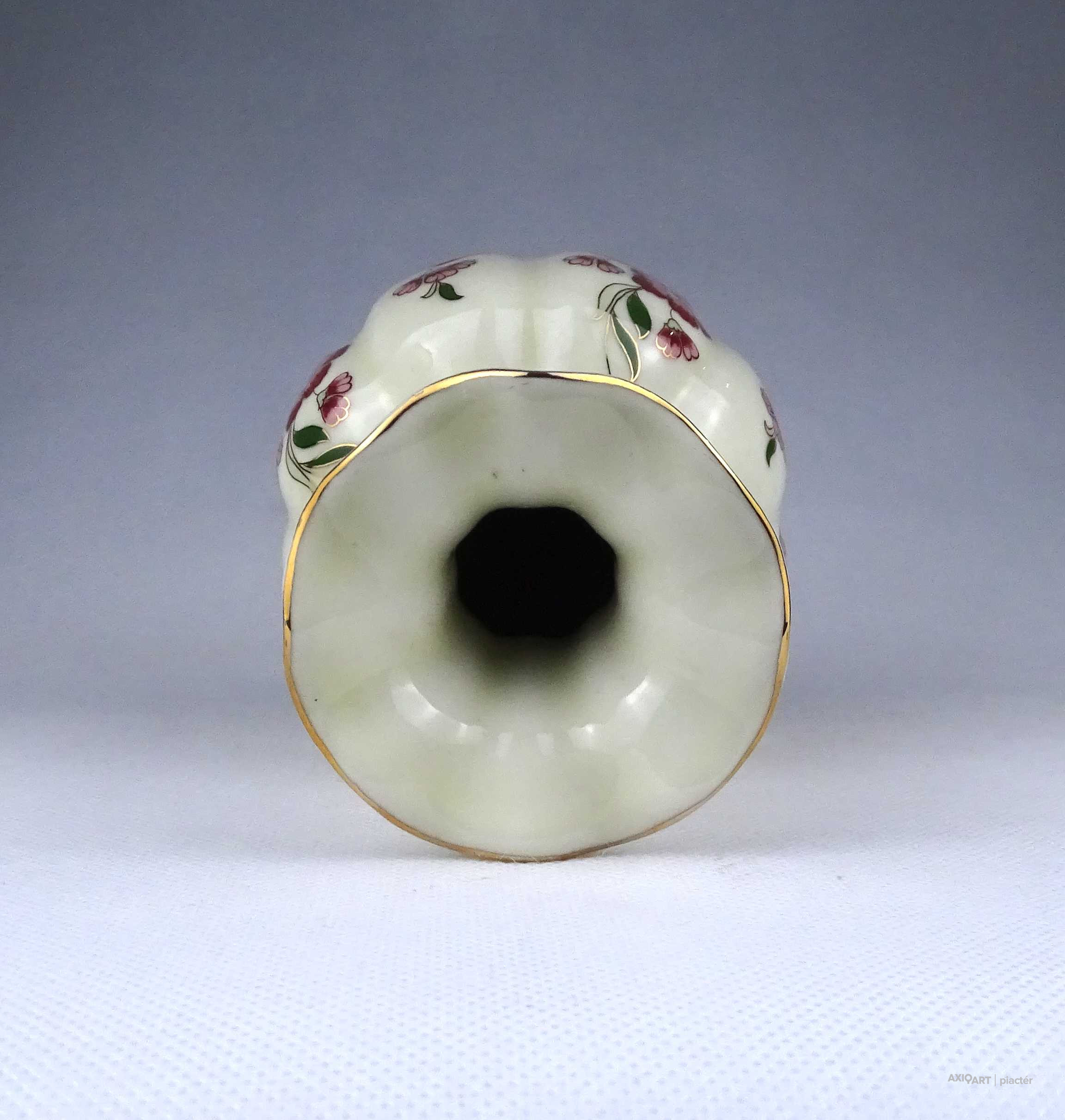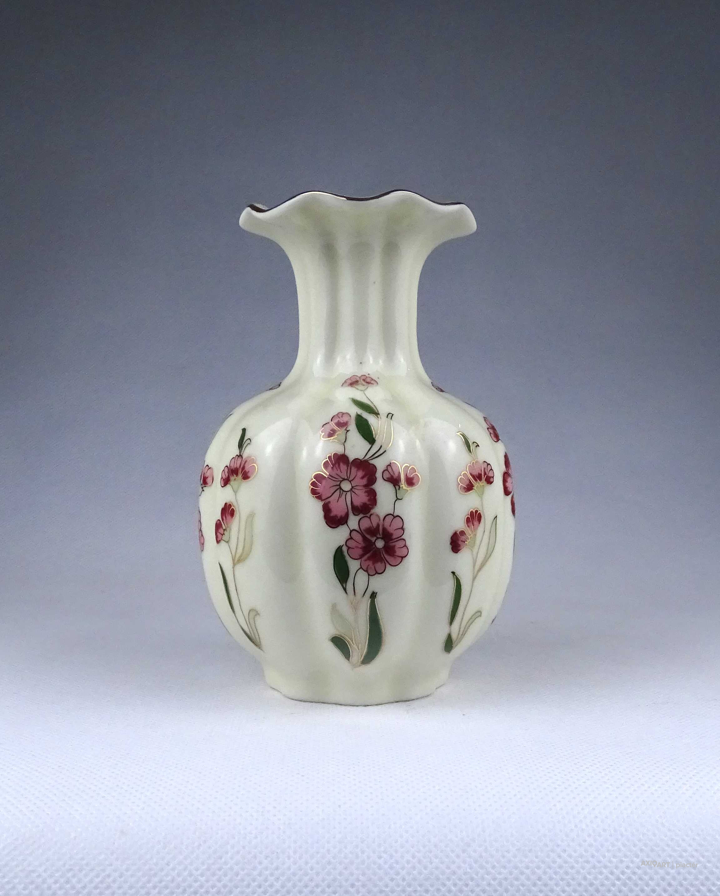 [1Z716/Z023] Hibátlan állapotú, aranyozással gazdagon díszített, vajszínű, virágmintás, gerezdes Zsolnay porcelán váza. Alján zöld Zsolnay öttornyú márkajelzés: ZSOLNAY HUNGARY 1868 PÉCS HAND-PAINTED Arannyal formaszám: 5219/69/53 Magasság: 15 cm Szélesség: 10 cm Súly: 0.4 kg