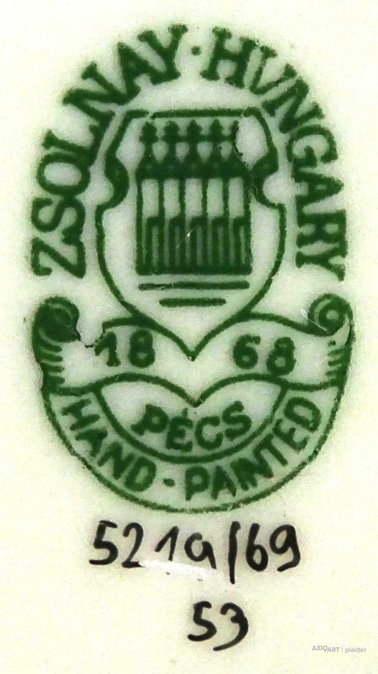 Alján zöld Zsolnay öttornyú márkajelzés: