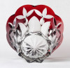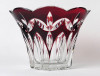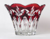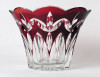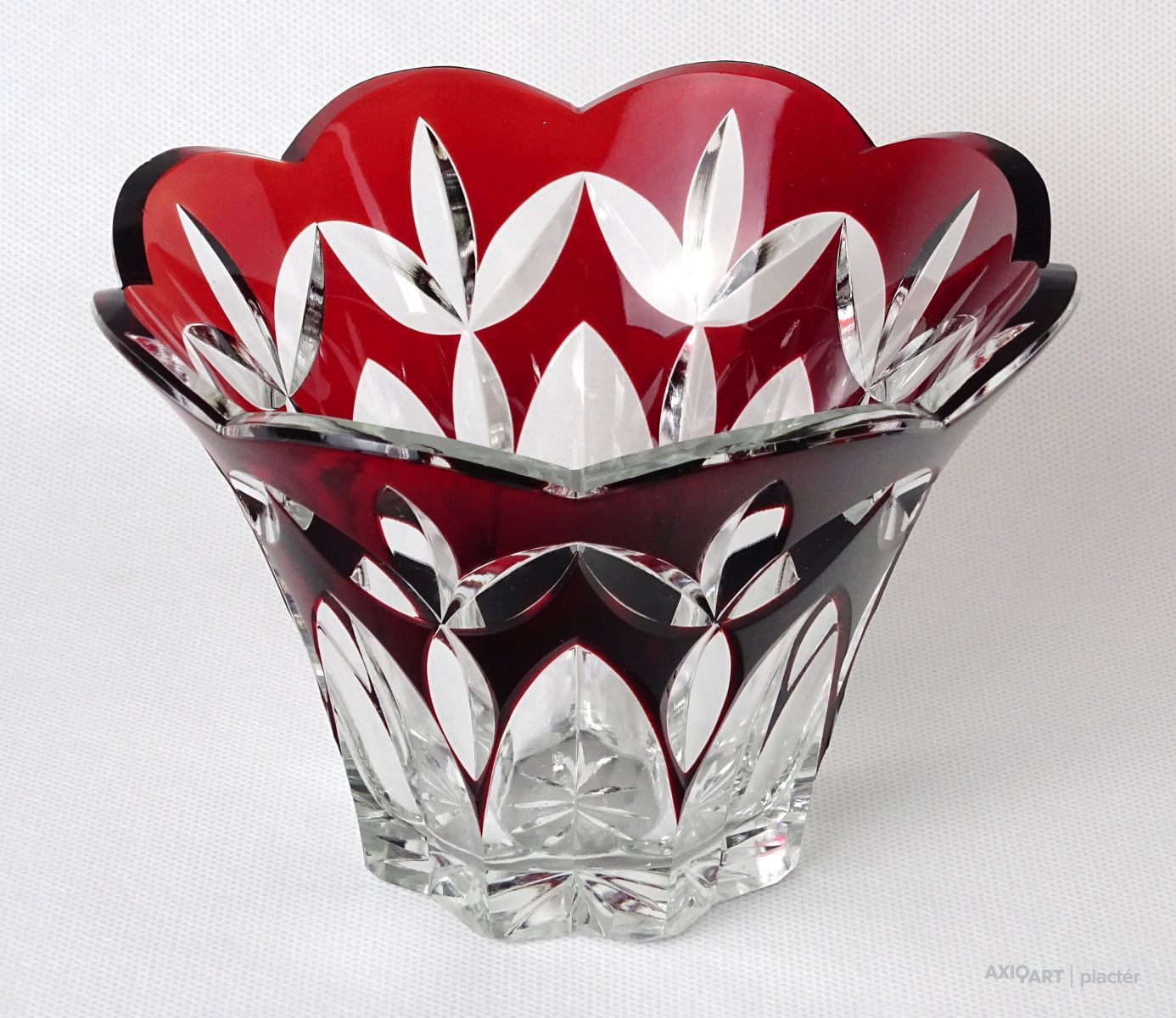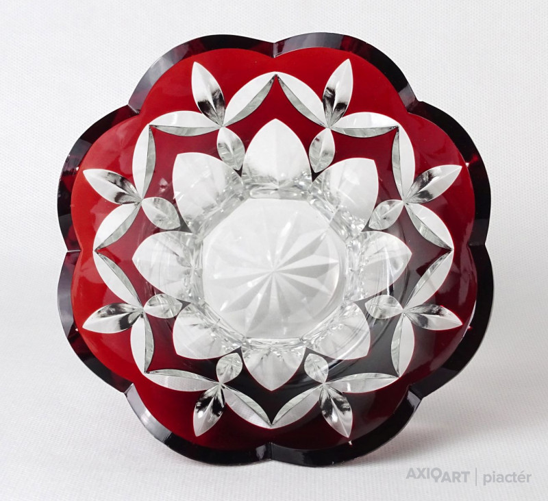 Szép állapotú színezett, rétegelt üveg asztali dísztárgy. Oldala nyolc lapra csiszolt, teteje fodros, oldala csiszolatokkal díszített.