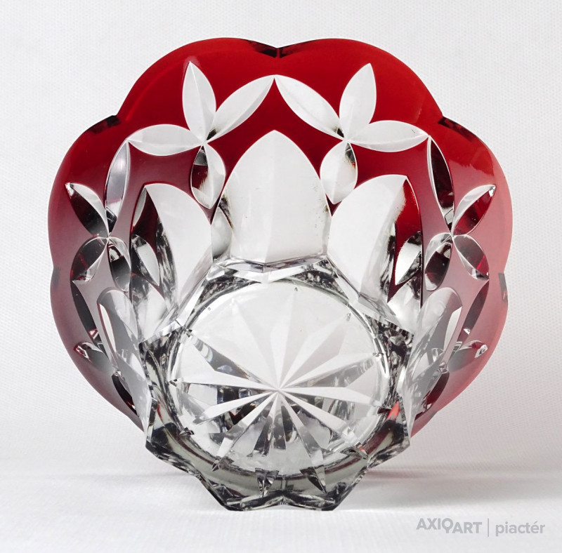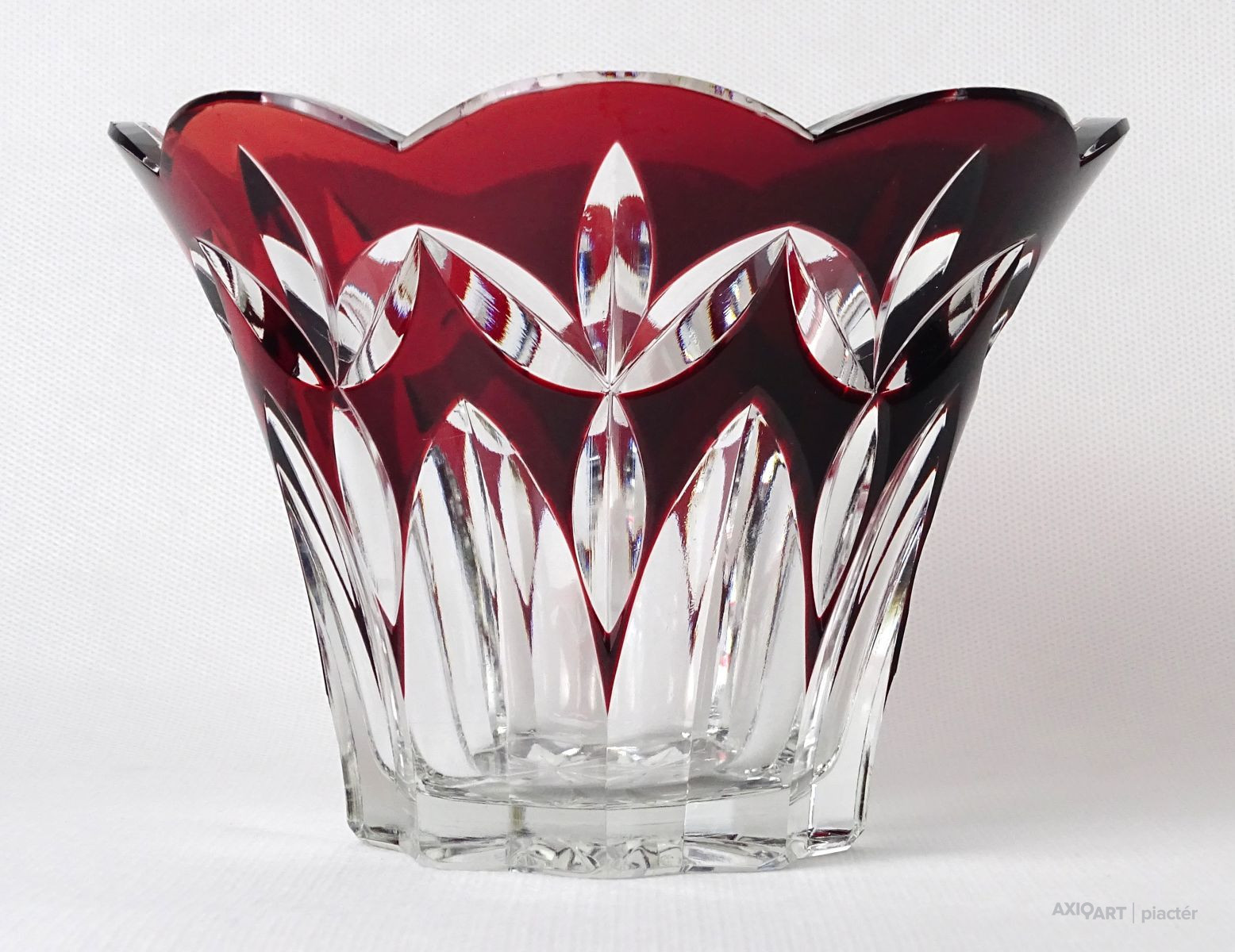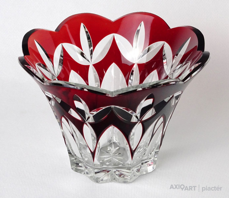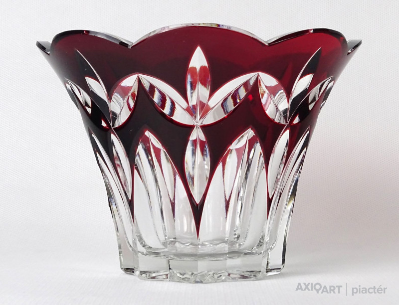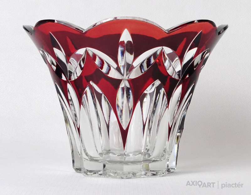 [1M344/X225] Szép állapotú színezett, rétegelt üveg asztali dísztárgy. Oldala nyolc lapra csiszolt, teteje fodros, oldala csiszolatokkal díszített. Magasság: 11 cm Szélesség: 15 cm Súly: 0.535 kg Val Saint Lambert Ugrás a navigációhozUgrás a kereséshez Val Saint Lambert kristályváza A Val Saint Lambert egy belga kristályüveggyártó , amelyet 1826 -ban alapítottak, és székhelye Seraing . II. Albert király királyi parancsával rendelkezik.     Előtörténet – Vonêche üveggyár  1795-ben , az első koalíció háborúja során, amely a Holland Köztársaság bukását idézte elő , Franciaország annektálta az akkor Dél-Hollandiát, amelyet ma Belgiumnak hívtak . A napóleoni háborúk idején 1802-ben Bonaparte Napóleon felkérte Henri D'Artigues francia iparost , hogy hagyja el a neves francia kristálygyártó Saint-Louis- t, és vásárolja meg a romos vonêche -i üveggyárat . Saint-Louis-hoz hasonlóan Vonêche is ólomkristályt gyártottüvegből, és tíz éven belül a francia birodalom legfontosabb kristálytermelőjévé vált. Az üzem sikerének két kulcsfontosságú munkása François Kemlin vegyész és Auguste Lelièvre mérnök volt. 1815-ben, miután Napóleon vereséget szenvedett a waterlooi csatában , Dél-Hollandia újra egyesült az új Holland Királyságban . Az újonnan kivetett importvámok következtében a vonêche-i gyár azonnal elvesztette francia piacának nagy részét. 1816-ban D'Artigues tárgyalt XVIII. Lajos francia királlyal, hogy megvásárolja a Verrerie de St Anne üveggyárat Baccarat városában , és átnevezte Verrerie de Vonêche à Baccarat névre – ezt a nevet 1843-ig tartotta. A belga forradalomAz 1830-as év azt jelentette, hogy a Vonêche üveggyár is elvesztette dél-holland piacának nagy részét, és ezért hamarosan bezárt.  Előzmények  1825-ben Kemlin és Lelièvre megvásárolta az egykori Val-Saint-Lambert apátságot Seraingban , Liège mellett , a Meuse folyó mellett . Ott alapítottak egy új üveggyárat (a mai napig működő, eredetileg nehéz ólomkristályra koncentrálva), amely kezdetben az egykori Vonêche üveggyár néhány kulcsfontosságú munkását alkalmazta. [1]A két alapító eleinte két házat épített magának, és a megszerzett egykori vonêche munkásoknak háztömböket épített. A hasonló, erősen vallásos munkaadókhoz hasonlóan ez a teljes életstílus-fejlesztési politika végül oda vezetett, hogy a cég több mint 200 házat épített a telken dolgozók elszállásolására, amely önkiszolgáló faluvá vált, ahol vegyesbolt, iskola és posta is volt; a helyi római katolikus templomot is kibővítették további hívők befogadására. Terveinek és gyártási folyamatainak minősége miatt a cég jól ismert márkát fejlesztett ki és terjeszkedett. Hazája, Belgium és Hollandia mellett a legnagyobb exportpiac az akkori cári uralma alatt álló Oroszország volt . 1876-ban a cég disztribúciós bázist nyitott New Yorkban , 1889-ben pedig a cég vezérigazgatója meglátogatta az üzletet, és bejárta a helyi versenytárs keleti parti gyárait. Ennek eredményeként a vezérigazgató Belgiumba való visszatérésekor jelentésében megjegyezte az amerikai üveg akkori kiváló minőségét és kristályvágóinak szakértelmét, amelyre a cég saját "fényes" sorozatának és kiváló minőségű vágásának kifejlesztésével reagált. [2]Az ebből eredő "fényes időszak" különösen Észak-Amerikában bővítette a cég hírnevét és piacát, így ma már jól ismert és gyűjtött ott szecessziós és art deco darabjairól. 1894-ben az antwerpeni világkiállításon a cég egy több mint 2 méter magas, 82 részből álló, 200 kilogramm tömegű vázát gyártott, amely ma is sértetlen, és jelenleg a liège-i Curtius Múzeumban látható. Ahogy a vállalat egyre sikeresebbé vált – az 1900–1914 közötti időszakban a csúcson, több mint 5000 dolgozót foglalkoztatott napi 120.000 üveg elkészítésével –, a cég más gyáraknak adott ki munkát, [3]később vagy megvásárolta őket, vagy új gyárakat nyit, köztük: Jemeppe (1883-1952); kettő Namur közelében (1879-1935); és Jambes (1880-1931, olajüveg lámpák gyártása).  A vállalat az I. világháború alatt leállította a termelést , majd a háború után az orosz forradalom után az oroszországi piac teljesen összeomlott, ami pénzügyi nehézségekhez és összezsugorodáshoz vezetett. Az Észak-Amerikába irányuló export megmentette a vállalatot, de ismét nehézségekbe ütközött a piac összeomlása az 1929-es Wall Street összeomlása után . A vállalat ezért bezárta a Jambes és két Namur gyárat, és stabil volt a második világháború idejére , amely során Belgium nagy részéhez hasonlóan a gyárat a náci Luftwaffe , valamint a szövetséges légierő ( RAF és USAAF ) bombázta.. A termelés kezdetben a kevésbé bombakárosult jemeppei gyárban indult újra, mígnem sikerült helyreállítani a gyártósorokat Seraingban, ami a Jemeppe gyár bezárásához vezetett az 1950-es években. Míg Seraing számos épületét felújították, a terület nagy része a 2. világháború utáni állapotban maradt egészen a 2000-es évek elejéig, amikor ezeket az elhagyott 19. századi épületeket kitakarították, hogy létrehozzák a modern acélvázas gyárat, a látogatóközpontot és a kis gyári boltot. amelyek ma is léteznek, az eredetileg helyreállított 19. századi gyárirodákkal együtt.    Forrás: wikipédia