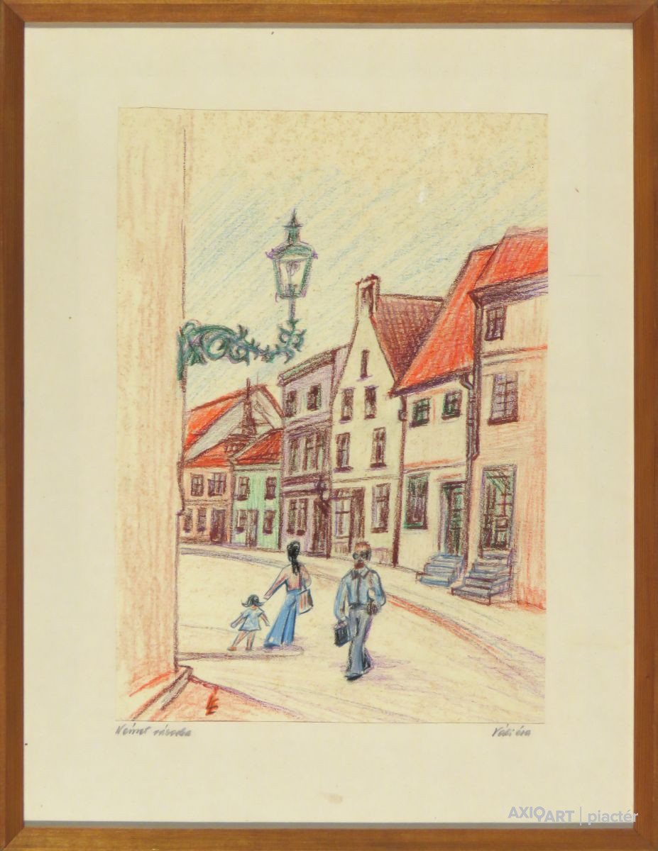 [FKC096/Bp302/94] A kép mérete: 38 x 26 cm keret nélkül. Készült: színes kréta, Papír A kép Váli Éva jelzéssel magyar művész 1970 körül alkotása. Jelezve jobbra lent "Váli Éva Német városka" A festmény jó állapotban van. Keret: Ép