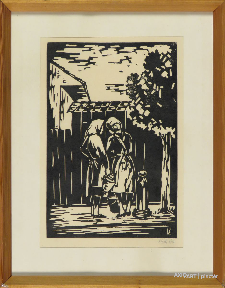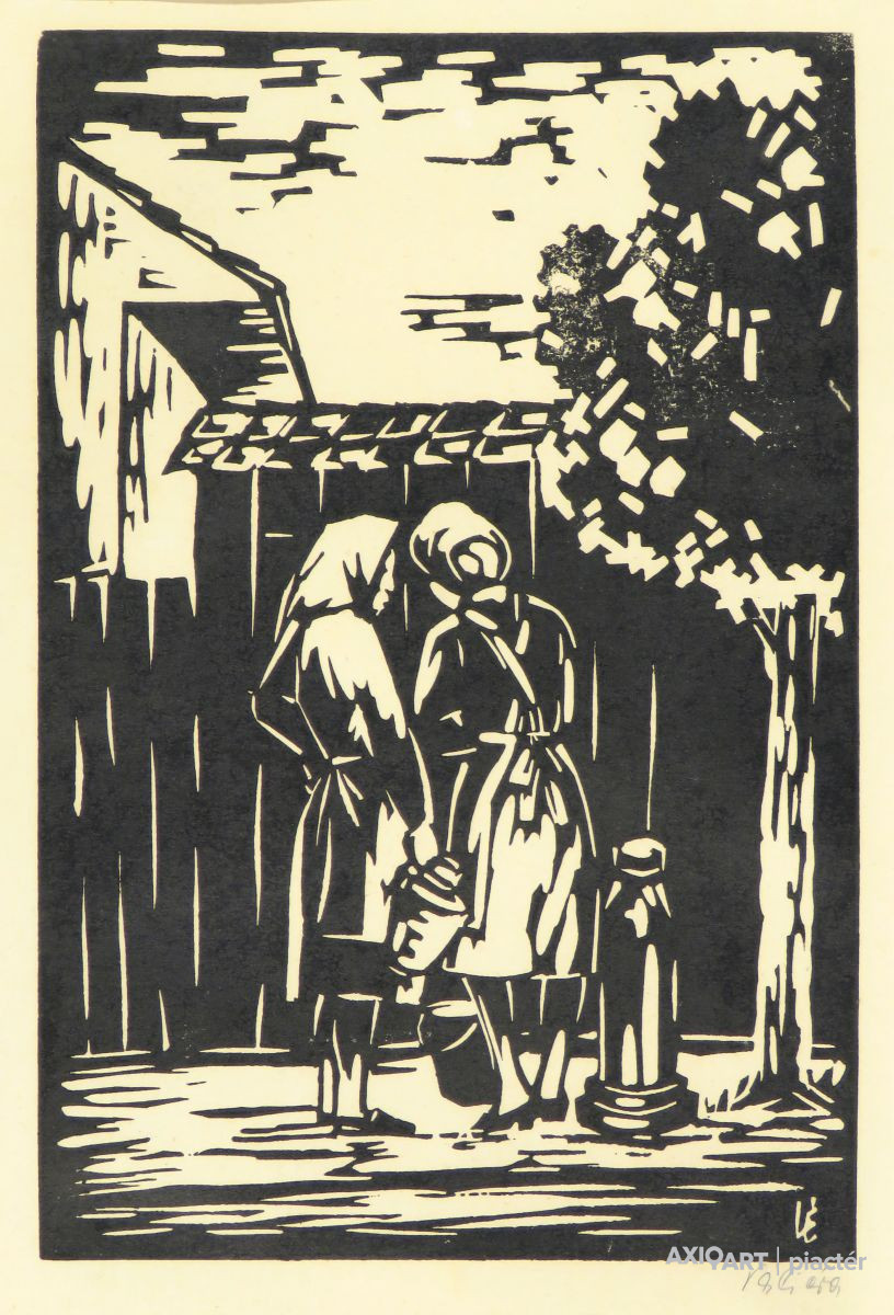 Váli Éva jelzéssel magyar művész 1970 körül : Utcai kútnál