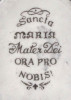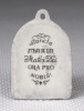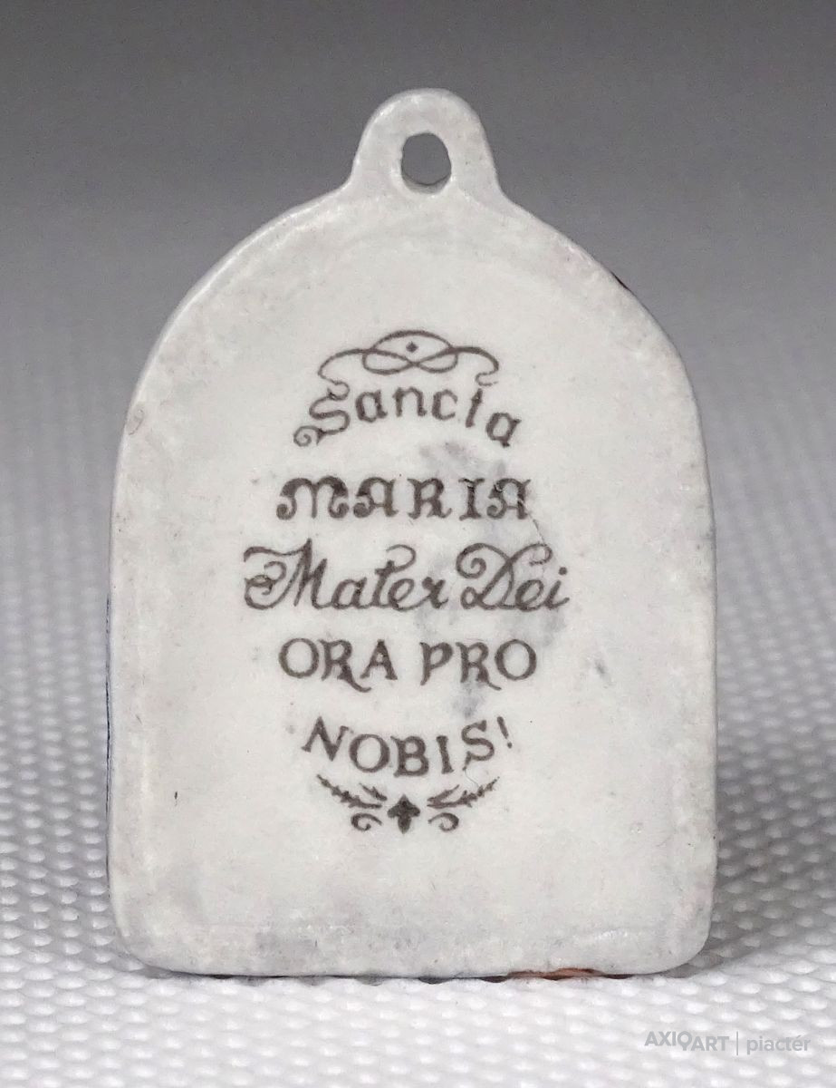 [1I882/FSZ] Hibátlan állapotú, kis méretű porcelán medál. Mária gyermekével. Akasztóval rendelkezik. Hátoldalán felirat: SANCTA MARIA MATER DEI ORA PRO NOBIS Szélesség: 2.4 cm Hosszúság: 3.5 cm Súly: 0.005 kg