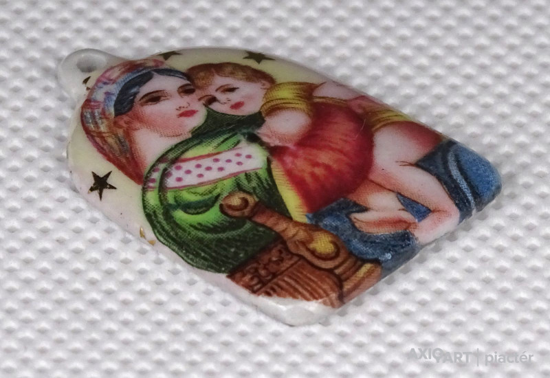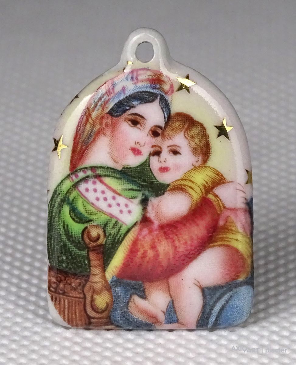 Hibátlan állapotú, kis méretű porcelán medál. Mária gyermekével. Akasztóval rendelkezik.