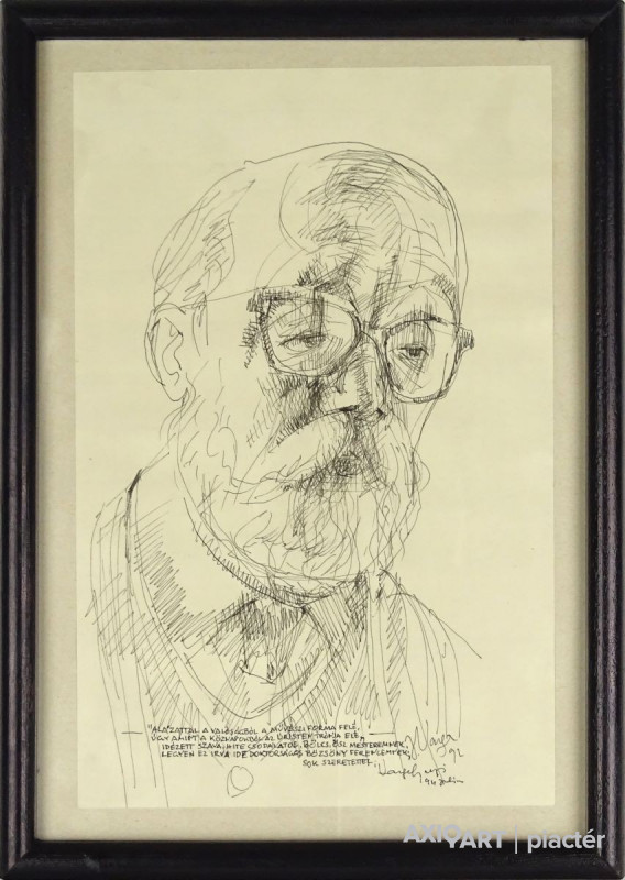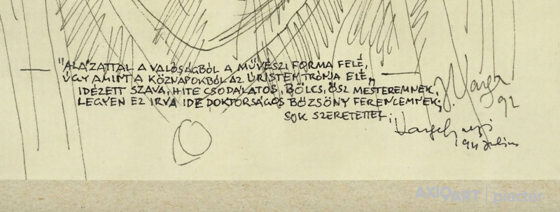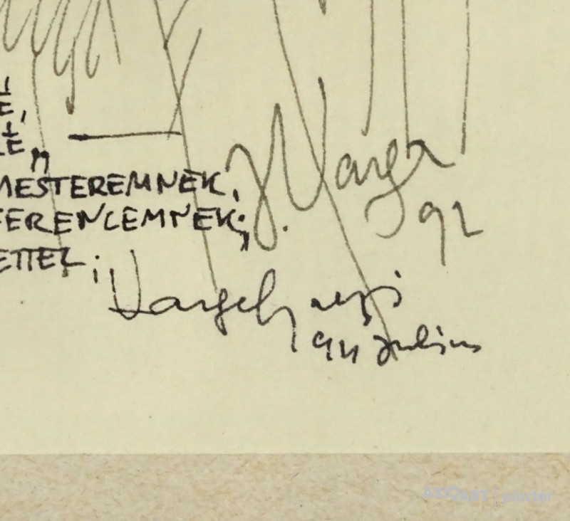 [1B354/X048/01] Papír tusrajz, üveglap mögött, fekete keretben. Datált jelzés jobbra lent: J. VARGA '92 Ajándékozási megjegyzés: "ALÁZATTAL A VALÓSÁGBÓL A MŰVÉSZI FORMA FELÉ, ÚGY AMINT A KÖZNAPOKBÓL AZ ÚRISTEN TRÓNJA ELÉ" IDÉZETT SZAVA, HITE CSODÁLATOS, BÖLCS, ŐSZ MESTEREMNEK LEGYEN EZ ÍRVA IDE DOKTORSÁGOS BŐZSÖNY FERENCEMNEK SOK SZERETETTEL: VARGA VARY JULIUS 94 Magasság: 25.5 cm Szélesség: 18 cm Súly: 0.285 kg Varga Gyula grafikus Budapest, 1935-03-24 hirdetés Névváltozat: Julius Vary-Varga Szerző: Sinóros Szabó Katalin 1949-53: Képző- és Iparművészeti Gimnázium 1953-59: Magyar Képzőművészeti Főiskola, mesterei: Koffán Károly, Ék Sándor, Raszler Károly, Barcsay Jenő. 1979 óta Kanadában él és dolgozik. Számos kanadai művészeti szervezet tagja. Művészetének alapvető témája az ember és a világegyetem kapcsolatának kutatása. Grafikái a nagy történelmi események (Mohács, II. világháború) és az irodalmi illusztrációk mellett a nagyvárosi lét, az ember és környezete együttélését mutatják be. Erőteljes, szimbolikus értékű fekete-fehér grafikáit újabban színesebb rézkarcok és olajfestmények egészítik ki. Nagyvárosi jeleneteit porcelántányérra (Anna Perenna porcelán) is felvitték. Irodalom Egyéni kiállítások Egyéni kiállítások 1965 • Fiatal Művészek Klubja, Budapest 1981 • Rozal Coach Fine Arts Gallery, Port Sandfield (CA) 1987 • Gibson House Museum, Toronto 1988 • Wilfrid Laurier University, Waterloo (CA). Művek közgyűjteményekben Művek közgyűjteményekben Forrás: artportal.hu