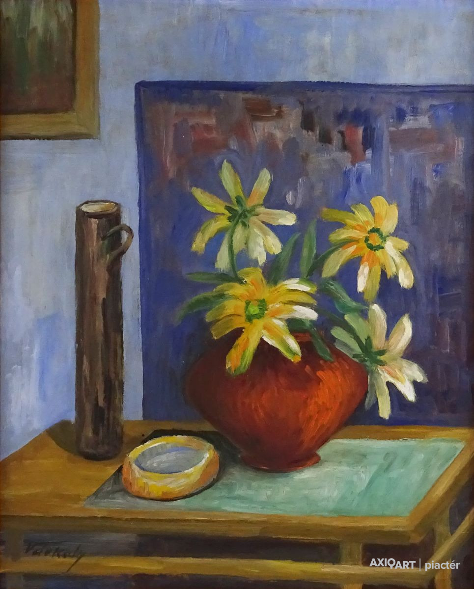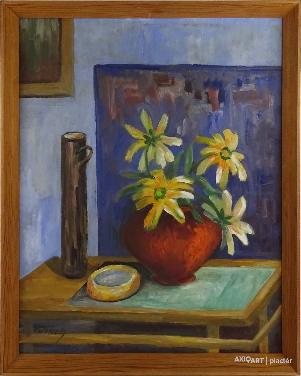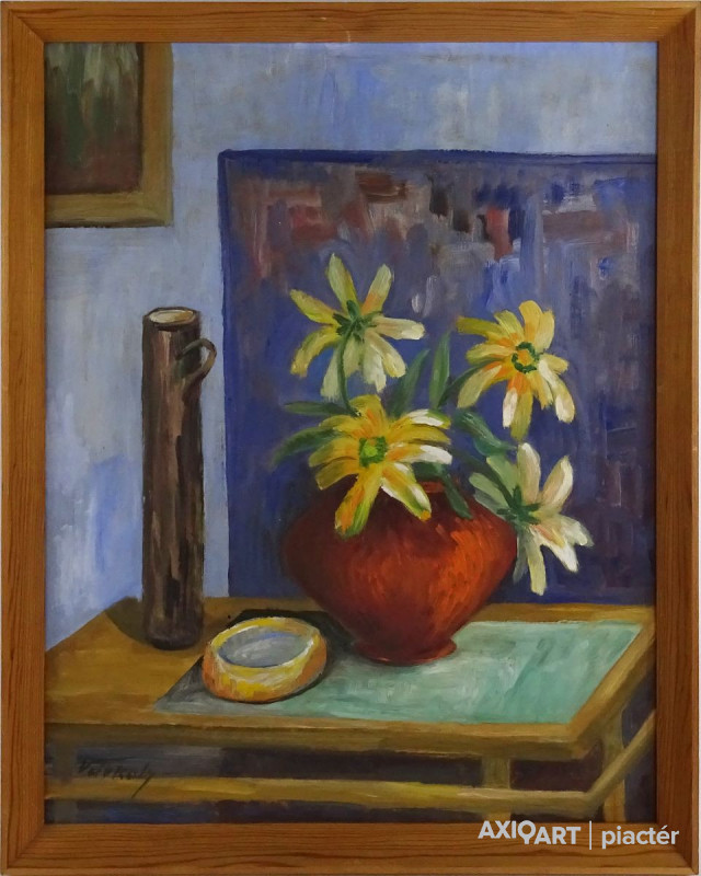 [FK2668/Bp301/4] A kép mérete: 50,5 x 80,5 cm keret nélkül. Készült: Olaj, Vászon A kép Moldován István (Kolozsvár, 1911) alkotása. Jelezve Jobbra lent "Moldován István" A festmény jó állapotban van. Keret: Ép A festmény hátoldalán a Képcsarnokvállalat raglapja láltható. Magyar festők és grafikusok életrajzi lexikona I-II. Festő. Tanulmányait Kolozsvárott, a Szépművészeti Főiskolán kezdte 1930-ban. A következő esztendőben a nagybányai Szépművészeti Iskolában Thorma János és Krizsán János korrektúráján képezte magát. 1931-ben a budapesti Képzőművészeti Főiskola hallgatója lett. Réti István, később Szőnyi István volt a mestere. Már mint főiskolás sok díjat és kitüntetést nyert. 1948-ban megkapta a római ösztöndíjat, de lemondva róla, Erdélybe ment. 1948-1950 között Erdélyben élt, és népművészetben gazdag vidékein festett. 1943-ban Kolozsvárott, 1946-ban Gyöngyösön, 1955-ben, 1959-ben és 1962-ben a Kulturális Kapcsolatok Intézetében, illetve a Csók Galériában rendezett egyéni bemutatókat. Ezen kívül több Európai országban, az USA-ban, Kanadában és Indiában is bemutatta munkáit. Eleinte sajátos atmoszférájú, lírai tájképeket, eleven színvilágú képmásokat festett, később mondernebb, erőteljesebben szerkesztett művekkel jelentkezett. A Pécsi Tanárképző Főiskola számára mozaikot készített. Erdély szerelmese volt. A székely népművészet gazdag formavilágának hatása döntő jelentőségűvé vált sokoldalú művészetében. Műv. díjak: a Szinyei Társaság elismerő oklevele, a Főváros festészeti-díja, "Kolozsvár a képzőművészetben" II. díj, állami ösztöndíj, római ösztöndíj, a Képzőművészek Szövetsége Észak-Magyarországi festészeti díja, SZOT festészeti díj. Több murális művet (mozaik) alkotott. A Magyar Nemzeti Galéria több alkotását őrzi. (M. L.: Műv. 1967/6, RI-NM) Magyar festők és grafikusok életrajzi lexikona I-II. Műgyűjtők és kereskedők kézikönyve Festő. Tanulmányait a kolozsvári Szépművészeti Főiskolán kezdte 1930-ban. A nagybányai szabadiskolában is megfordult. Itt Thorma János és Krizsán János korrektúráján képezte magát. 1931-ben Budapesten a Képzőművészeti Főiskola hallgatója lett. Réti István, később Szőnyi István volt a mestere. Már mint főiskolás sok díjat nyert. 1948-ban megkapta a római ösztöndíjat, de lemondva róla, Erdélybe ment. 1948-1950 k. Erdélyben élt, és népművészetben gazdag vidékein festett. 1943-ban Kolozsváron, 1946-ban Gyöngyösön, 1955-ben, 1959-ben és 1962-ben a Kulturális Kapcsolatok Intézetében, illetve a Csók Galériában rendezett önálló kiállítást. Ezen kívül több Európai országban, az USA-ban, Kanadában és Indiában is bemutatta műveit. Eleinte sajátos atmoszférájú, lírai tájképeket, eleven színvilágú képmásokat festett, később mondernebb, erőteljesebben szerkesztett művekkel jelentkezett. A Pécsi Tanárképző Főiskola számára mozaikot készített. Erdély szerelmese volt. A székely népművészet gazdag formavilágának hatása döntő jelentőségűvé vált sokoldalú művészetében. 1942-ben megkapta a Szinyei Társaság elismerését, és a Főváros festészeti-díjat,1943-ban elnyerte a "Kolozsvár a képzőművészetben" c. díjat. 1947-ben állami ösztöndíjat,1948-ban a római ösztöndíjat, 1972-ben a Képzőművészek Szövetsége Észak-Magyarországi festészeti díját kapta meg. A MNG több művét őrzi. (M. L.: Műv.-1976/6) Magyar festők és grafikusok adattára Tanulmányait Kolozsvárott a Képzőművészeti Főiskolán, majd Nagybányán Thorma János és Krizsán János irányítása mellett kezdte, 1931-től Budapesten megszakításokkal a Képzőművészeti Főiskolán Réti István és Szőnyi István növendékeként fejezte be. 1949-ben és 1950-ben ösztöndíjjal dolgozott Erdélyben, majd hosszú tanulmányutakra indult Nyugat-Európába, az Egyesült Államokba, s a Szovjetunióba. Először Kolozsvárott lépett a nyilvánosság elé 1943-ban, majd 1946-ban Egerben és Gyöngyösön, 1947-ben Miskolcon, 1948-ban Hatvanban, 1955, 1961 és 1981-ben a Csók Galériában, 1959-ben a KKI-ben, 1960-ban Nagykanizsán, 1963-ban Kiskunfélegyházán, 1966-ban Debrecenben, 1969 és 1975-ben Békéscsabán, 1971-ben a Mednyánszky Teremben, 1973-ban Gyöngyösön és Debrecenben, 1977-ben Egerben, 1979-ben Veszprémben, 1983-ban Miskolcon, 1984-ben Csepelen, 1986-ban a Vigadó Galériában rendezett önálló kiállítást. Külföldi kiállításai: Moszkva, Varsó, India, Szófia, Párizs, Bukarest, Belgrád, New York, Montreál és Toronto. Eddig közel kétezer színes táblaképet festett, de szívesen foglalkozik mozaikkészítéssel is. 1964-ben a Pécsi Pedagógiai Főiskola, 1968-ban a Salgótarjáni Kórház, 1969-ben a názáreti templom és 1970-ben a Videoton Vállalat díszterme részére mozaikot készített. - Erdély szerelmese. A székely népművészet gazdag formavilágának hatása döntő jelentőségűvé vált festészetében. Olyan formanyelvet alakított ki magának, amely színvilágában és summázó formaalakításában sajátos erdélyi zamat érződik, ugyanakkor korszerűen modern is konstruktivista stílusa. Munkásságát 1942-ben a Szinyei Társaság elismerésével és a Fővárosi festészeti-díjjal, 1943-ben Római-ösztöndíjjal, 1947-ben Állam ösztöndíjjal (Románai), 1963-ben a SZOT festészeti-díjával, 1972-ben a Képzőművészek Szövetsége Észak-Magyarországi festészeti-díjával tüntették ki. - Irod.: Bíró Béla: Kolozsváry Moldován István. Erdélyi Helikon, 1943.; Felvinczi Takács Zoltán: Kolozsváry Moldován István. Kolozsvár, 1943.; Dutka Mária: Magyar Nemzet, 1961.; Maksay László: Moldován István. Művészet, 1965.; D. Fehér Zsuzsa. Moldován István, Bp. 1971.; Theisler G