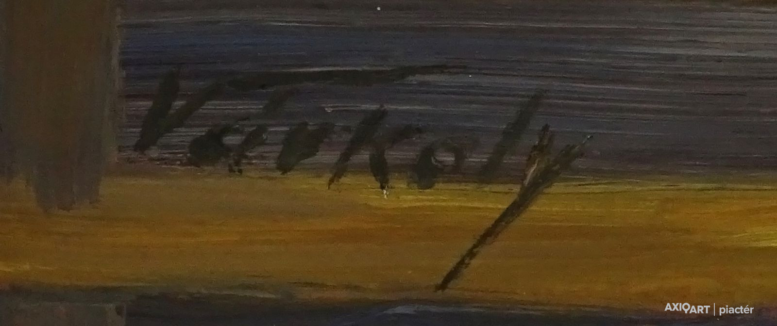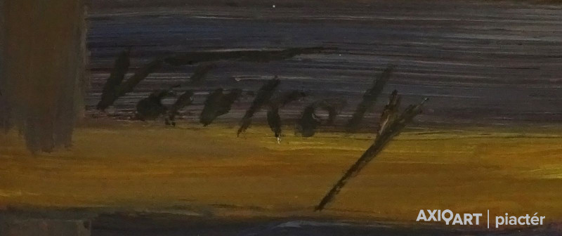 [FK3264/FL-4] A kép mérete: 31,5 x 70,5 cm keret nélkül. Készült: Olaj, tempera, Farostlemez A kép Kurucz D. István (Hódmezővásárhely, 1914, Budapest, 1996) alkotása. Jelezve Jobbra lent "Kurucz 977" A festmény jó állapotban van. Keret: Ép A festmény hátoldalán a Képcsarnokvállalat raglapja látható. Magyar festők és grafikusok életrajzi lexikona I-II. Festő, grafikus. Vásárhelyről, ahol Darvasy István festőművész figyelt fel tehetségére, került Szőnyi István magániskolájába. A fővárosi Képzőművészeti Főiskolának, ahol Rudnay Gyula, Réti István, Benkhard Ágost, Szőnyi István voltak a tanítómesterei 1940-ig volt a tanítványa. A monumentális festészetet Nagy Sándor tanította. Tanulmányúton járt több kelet- és nyugat-európai államban, Mongóliában, Japánban, Algériában. 1940-ben Hódmezővásárhelyen telepedett le, 1943-1947 között bekapcsolódott szülővárosa művészeti és közéletébe. A Vásárhely Népe c. lap munkatársa volt. 1949-59 között Szőnyi tanársegédjeként freskótechnikát tanított a főiskolán. 1951-52-ben megszervezte a Honvédségi Képzőművészeti Stúdiót, majd kinevezték a Honvéd Képzőművészeti Iskola igazgatójának. A vásárhelyi iskola reprezentáns egyéniségeként jelentős szerepe volt a Vásárhelyi Őszi Tárlatok elindításában. Megszervezete és vezette a Mednyánszky Társaságot, s haláláig művészeti vezetője volt a Hajdúböszörményi Nemzetközi Művésztelepnek. Évekig elnöke volt a Hortobágyi Alkotótábornak. Az alföldi parasztok életét megörökítő képei a falképek összefoglaló stílusában a népi realizmus és a dekoratív sommázás szellemében készültek. Számos falképet festett (Kossuth Akadémia, hódmezővásárhelyi iskola, stb.). 1941-től számos kisebb-nagyobb egyéni kiállítása volt, bemutatkozott több hazai és külhoni városban. 1941-től minden jelentősebb országos rendezvény és a magyar művészek külföldi bemutatóinak résztvevője. Rendszeresen szerepelt a Vásárhelyi Őszi Tárlatokon, a Hatvani Tájkép és Portrébiennálékon, a Szegedi Nyári Tárlatokon. Képei bemutatásra kerültek a vásárhelyi iskola jubileumi rendezvényein. 1962-ben több alkotásával szerepelt a Velencei Biennálén. Díjak: SZOT-díj, Munkácsy-díj, Érdemes és Kiváló Művész kitüntetés, Tornyai-plakett, római ösztöndíj, a Munka Érdemrend arany fokozata, Káplár Miklós-díj és emlékplakett, Kossuth-díj. Művei megtalálhatók minden jelentősebb hazai, több olasz és japán közgyűjteményben. (ML, D.J.: Műv. 1985/5, Tasnádi Attila adatközlése nyomán, L.L.: Műv. 1983/3) Magyar festők és grafikusok életrajzi lexikona I-II. Műgyűjtők és kereskedők kézikönyve Festő, grafikus. Vásárhelyről, ahol Darvasy István festőművész figyelt fel tehetségére, került Szőnyi István magániskolájába. A fővárosi Képzőművészeti Főiskolának, ahol Rudnay Gyula, Réti István, Benkhard Ágost, Szőnyi István voltak a tanítómesterei 1941-ig volt a növendéke. A monumentális festészetet Nagy Sándor tanította. Egy ideig tanársegédként működött Szőnyi mellett. Több ízben járt Itáliában tanulmányúton. Évekig művészeti vezetője volt a Hajdúböszörményi Nemzetközi Művésztelepnek. Az alföldi parasztok életét megörökítő képei a falképek összefoglaló stílusában a népi realizmus és a dekoratív sommázás szellemében készülnek. A II. világháború alatt szerepet vállalt a Szocialista Képzőművészek Csoportjának akcióiban. 1949-1960 k. a Képzőművészeti Főiskola falképtanszékének tanára volt. Több falképet festett (Kossuth Akadémia, hódmezővásárhelyi iskola, stb.). 1962-ben több alkotásával szerepelt a Velencei Biennálén, SZOT-díjas, Munkácsy-díjas, érdemes és kiváló művész kitüntető elismerésében részesült. (ML, D.J.: Műv.-1985/5, L.L: Műv.-1983/3) Magyar festők és grafikusok adattára Tanulmányait a Képzőművészeti Főiskolán végezte, ahol Rudnay Gyula és Réti István voltak a mesterei. 1941-1943-ban ösztöndíjas Rómában. 1943-1947 között Hódmezővásárhelyen dolgozik, egyidejűleg a Vásárhelyi Hétfő c. hetilap szerkesztője. 1949-1960 közötti években a budapesti Képzőművészeti Főiskola freskó tanszékének tanára. Az 1940-es évek eleje óta kiállító művész. 1962-ben a Velencei Biennálén állították ki műveit. 1970-ben Csók István Galériában volt kiállítása. A Vásárhelyi Őszi Tárlatok és a Szegedi Nyári Tárlatok rendszeres kiállító művésze. Az alföldi festészet egyéni hangú továbbfejlesztője. Táblaképeket, freskókat és kerámia falképeket alkot. Munkácsy-díjas, érdemes és kiváló művész kitüntető elismerésében részesült. A SZOT a legelső képzőművészek közt, 1962-ben tüntette ki díjával. A 70. születésnapját ünneplő művész 1984 decemberében életmű kiállítást rendezett műveiből a hódmezővásárhelyi Tornyai János Múzeumban. 1986-ban a budapesti Hollósy Galériában nyílt kiállítása. - Irod.: Szij Rezső: Kurucz Dezső István festőművész. Bp. 1967.; Kulcsár Ödön: SZOT-díjasok. Bp., 1981.; Lóska Lajos: Mindig freskót szerettem volna festeni. Beszélgetés Kurucz Dezső Istvánnal. Művészet, 1984. 3. Művészeti lexikon I-IV. Festő, Munkácsy-díjas. A Képzőművészeti Főiskolán Rudnay Gyula, Réti István, Benkhard Ágost, Szőnyi István növendéke volt 1934-40 között. Több ízben járt külföldi tanulmányúton. Az alföldi parasztok életét megörökítő képei a falképek összefoglaló stílusában a népi realizmus és a dekoratív sommázás szellemében készülnek. 1949-60 között a Képzőművészeti Főiskola falképtanszékének tanára volt. Több falképet festett (Kossuth Akadémia; Hódmezővásárhely, iskola, pápai pártház, 1965). Legutóbb 195