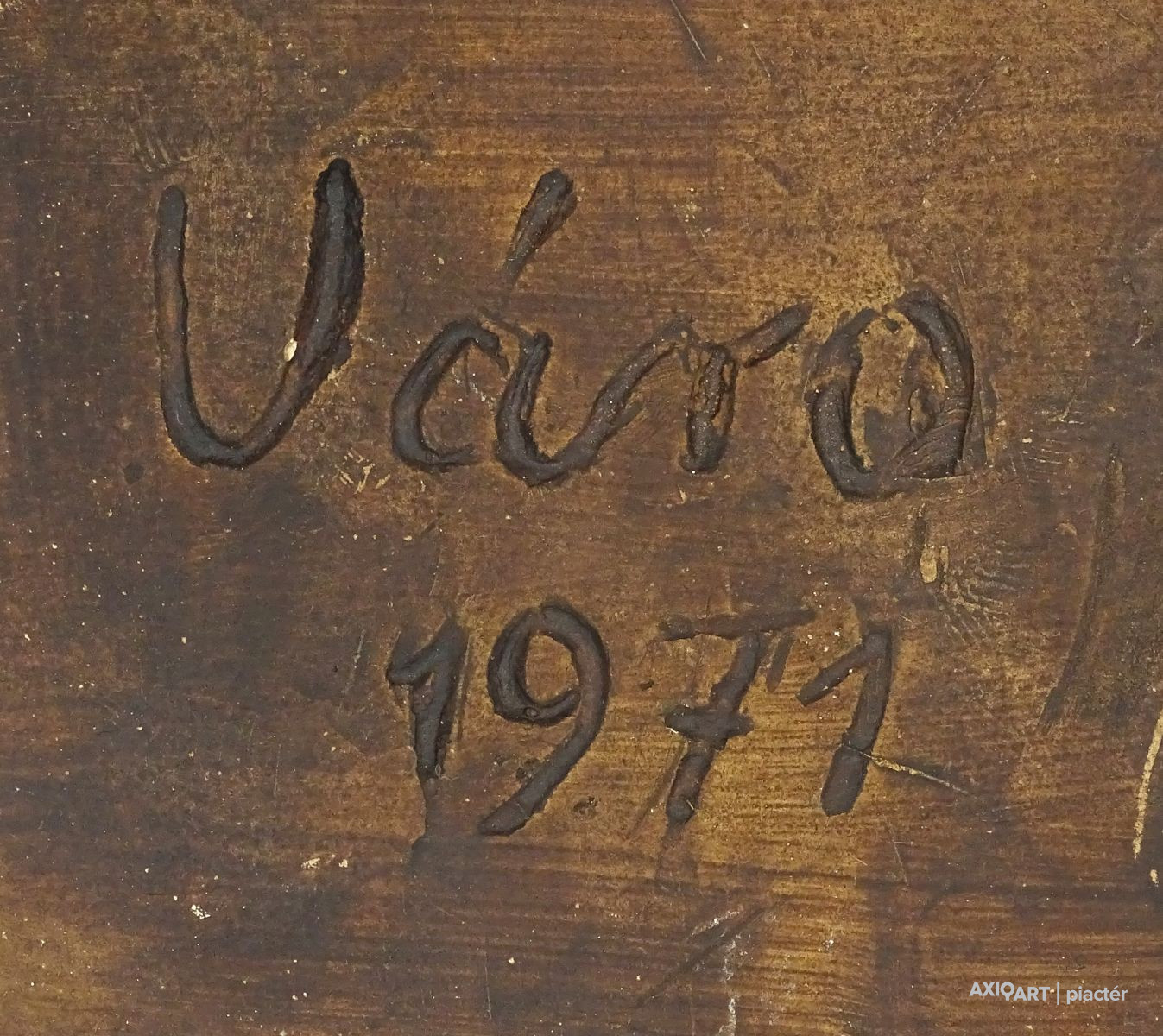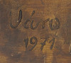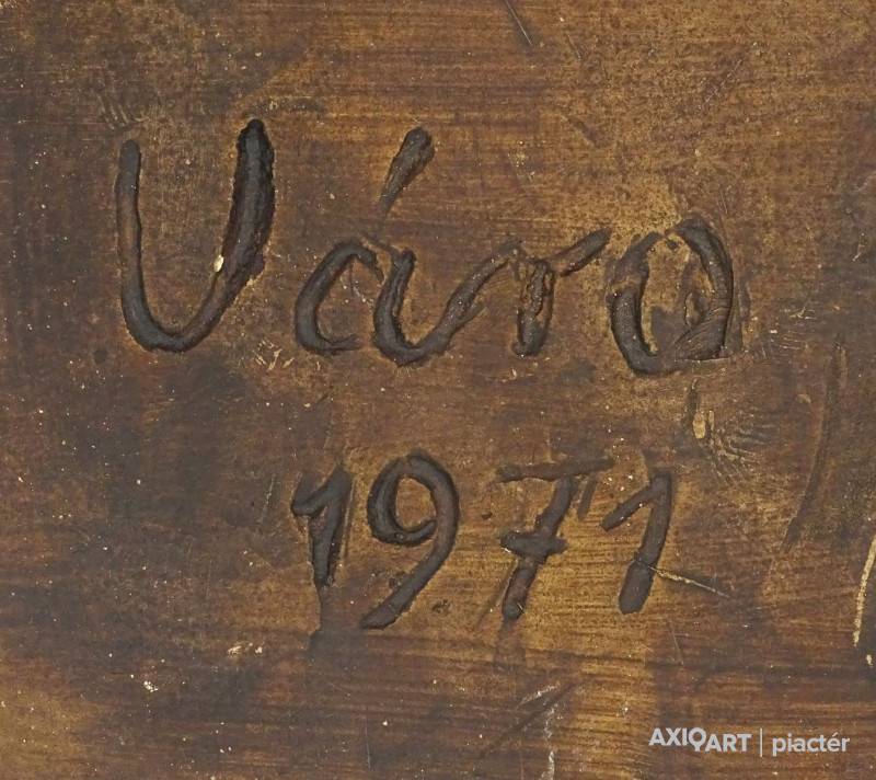 [1Y029/Z018] Olaj farost festmény, üveglap mögött, hibátlan képcsarnokos keretben. Hátoldalán Képcsarnok Vállalat papír címkéje: A művész neve: SCHÉNER MIHÁLY A kép címe: TÁJ Magasság: 66.5 cm Szélesség: 86 cm Súly: 6.54 kg Schéner Mihály festő, grafikus, szobrász, keramikus, bábtervező Medgyesegyháza, 1923-01-9 Elhalálozott: Budapest, 2009. május 11. Honlap: http://www.kormendigaleria.hu/kiadvany.html 1942-1947: Magyar Képzőművészeti Főiskola, tanára: Rudnay Gyula. 1978: Munkácsy-díj; 1984: érdemes művész; 1989: kiváló művész; 1995: Kossuth-díj. 1992-től a Magyar Művészeti Akadémia, 1993-tól a Széchenyi Irodalmi és Művészeti Akadémia tagja. 1956-ig tanított. 1982: Nagyatádi Faszobrász Alkotótelep, 1985: Nemzetközi Acélszobrász Alkotótelep, Dunaújváros. A stílusában felismerhető, mégis sokféle műtárgyat létrehozó ~ gazdag, állandóan alakuló életműve a folyton változó világban helyét kereső, az alkotói szabadságot megvalósító XX. századi képzőművész példázata lehetne. Magát expresszív-szürrealista alkotónak nevezi. Egyaránt dolgozik festékkel, textillel, fával, fémmel. Rajzol, szerkeszt, farag, épít, gyúr, varr és ragaszt, felhasználja a mézesbábok öntőformáit. Festő, rajzoló, textilszobor- és bábkészítő, fazekas, asztalos, esztergályos. Háromlépcsős folyamatban gondolkozik: rajzban tervez, majd fest, szobrot készít, “formába önt”, mindig a végső plasztikai megoldást keresi. Ami állandó és mégis játékosan változékony megjelenésű Schéner művészetében, az a gyermekkori emlékek által meghatározott népi mesterségek iránti tiszteletet kifejező motívumkincs, a tárgyi folklór formakészlete, amely már-már kézjegyként ismétlődik munkáin. Mitologikussá nőtt képzelete új lényeket teremt, pl: a Pigulát, amely disznótestű, emberfejű teremtmény. Schéner festményein a szürrealista motívumokat konstruktív szerkezetbe rendezi, a geometriát és az organikus természeti motívumokat egyaránt beépíti műveibe. A népi, népművészeti formakincsből merített lovas huszárok, betyárok, szegénylegények cifra szűr mentéje, piros csákója, fekete csizmája, az önálló életet élő zsinórdíszek és mézeskalács bábok, a kiskocsik a gyermekkori vásárok, búcsúk színes forgatagába vezet. A primér motívumokat aztán felváltják a vastagon felhordott felületbe karcolt jelek, vonalhálózatok, amelyek a játszó gyermek homokba rajzolt ábráit, a pásztorember fába vésett üzeneteit, az ősember barlang falába rótt mágikus jeleneteit idézik meg. A művész pillanatnyi érdeklődésének megfelelően a színek búvópatakként tűnnek el és jelennek meg ismét. A 60-as években leginkább a formákkal való játék érdekelte, a festmények felülete egyre gazdagodott: a táblaképek felületén applikációk jelentek meg, vagy lemállasztott rétegek hagyták maguk után hiányukat, motívumok nélküli ősformák, archetipikus képzetek bukkantak fel művészetében. A véletlenszerűnek látszó rétegekkel való játék azonban tudatos komponálás eredménye, amely később nyilvánvaló ritmusnak és formai szerkesztettségnek adja át a helyét, mint a Törvénytáblák c. sorozaton. A különböző művészi kifejezési formák egymásra termékenyítő hatással vannak, át- meg áthatják egymást. Textilszobrai, amelyekkel új műfajt teremtett, ugyanazzal az automatikus, expresszív-szürrealista módszerrel készülnek, mint festményei. A hagyományosan a népművészetben alkalmazott anyag, a filc lehetőséget ad a népi formakincs felelevenítésére, amely azonban a művész különös szürrealista átiratában jelenik meg. A szívekkel kivarrt, zsinórdíszes Posztókotlós c. művén mézesbábok lógnak, hátán huszárok lovagolnak. Egész sor textilből készült kéz-plasztikát alkot, amelyeket az ujjakra rávarrt díszekkel öltöztet, személyesít meg. A színes-különös világból aztán ~ újra puritán képi és formai rendbe juttatja el a nézőt, majd nemsokára tépett, gyűrt, vágott, csorgatott, repedezni hagyott szenvedélyesen vonagló képi felületeket hagy hátra. Schéner készített apró gyermekjátékokat, térstruktúra-tereket, mászókákat is. A magyar népi formák mellett szürreális játékaiban gyakran alkalmaz görög mitológiai alakokat, “elkentaurosodott” lovakat, Gorgó-fejeket, sellőket, hárpiákat, Pán-ábrázolásokat. Schéner nemcsak saját művészetéről publikál, hanem művésztársairól is számos írása jelenik meg, elsősorban az Új Auróra c. folyóiratban, amelynek egy ideig főmunkatársa volt. Irodalom kiállítása, Magyar Építőművészet, 1962/4. Húsz év után, Művészet, 1965/4. BOZÓKY M.: ~, Tiszatáj, 1968/5. PERNECZKY G.: Nincs uborkaszezon, Élet és Irodalom, 1969. augusztus 8. BARÁNSZKY-JÓB L.: ~, Művészet, 1969/9. LÁSZLÓ GY.: ~ kaposvári kiállítása, Jelenkor, 1969/4. MAJOR M.: Pásztorok, betyárok, huszárok - kezek, Tükör, 1970. szeptember 15. FRANK J.: Bemutatjuk ~t, Élet és Irodalom, 1972. május 6. ról kiállítása ürügyén, Képzőművészeti Almanach, Budapest, 1972 Sötétkék kokasok, Élet és Irodalom, 1973. szeptember 9. MAJOR M.: ~ játékai, Élet és Irodalom, 1974. július 27. BARTA J.: Egy különös művész, Alföld, 1974/6. VADAS J.: Szárnykészítők, Élet és Irodalom, 1975. október 4. JUHÁSZ F.: A halál ellen játszani, Élet és Irodalom, 1975. május 17. PAP G.: Kincsek és műkincsek, Művészet, 1975/6. P. SZŰCS J.: Az utak kettéválnak, Művészet, 1978/3. Békési művészet, Művészet, 1978/7. SZAMOSI F.: ~ [kismonográfia], Budapest, 1978 VADAS J.: Játék a játékkal, Élet és Irodalom, 1979. augusztus 18. NÉMETH L.: ~ műveiről, Művészet, 1979/4. MIKLÓS P.: Mit akar ez a múzeum?, Művésze