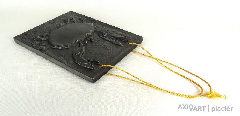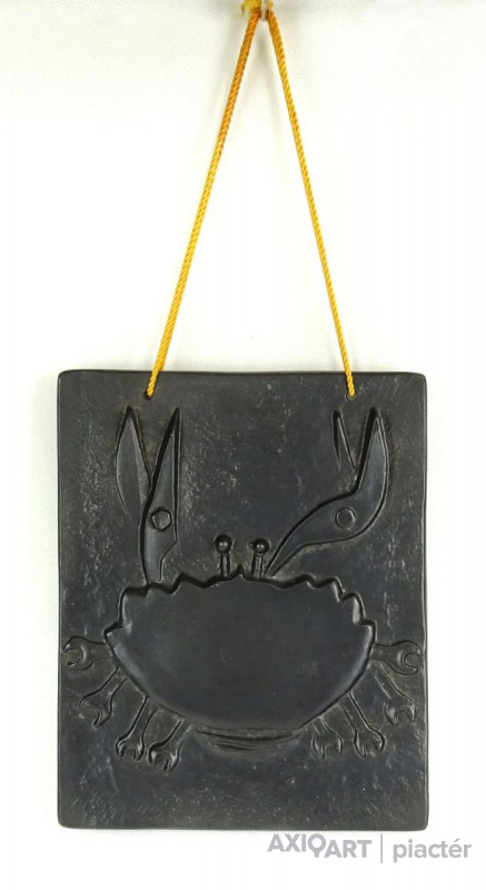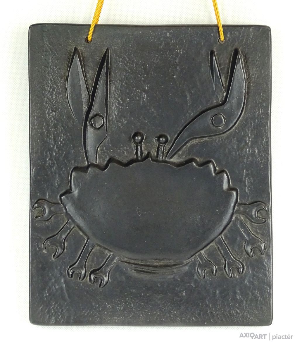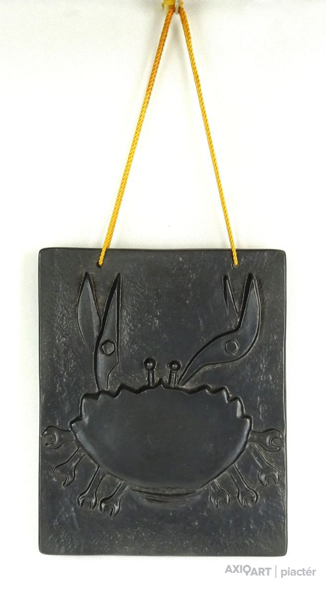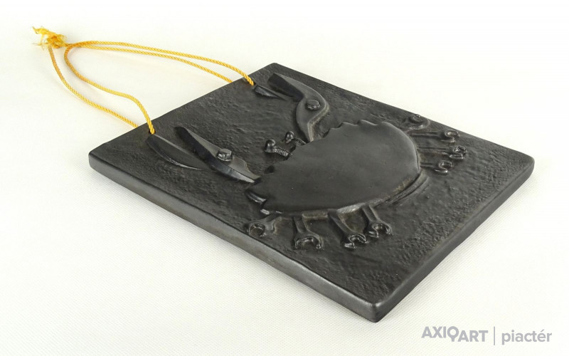 Jelzett, falra akasztási lehetőséggel rendelkező, fekete mázas fali kerámia. Szerszámkészlet rák koncepció.