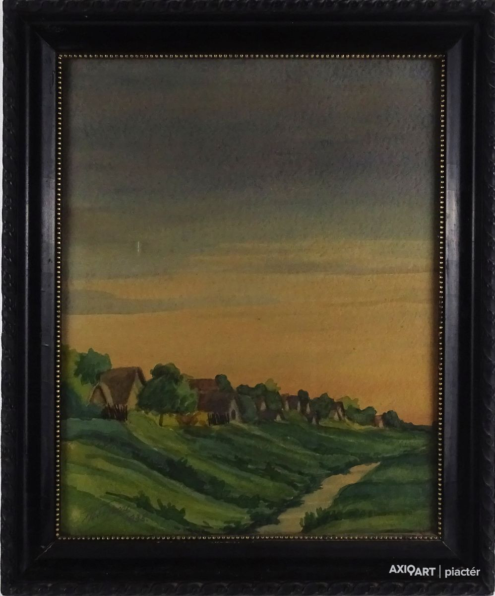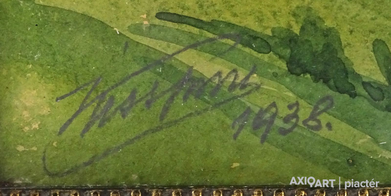 [1T337/144] papír akvarell üveglap mögött, régi fekete keretben. Akasztási lehetőséggel rendelkezik. Jelezve balra lent, lásd fotó: KISS IMRE?... 1938 Hátoldalán korabeli keretezői címke, rajta felirat: WOLF LÁSZLÓ ÜVEGES HÓDMEZŐVÁSÁRHELY Magasság: 47 cm Szélesség: 39 cm Súly: 1.445 kg