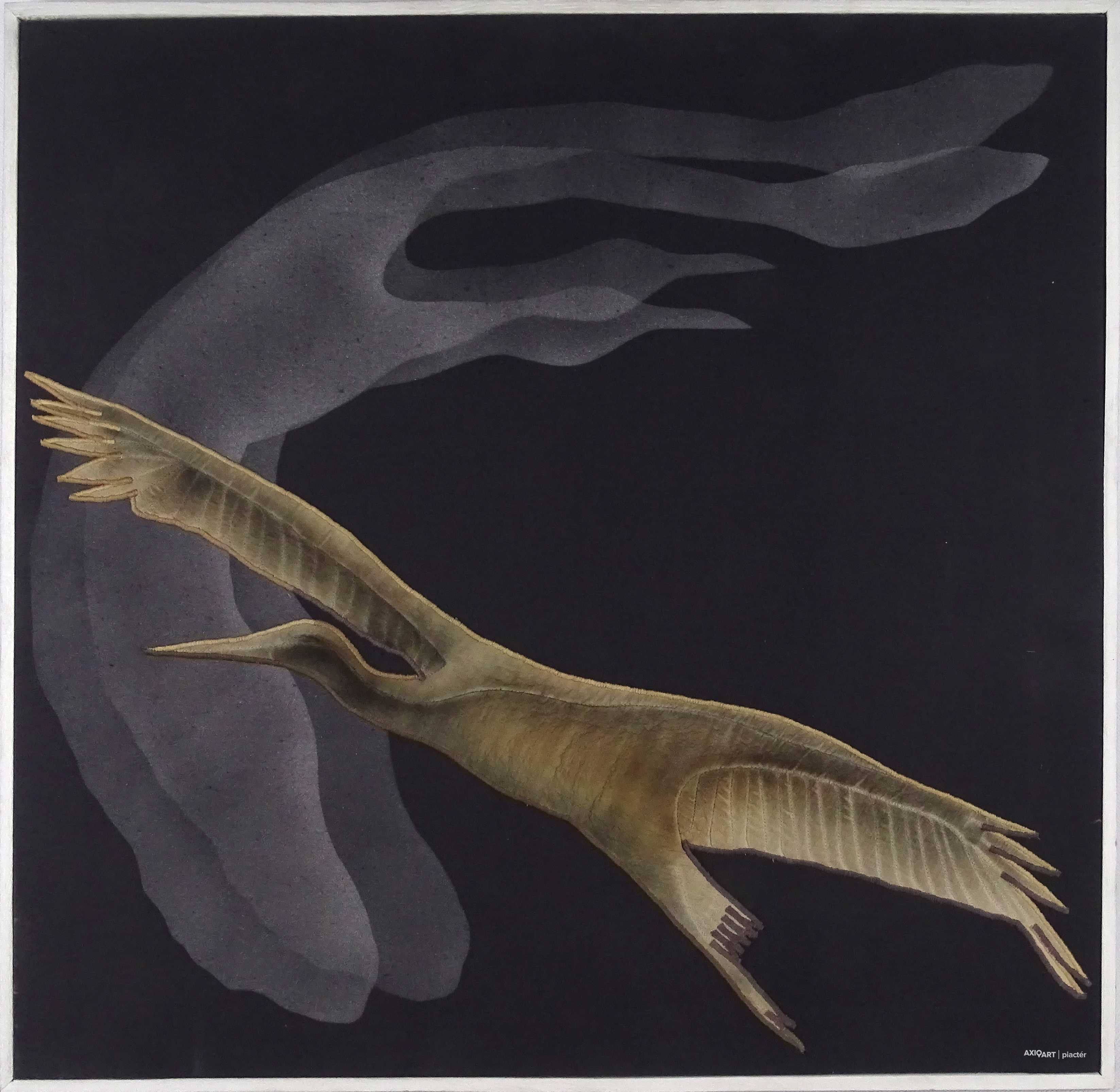 Képcsarnokos textilkép, kidomborodó madáralakkal, feszítőkereten, fehér keretben.