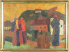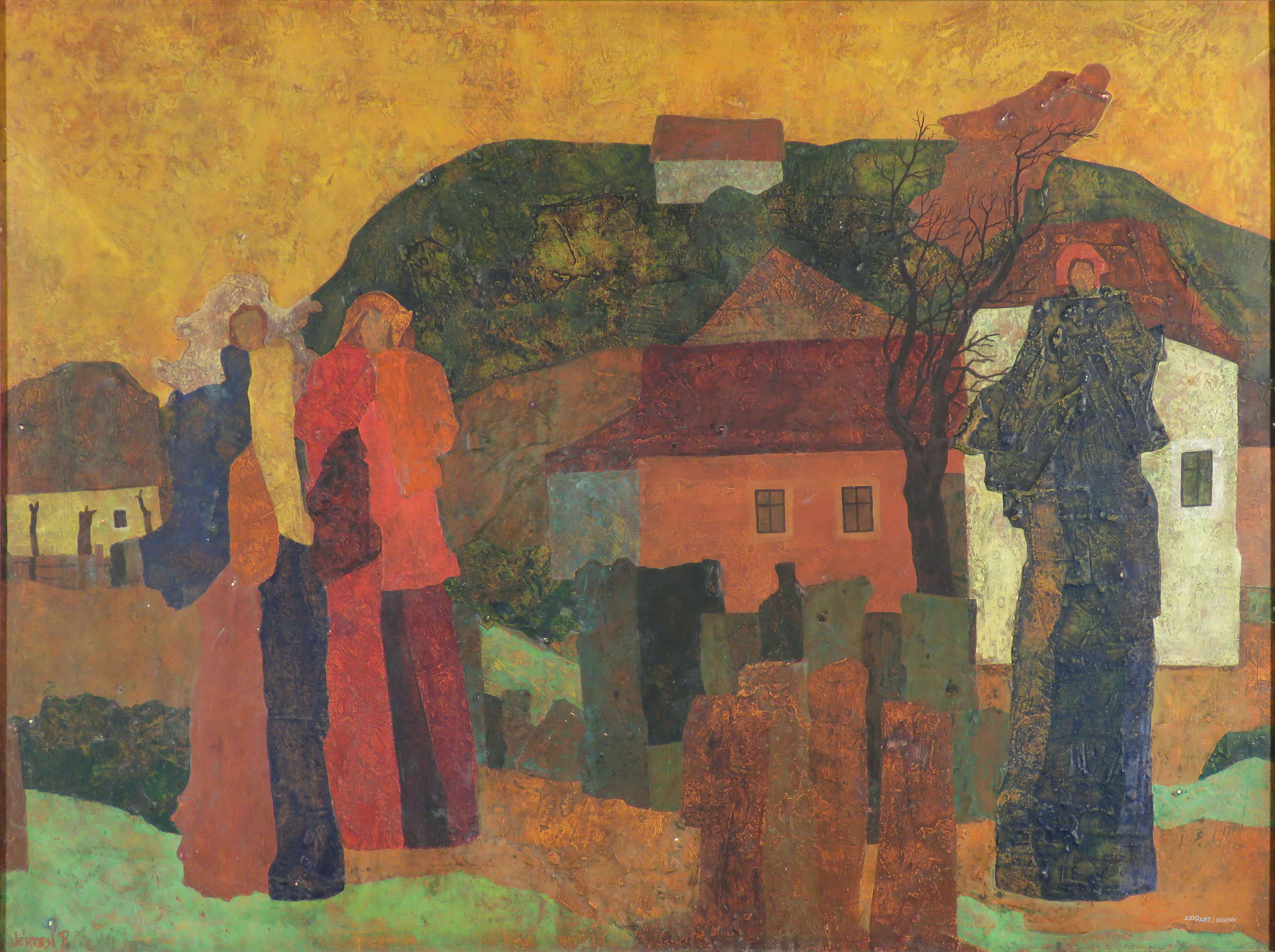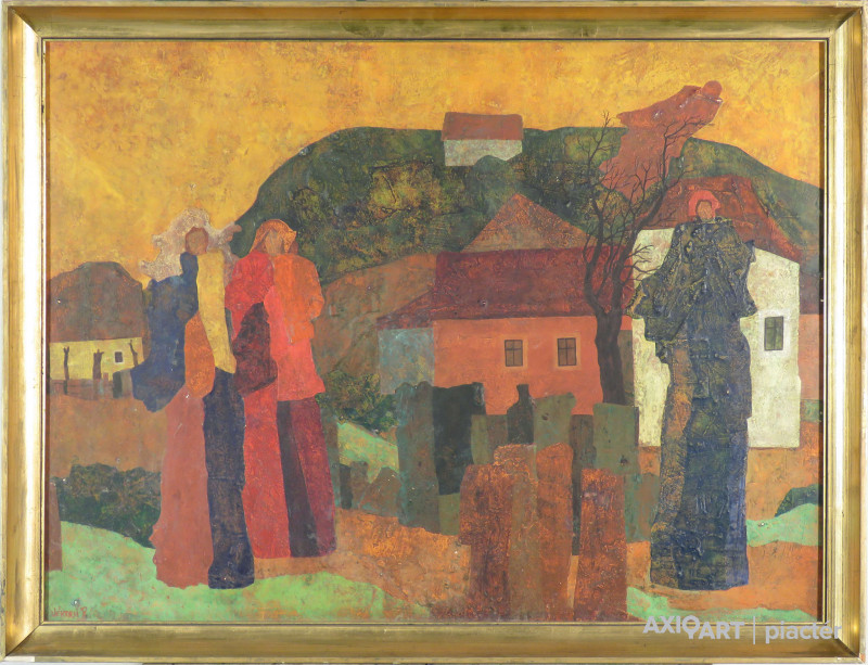 [FK2668/Bp301/4] A kép mérete: 50,5 x 80,5 cm keret nélkül. Készült: Olaj, Vászon A kép Moldován István (Kolozsvár, 1911) alkotása. Jelezve Jobbra lent "Moldován István" A festmény jó állapotban van. Keret: Ép A festmény hátoldalán a Képcsarnokvállalat raglapja láltható. Magyar festők és grafikusok életrajzi lexikona I-II. Festő. Tanulmányait Kolozsvárott, a Szépművészeti Főiskolán kezdte 1930-ban. A következő esztendőben a nagybányai Szépművészeti Iskolában Thorma János és Krizsán János korrektúráján képezte magát. 1931-ben a budapesti Képzőművészeti Főiskola hallgatója lett. Réti István, később Szőnyi István volt a mestere. Már mint főiskolás sok díjat és kitüntetést nyert. 1948-ban megkapta a római ösztöndíjat, de lemondva róla, Erdélybe ment. 1948-1950 között Erdélyben élt, és népművészetben gazdag vidékein festett. 1943-ban Kolozsvárott, 1946-ban Gyöngyösön, 1955-ben, 1959-ben és 1962-ben a Kulturális Kapcsolatok Intézetében, illetve a Csók Galériában rendezett egyéni bemutatókat. Ezen kívül több Európai országban, az USA-ban, Kanadában és Indiában is bemutatta munkáit. Eleinte sajátos atmoszférájú, lírai tájképeket, eleven színvilágú képmásokat festett, később mondernebb, erőteljesebben szerkesztett művekkel jelentkezett. A Pécsi Tanárképző Főiskola számára mozaikot készített. Erdély szerelmese volt. A székely népművészet gazdag formavilágának hatása döntő jelentőségűvé vált sokoldalú művészetében. Műv. díjak: a Szinyei Társaság elismerő oklevele, a Főváros festészeti-díja, "Kolozsvár a képzőművészetben" II. díj, állami ösztöndíj, római ösztöndíj, a Képzőművészek Szövetsége Észak-Magyarországi festészeti díja, SZOT festészeti díj. Több murális művet (mozaik) alkotott. A Magyar Nemzeti Galéria több alkotását őrzi. (M. L.: Műv. 1967/6, RI-NM) Magyar festők és grafikusok életrajzi lexikona I-II. Műgyűjtők és kereskedők kézikönyve Festő. Tanulmányait a kolozsvári Szépművészeti Főiskolán kezdte 1930-ban. A nagybányai szabadiskolában is megfordult. Itt Thorma János és Krizsán János korrektúráján képezte magát. 1931-ben Budapesten a Képzőművészeti Főiskola hallgatója lett. Réti István, később Szőnyi István volt a mestere. Már mint főiskolás sok díjat nyert. 1948-ban megkapta a római ösztöndíjat, de lemondva róla, Erdélybe ment. 1948-1950 k. Erdélyben élt, és népművészetben gazdag vidékein festett. 1943-ban Kolozsváron, 1946-ban Gyöngyösön, 1955-ben, 1959-ben és 1962-ben a Kulturális Kapcsolatok Intézetében, illetve a Csók Galériában rendezett önálló kiállítást. Ezen kívül több Európai országban, az USA-ban, Kanadában és Indiában is bemutatta műveit. Eleinte sajátos atmoszférájú, lírai tájképeket, eleven színvilágú képmásokat festett, később mondernebb, erőteljesebben szerkesztett művekkel jelentkezett. A Pécsi Tanárképző Főiskola számára mozaikot készített. Erdély szerelmese volt. A székely népművészet gazdag formavilágának hatása döntő jelentőségűvé vált sokoldalú művészetében. 1942-ben megkapta a Szinyei Társaság elismerését, és a Főváros festészeti-díjat,1943-ban elnyerte a "Kolozsvár a képzőművészetben" c. díjat. 1947-ben állami ösztöndíjat,1948-ban a római ösztöndíjat, 1972-ben a Képzőművészek Szövetsége Észak-Magyarországi festészeti díját kapta meg. A MNG több művét őrzi. (M. L.: Műv.-1976/6) Magyar festők és grafikusok adattára Tanulmányait Kolozsvárott a Képzőművészeti Főiskolán, majd Nagybányán Thorma János és Krizsán János irányítása mellett kezdte, 1931-től Budapesten megszakításokkal a Képzőművészeti Főiskolán Réti István és Szőnyi István növendékeként fejezte be. 1949-ben és 1950-ben ösztöndíjjal dolgozott Erdélyben, majd hosszú tanulmányutakra indult Nyugat-Európába, az Egyesült Államokba, s a Szovjetunióba. Először Kolozsvárott lépett a nyilvánosság elé 1943-ban, majd 1946-ban Egerben és Gyöngyösön, 1947-ben Miskolcon, 1948-ban Hatvanban, 1955, 1961 és 1981-ben a Csók Galériában, 1959-ben a KKI-ben, 1960-ban Nagykanizsán, 1963-ban Kiskunfélegyházán, 1966-ban Debrecenben, 1969 és 1975-ben Békéscsabán, 1971-ben a Mednyánszky Teremben, 1973-ban Gyöngyösön és Debrecenben, 1977-ben Egerben, 1979-ben Veszprémben, 1983-ban Miskolcon, 1984-ben Csepelen, 1986-ban a Vigadó Galériában rendezett önálló kiállítást. Külföldi kiállításai: Moszkva, Varsó, India, Szófia, Párizs, Bukarest, Belgrád, New York, Montreál és Toronto. Eddig közel kétezer színes táblaképet festett, de szívesen foglalkozik mozaikkészítéssel is. 1964-ben a Pécsi Pedagógiai Főiskola, 1968-ban a Salgótarjáni Kórház, 1969-ben a názáreti templom és 1970-ben a Videoton Vállalat díszterme részére mozaikot készített. - Erdély szerelmese. A székely népművészet gazdag formavilágának hatása döntő jelentőségűvé vált festészetében. Olyan formanyelvet alakított ki magának, amely színvilágában és summázó formaalakításában sajátos erdélyi zamat érződik, ugyanakkor korszerűen modern is konstruktivista stílusa. Munkásságát 1942-ben a Szinyei Társaság elismerésével és a Fővárosi festészeti-díjjal, 1943-ben Római-ösztöndíjjal, 1947-ben Állam ösztöndíjjal (Románai), 1963-ben a SZOT festészeti-díjával, 1972-ben a Képzőművészek Szövetsége Észak-Magyarországi festészeti-díjával tüntették ki. - Irod.: Bíró Béla: Kolozsváry Moldován István. Erdélyi Helikon, 1943.; Felvinczi Takács Zoltán: Kolozsváry Moldován István. Kolozsvár, 1943.; Dutka Mária: Magyar Nemzet, 1961.; Maksay László: Moldován István. Művészet, 1965.; D. Fehér Zsuzsa. Moldován István, Bp. 1971.; Theisler G