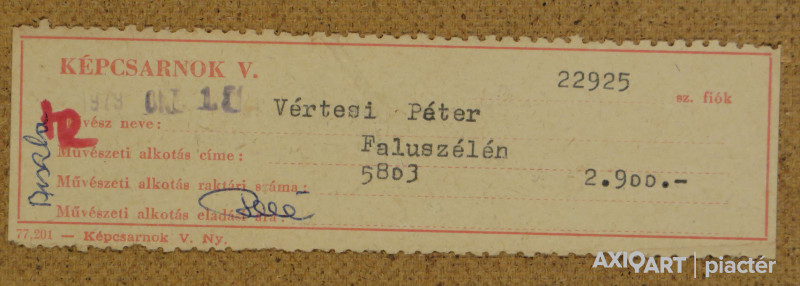 [FK3264/FL-4] A kép mérete: 31,5 x 70,5 cm keret nélkül. Készült: Olaj, tempera, Farostlemez A kép Kurucz D. István (Hódmezővásárhely, 1914, Budapest, 1996) alkotása. Jelezve Jobbra lent "Kurucz 977" A festmény jó állapotban van. Keret: Ép A festmény hátoldalán a Képcsarnokvállalat raglapja látható. Magyar festők és grafikusok életrajzi lexikona I-II. Festő, grafikus. Vásárhelyről, ahol Darvasy István festőművész figyelt fel tehetségére, került Szőnyi István magániskolájába. A fővárosi Képzőművészeti Főiskolának, ahol Rudnay Gyula, Réti István, Benkhard Ágost, Szőnyi István voltak a tanítómesterei 1940-ig volt a tanítványa. A monumentális festészetet Nagy Sándor tanította. Tanulmányúton járt több kelet- és nyugat-európai államban, Mongóliában, Japánban, Algériában. 1940-ben Hódmezővásárhelyen telepedett le, 1943-1947 között bekapcsolódott szülővárosa művészeti és közéletébe. A Vásárhely Népe c. lap munkatársa volt. 1949-59 között Szőnyi tanársegédjeként freskótechnikát tanított a főiskolán. 1951-52-ben megszervezte a Honvédségi Képzőművészeti Stúdiót, majd kinevezték a Honvéd Képzőművészeti Iskola igazgatójának. A vásárhelyi iskola reprezentáns egyéniségeként jelentős szerepe volt a Vásárhelyi Őszi Tárlatok elindításában. Megszervezete és vezette a Mednyánszky Társaságot, s haláláig művészeti vezetője volt a Hajdúböszörményi Nemzetközi Művésztelepnek. Évekig elnöke volt a Hortobágyi Alkotótábornak. Az alföldi parasztok életét megörökítő képei a falképek összefoglaló stílusában a népi realizmus és a dekoratív sommázás szellemében készültek. Számos falképet festett (Kossuth Akadémia, hódmezővásárhelyi iskola, stb.). 1941-től számos kisebb-nagyobb egyéni kiállítása volt, bemutatkozott több hazai és külhoni városban. 1941-től minden jelentősebb országos rendezvény és a magyar művészek külföldi bemutatóinak résztvevője. Rendszeresen szerepelt a Vásárhelyi Őszi Tárlatokon, a Hatvani Tájkép és Portrébiennálékon, a Szegedi Nyári Tárlatokon. Képei bemutatásra kerültek a vásárhelyi iskola jubileumi rendezvényein. 1962-ben több alkotásával szerepelt a Velencei Biennálén. Díjak: SZOT-díj, Munkácsy-díj, Érdemes és Kiváló Művész kitüntetés, Tornyai-plakett, római ösztöndíj, a Munka Érdemrend arany fokozata, Káplár Miklós-díj és emlékplakett, Kossuth-díj. Művei megtalálhatók minden jelentősebb hazai, több olasz és japán közgyűjteményben. (ML, D.J.: Műv. 1985/5, Tasnádi Attila adatközlése nyomán, L.L.: Műv. 1983/3) Magyar festők és grafikusok életrajzi lexikona I-II. Műgyűjtők és kereskedők kézikönyve Festő, grafikus. Vásárhelyről, ahol Darvasy István festőművész figyelt fel tehetségére, került Szőnyi István magániskolájába. A fővárosi Képzőművészeti Főiskolának, ahol Rudnay Gyula, Réti István, Benkhard Ágost, Szőnyi István voltak a tanítómesterei 1941-ig volt a növendéke. A monumentális festészetet Nagy Sándor tanította. Egy ideig tanársegédként működött Szőnyi mellett. Több ízben járt Itáliában tanulmányúton. Évekig művészeti vezetője volt a Hajdúböszörményi Nemzetközi Művésztelepnek. Az alföldi parasztok életét megörökítő képei a falképek összefoglaló stílusában a népi realizmus és a dekoratív sommázás szellemében készülnek. A II. világháború alatt szerepet vállalt a Szocialista Képzőművészek Csoportjának akcióiban. 1949-1960 k. a Képzőművészeti Főiskola falképtanszékének tanára volt. Több falképet festett (Kossuth Akadémia, hódmezővásárhelyi iskola, stb.). 1962-ben több alkotásával szerepelt a Velencei Biennálén, SZOT-díjas, Munkácsy-díjas, érdemes és kiváló művész kitüntető elismerésében részesült. (ML, D.J.: Műv.-1985/5, L.L: Műv.-1983/3) Magyar festők és grafikusok adattára Tanulmányait a Képzőművészeti Főiskolán végezte, ahol Rudnay Gyula és Réti István voltak a mesterei. 1941-1943-ban ösztöndíjas Rómában. 1943-1947 között Hódmezővásárhelyen dolgozik, egyidejűleg a Vásárhelyi Hétfő c. hetilap szerkesztője. 1949-1960 közötti években a budapesti Képzőművészeti Főiskola freskó tanszékének tanára. Az 1940-es évek eleje óta kiállító művész. 1962-ben a Velencei Biennálén állították ki műveit. 1970-ben Csók István Galériában volt kiállítása. A Vásárhelyi Őszi Tárlatok és a Szegedi Nyári Tárlatok rendszeres kiállító művésze. Az alföldi festészet egyéni hangú továbbfejlesztője. Táblaképeket, freskókat és kerámia falképeket alkot. Munkácsy-díjas, érdemes és kiváló művész kitüntető elismerésében részesült. A SZOT a legelső képzőművészek közt, 1962-ben tüntette ki díjával. A 70. születésnapját ünneplő művész 1984 decemberében életmű kiállítást rendezett műveiből a hódmezővásárhelyi Tornyai János Múzeumban. 1986-ban a budapesti Hollósy Galériában nyílt kiállítása. - Irod.: Szij Rezső: Kurucz Dezső István festőművész. Bp. 1967.; Kulcsár Ödön: SZOT-díjasok. Bp., 1981.; Lóska Lajos: Mindig freskót szerettem volna festeni. Beszélgetés Kurucz Dezső Istvánnal. Művészet, 1984. 3. Művészeti lexikon I-IV. Festő, Munkácsy-díjas. A Képzőművészeti Főiskolán Rudnay Gyula, Réti István, Benkhard Ágost, Szőnyi István növendéke volt 1934-40 között. Több ízben járt külföldi tanulmányúton. Az alföldi parasztok életét megörökítő képei a falképek összefoglaló stílusában a népi realizmus és a dekoratív sommázás szellemében készülnek. 1949-60 között a Képzőművészeti Főiskola falképtanszékének tanára volt. Több falképet festett (Kossuth Akadémia; Hódmezővásárhely, iskola, pápai pártház, 1965). Legutóbb 195