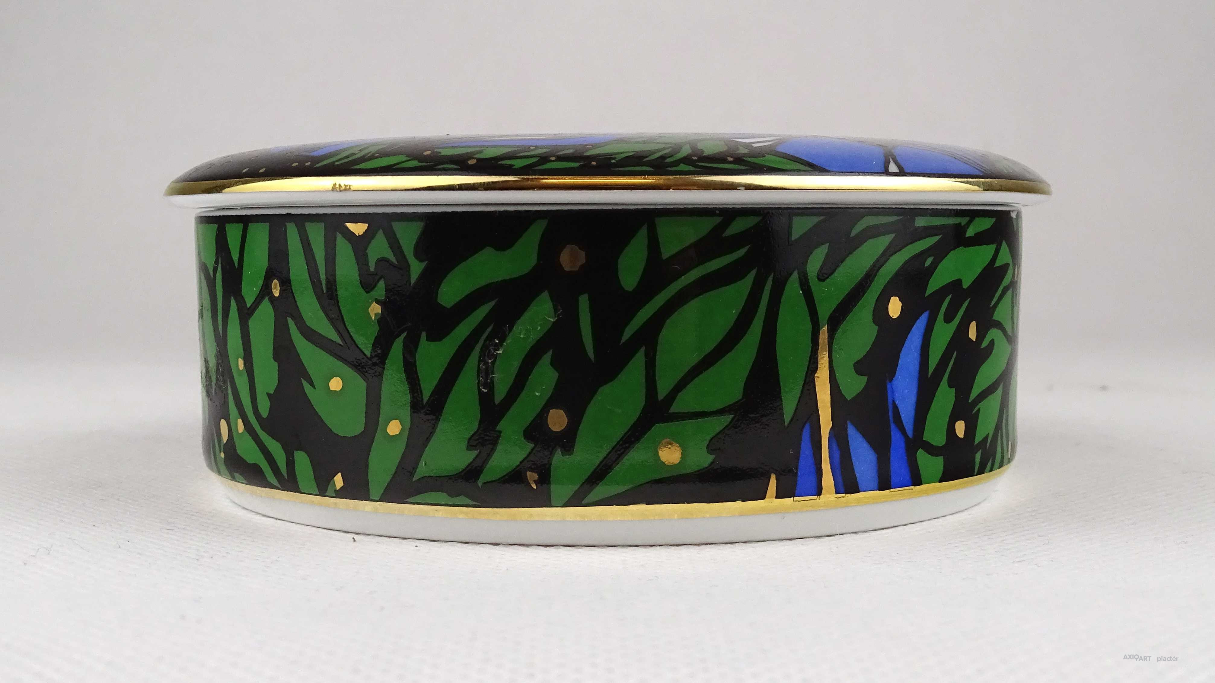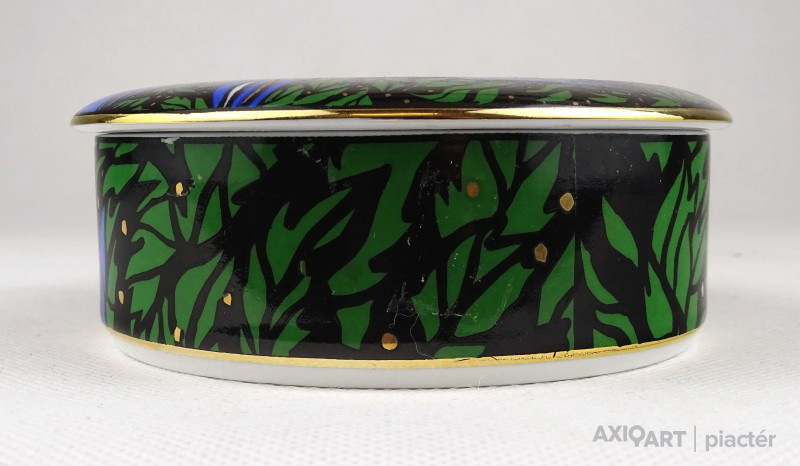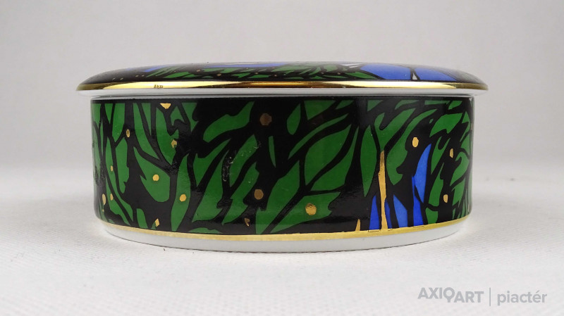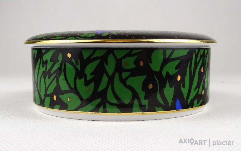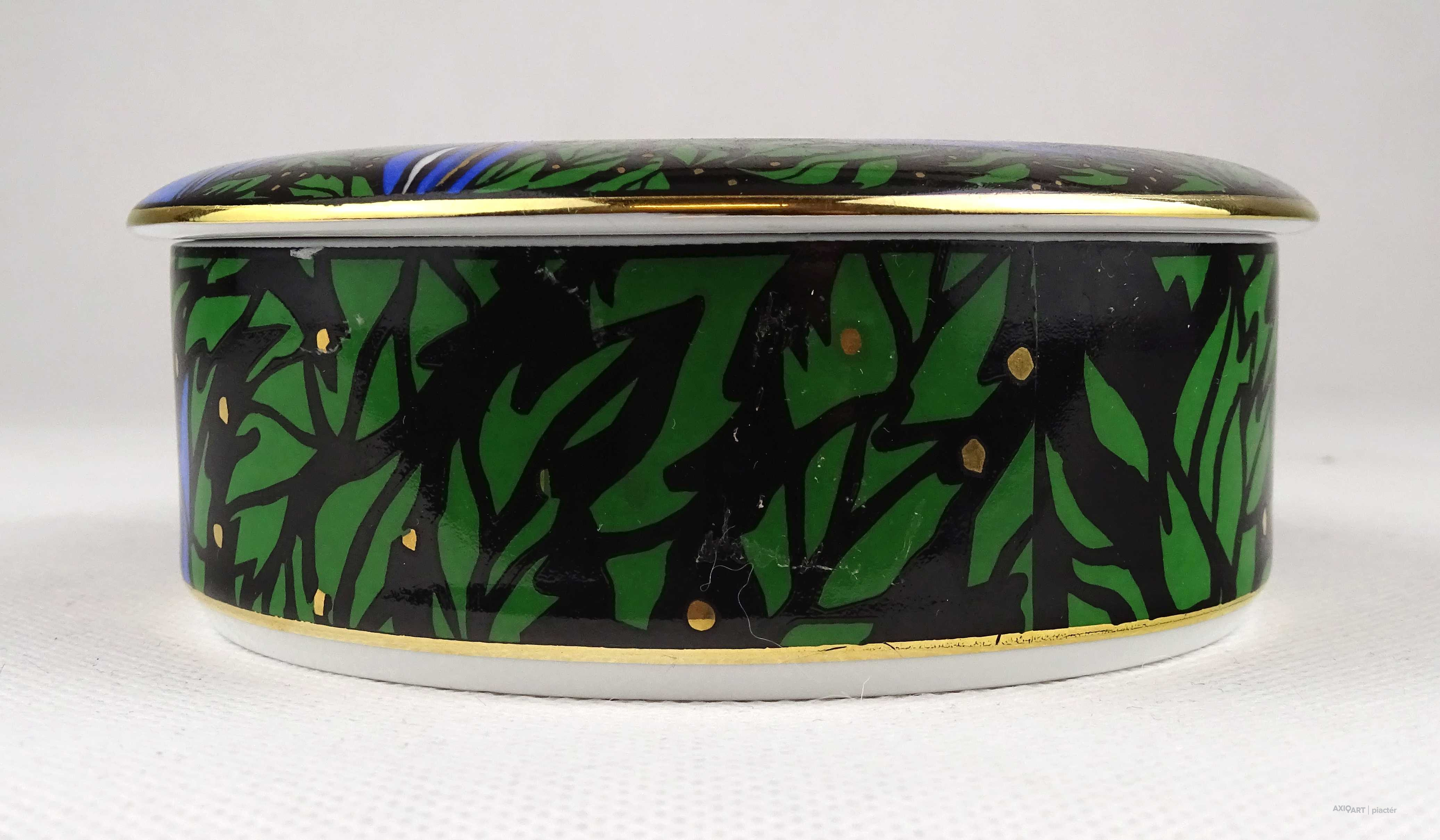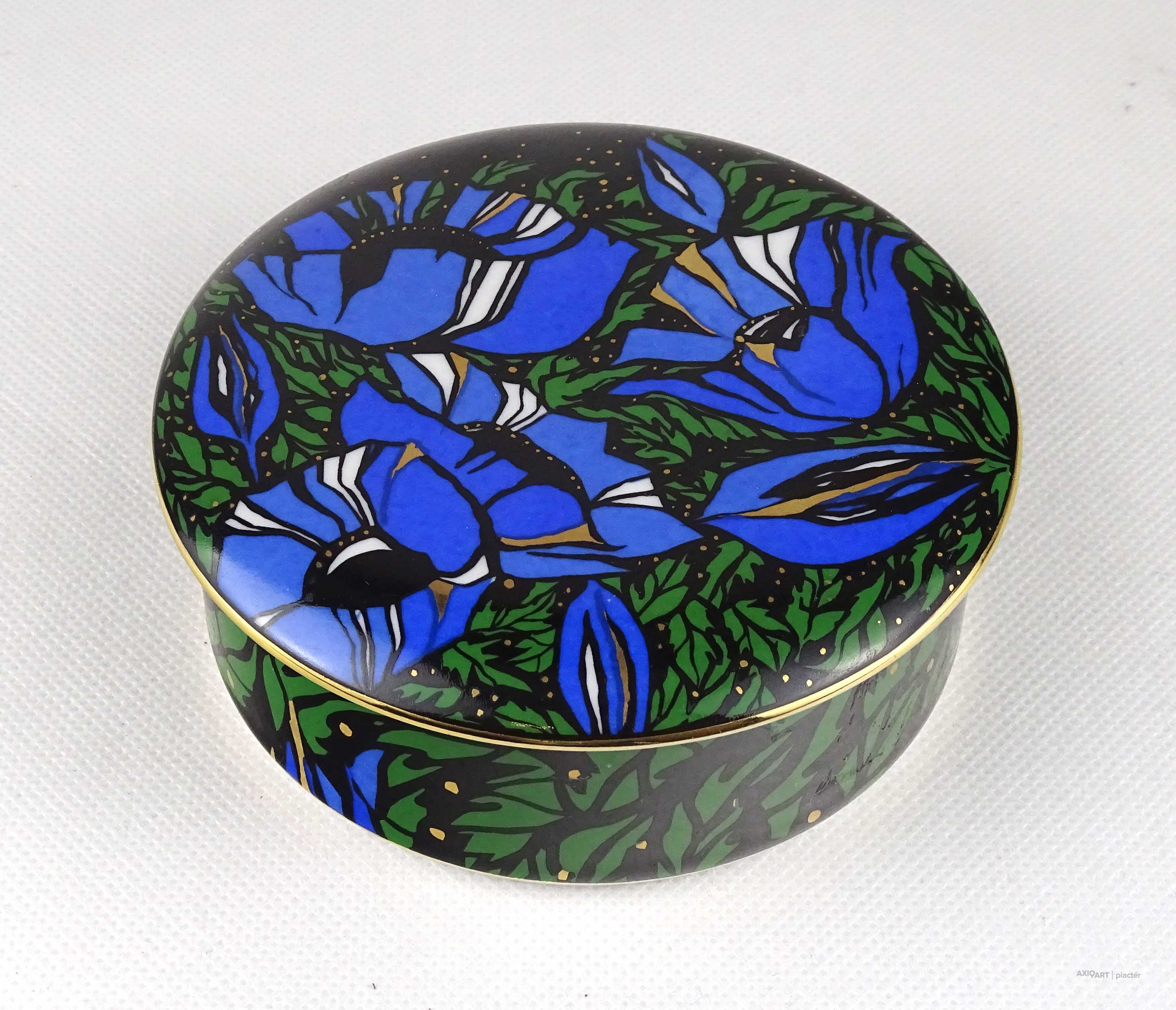 Hibátlan állapotú, Vészabó Noémi festőművész által tervezett Klára mintás, fekete - kék - zöld - arany színű, virág mintával díszített, jelzett, fedeles Hollóházi porcelán ékszertartó, gyűrűtartó bonbonier, porcelán szelence.