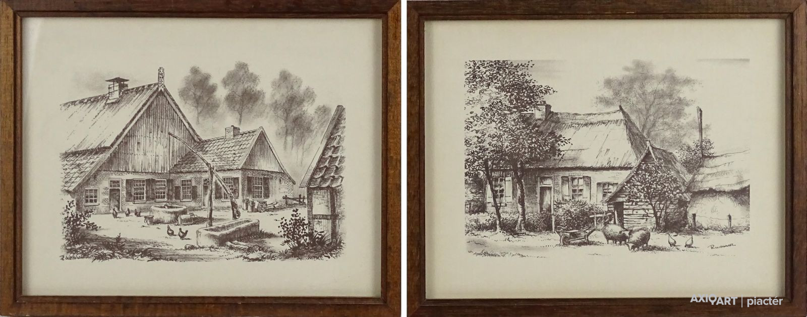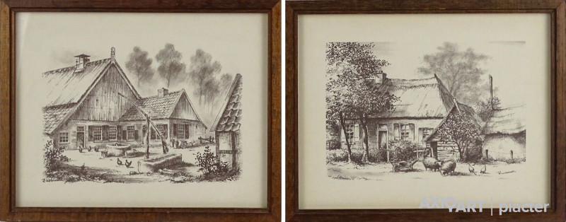 Szépen keretezett, üveglap mögött található grafikai nyomat pár. Kettő darab vidéki ház állatokkal, keményfa keretben. Nyomdatechnikai nyomat pár. Akasztási lehetőséggel rendelkeznek.