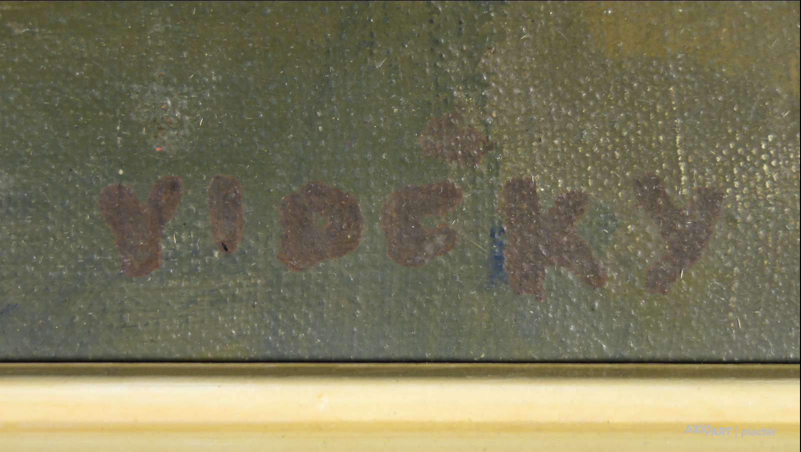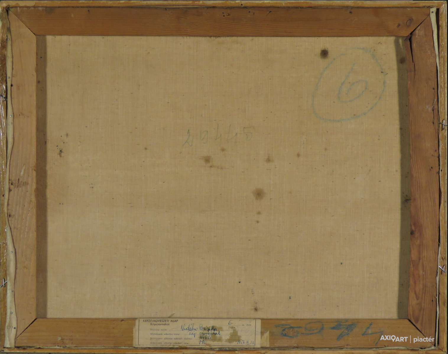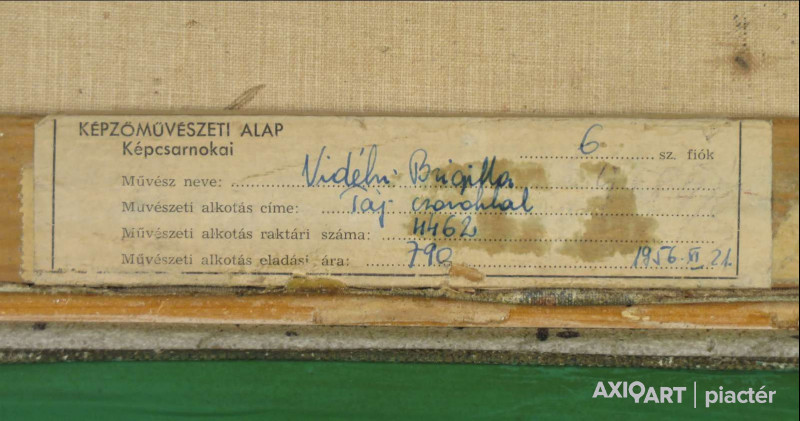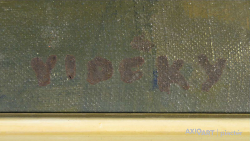 [FKC887/Bp46/38] A kép mérete: 40 x 51 cm keret nélkül. Készült: Olaj, Vászon A kép Vidéky Brigitta, Iván Szilárdné (Budapest, 1911) alkotása. Jelezve jobbra lent "Vidéky" A festmény jó állapotban van. Keret: Ép Magyar festők és grafikusok életrajzi lexikona I-II. Festő. 1925-1930 között az Iparrajziskolában tanult, 1931-37 között a Magyar Képzőművészeti Főiskolán Glatz Oszkár tanítványa volt. Mesterének vallja egyaránt Szőnyi Istvánt és Réti Istvánt is. Dolgozott a nagybányai művésztelepen, de részt vett a soproni, tokaji, pécsi, miskolci, tihanyi és bajai telepek munkájában is. A '30-as évek végén nagyobb tanulmányutat tett Nyugat-Európában. Egy éven keresztül ösztöndíjasként Rómában tevékenykedett. Télen Budapesten, nyáron Tihanyban dolgozott. 1937-től tagja volt a Nemzeti Szalon Művészeti Egyesületnek, majd a Szinyei Társaságnak. 1947-ben a Fókusz Galériában, 1952-ben, 1957-ben és 1969-ben a Fényes Adolf Teremben, 1973-ban Szentendrén volt önálló tárlata. Művészetét halk, szemérmes, önmagába vonuló líra jellemzi. Alkotásain a posztimpresszionista stílus jegyei fedezhetők fel. Szobrászattal is foglalkozott. Jelentősek aktjai és állatszobrai. 1936-ban a Magyar Képzőművészeti Főiskola tárlatán elnyerte a Műbarátok vízfestmény-díját, a Szinyei Társaság kiállításán kitüntető elismerésében részesült, 1959-ben a Fővárosi Tanács nívódíját kapta meg. A Magyar Nemzeti Galéria és a Fővárosi Képtár adott helyet műveinek. (ML, Kiállítási Katalógus, MÉ) Magyar festők és grafikusok adattára 1937-ben fejezte be tanulmányait a Képzőművészeti Főiskolán Glatz Oszkár növendékeként. Mesterének vallja még Réti Istvánt és Csók Istvánt is. A harmincas évek végén nagyobb nyugat-európai tanulmányutat tett, egy évig ösztöndíjasként Rómában dolgozott. Önállóan 1947-ben a Fókusz Galériában, 1952-ben és 1957-ben, valamint 1969-ben a Fényes Adolf Teremben, 1973-ban a Szentendrei József Attila Művelődési Központban állított ki. - Festészetét halk, szemérmes, önmagába vonuló líra jellemzi. - Irod.: P. Sz. T.: Művész életrajzok. Bp. 1985. Magyar festők és grafikusok életrajzi lexikona I-II. Műgyűjtők és kereskedők kézikönyve Festő. A bp.-i Képzőművészeti Főiskolán Glatz Oszkár tanítványa volt. Mesterének vallja egyaránt Csók Istvánt és Réti Istvánt is. Az 1930-as évek végén nagyobb tanulmányutat tett Nyugat-Európában. Egy évig ösztöndíjasként Rómában tevékenykedett. 1947-ben a Fókusz Galériában, 1952-ben, 1957-ben és 1969-ben a Fényes Adolf Teremben, 1973-ban Szentendrén volt önálló tárlata. Festészetét halk, szemérmes, önmagába vonuló líra jellemzi. (MÉ) Művészeti lexikon I-IV. Festő és szobrász. A Képzőművészetei Főiskolán tanult mint Glatz Oszkár növendéke, de Réti István és Szőnyi István hatott rá. Festői és szobrászi működése egyenértékű. Gyengéd és finom plasztikái és érzékeny, finom festményei a posztimpresszionizmus stílusában fogantak. Különösen aktjai és állatszobrai emelkednek ki munkásságából. 1940-ben a Műbarátnál, 1947-ben a Fókusz Galériában, 1952-ben és 1957-ben a Fényes Adolf Teremben rendezték meg gyűjt. kiállítását. Néhány képét a Nemz. Gal. őrzi. Művész életrajzok kortárs magyar képzőművészek Az Iparrajziskolán a grafikai osztályon végzett, a Képzőművészeti Főiskolán pedig a festőin, és megszerezte a rajztanári oklevelet, de tanári pályán sohasem működött. Itthon Glatz, Réti, Szőnyi s a nyári művésztáborok formálták szemléletét, külföldön Itália, Németalföld, Párizs, London múzeumai és művészeti élete. 1939-ben félévi ösztöndíjat kapott a római Collegium Hungaricumba. Bejárta Itália minden részét s főleg a régi korok művészete hatott rá mindmáig el nem múlóan. Elnyerte a Műbarát vízfestménydíját, a Szinyei Ifjúsági Tárlaton Arckép c. műve kitüntető elismerésben részesült. - Egyéni kiállítása: 1957, 1969, Fényes Adolf Terem, 1974 Szentendre, 1976 Helikon Galéria. Számos csoportkiállításon szerepelt. - 1960 óta Tihanyban él.