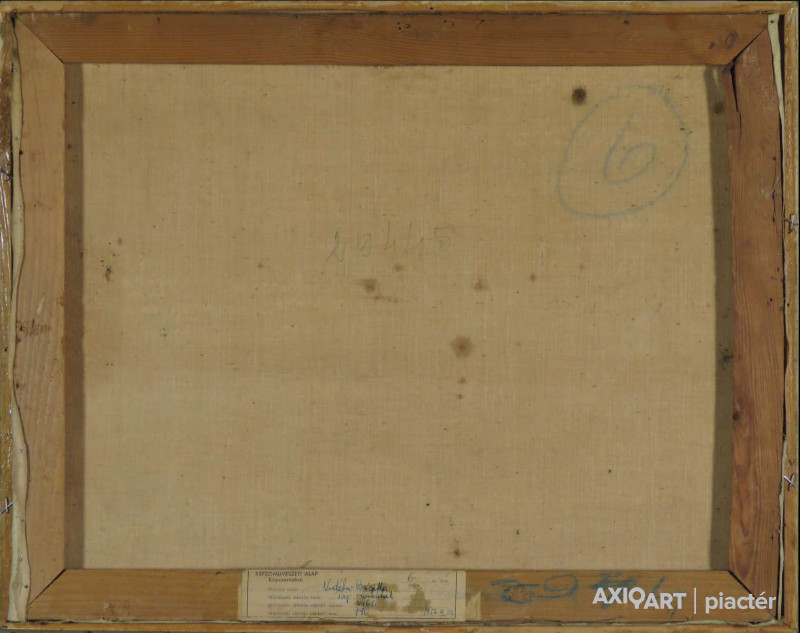 [FK0037/Z018] A kép mérete: 50 x 70 cm keret nélkül. Készült: Olaj, Vászon A kép Paizs László (Szentpéterúr, 1935) alkotása. Jelezve Jobbra lent "P. L." A festmény jó állapotban van. Keret: Ép A festmény hátoldalán a Képcsarnokvállalat címkéje található. Magyar festők és grafikusok életrajzi lexikona I-II. Festő. Tanulmányait a budapesti Iparművészeti Főiskolán végezte 1959-ben. Z. Gács György, Rákosy Zoltán és Szentiványi Lajos növendéke volt. A '60-as évek első felében hagyományosabb felfogású olajképeket festett, mozaikokat, freskókat, utóbb a pop-art körébe tartozó, a francia Arman munkáival rokon műveket alkotott. 1961 óta kiállító művész. Egyéni (Fényes Adolf Terem, Csók Galéria, Műcsarnok, Magyar Nemzeti Galéria, Halászbástya, Bástya Galéria, Vigadó Galéria, Budapest Galéria, Győr, Szombathely, Szeged, Zalaegerszeg, Duisburg, Aix-en-Provence, stb). és vegyes (Ernst Múzeum, Műcsarnok, Óbuda Galéria, Magyar Nemzeti Galéria, Csók Galéria, Vigadó Galéria, Székesfehérvár, Kaposvár, Pécs, Hódmezővásárhely, Firenze, Milano, Padova, Nápoly, Velence, Düsseldorf, Aachen, Genf, stb) tárlatokon vett részt. 1980-ban Munkácsy-díjjal jutalmazták, 1988-ban Érdemes Művész kitüntető elismerésben részesült. Munkáit őrzi a Magyar Nemzeti Galéria, a Fővárosi Képtár, a szombathelyi képtár, a pécsi Janus P. Múzeum, a székesfehérvári István Király Múzeum és a dunaszerdahelyi Kortárs Magyar Galéria. (H.B.: Műv, 1972/4, K.Gy.: Műv. 1977/2, K.G.: Műv. 1978/10, M.L.: Műv, 1983/5, R.G.: Műv, 1987/9, Sz.Gy.: Új Műv. 1995/4, MK) Magyar festők és grafikusok életrajzi lexikona I-II. Műgyűjtők és kereskedők kézikönyve Festő. Tanulmányait a bp.-i Iparművészeti Főiskolán végezte. Mozaikokat ferskókat, utóbb a pop-art körébe tartozó, a francia Arman műveivel rokon műveket alkotott. Mozaikok: a Szegedi Megyei Tanács, a Pécsi Óvoda, a Gödöllői Agrártudományi Egyetem. Freskók: Budapest - Csatárka úti Gyermekotthon. 1971-ben a Fényes Adolf Teremben volt kiállítása, 1983-ban pedig a szegedi Móra Ferenc Múzeumban nagyszabású tárlatokon mutatta be munkáit. 1988-ban érdemes művész kitüntető elismerésben részesült. (MK) Magyar festők és grafikusok adattára Az Iparművészeti Főiskolán végzett 1959-ben. Mozaikokat (Szeged, Megyei Tanács; Pécs, Óvoda; Gödöllő, Agrártudományi Egyetem), freskókat (Budapest, Csatárka úti Gyermekotthon), újabban a pop art körébe tartozó, a francia Arman műveivel rokon műveket alkotott. 1971-ben a Fényes Adolf Teremben nyílt kiállítása. 1983 februárjában a szegedi Móra Ferenc Múzeumban megrendezett nagyszabású tárlaton mutatta be alkotásait. 1988-ban érdemes művész kitüntető elismerésben részesült. - MK Művészeti lexikon I-IV. (Szentpéterur, 1935. dec. 26.- ): festő. Az Iparművészeti Főiskolán 1959-ben végzett Rákosy Zoltán, Z. Gách György és Szentiványi Lajos növendékeként. Épületdiszítő mozaikokat, (Szeged, Megyei Tanács, 1961; Pécs, Óvoda, 1964), műanyagfreskókat (Bp., Csatárka úti Gyermekotthon, 1964) és gobelinterveket készít. Kortárs magyar művészeti lexikon I-III. Festő, szobrász, grafikus. 1959: MIF, mesterei: Z. Gács György, Rákosy Zoltán, Szentiványi Lajos. 1980: Munkácsy-díj; 1988: érdemes művész. Főiskolás éveinek második felében, majd azt követően számos murális munka kivitelezésében vett részt, Fónyi Géza, Konecsni György, Z. Gács György, Rákosi Zoltán és Domanovszky Endre mellett dolgozva. A 60-as évek első felének hagyományosabb fölfogású olajképeket festett. 1964-ben a Velencei B.-n megismerkedett az amerikai pavilonban a pop art Európában akkor még újnak számító törekvésével, és részben ez inspirálta, hogy 1967-ben textil, fém, bőr anyagú "varrottas" képeket küldjön az FKS éves tárlatára; a megnyitó előtt többek között az ő munkáit is eltávolították a falról. A 70-es években pop art-os objekteket (A trónörököspár politikai gyilkosság áldozata lett, 1970, plexiüveg, újság, szarvasbogarak), majd konstruktív, átlátszó plexiüveg plasztikákat készített belső fénytörő határfelületekkel. A 80-as években készültek az anyagában színezett, konstruktív, nagyméretű poliészter szobrai, majd színes poliészter táblaképeket alkotott, mesterségesen roncsolt felületekkel, mintha régészeti leletek vagy atomtámadás utáni festmény-szurrogátumok lennének. Ekkor kezdett organikus plaszikájú bronzszobrokat is mintázni. A 90-es években, a táblaképek és szobrok mellett nagyméretű, egyedi grafikákat készített, formavilágában némileg a roncsolt táblaképekből kiindulva, de szinte kizárólag az emberi alakból elvonatkoztatott torzókat megjelenítve. Ek: 1966: Művészklub, Győr; 1971: Fényes A. T.; 1972: Bercsényi 28-30 G.; 1973: BME B-épület; 1976: Csók G.; 1977: G. Hildebrandt, Duisburg (NSZK); 1979: Bástya G., Halászbástya; Helyőrségi Műv. H., Nagyatád; József A. Műv. Közp., Szeged; Göcsej M., Zalaegerszeg; 1982: Bezzegh G., Küsnacht (CH); 1983: Móra F. M., Szeged; 1987: Műcsarnok (kat.); MNG; 1988: Pandora G., Badacsonytomaj; 1989: Parktheatter, Iserlohn (NSZK); Qualitas G.; Hevesi S. Színház, Zalaegerszeg; 1990: Vasarely Fondation (Ferdinánd Judittal, Fóth Ernővel), Aix-en-Provence (FR); 1994: Vigadó G.; 1997: Pest Center G.; 1998: Budapest G. (kat.); 1999: Pest Center G. (kat); G. Arcis, Sárvár; MMA, Bp.; 2001: SZK, Szhely; Ernst M. (kat.) Vcsk: 1961, 1964, 1966: FKS, Ernst M.; 1962: 9. Magyar Képzőműv. kiállítás, Műcsarnok; 1967: Mai magyar festészet, Új-Delhi; 1969: Vas megyei művészek, Savaria M., Szhely; V. Orsz. Grafikai B., Miskolc; 1971: Új művek, Műcsarnok; 1972: Fiatal művészek Budapestről. Likovni Salon, Újvidék (YU); 1972, 1973: Balatonboglár