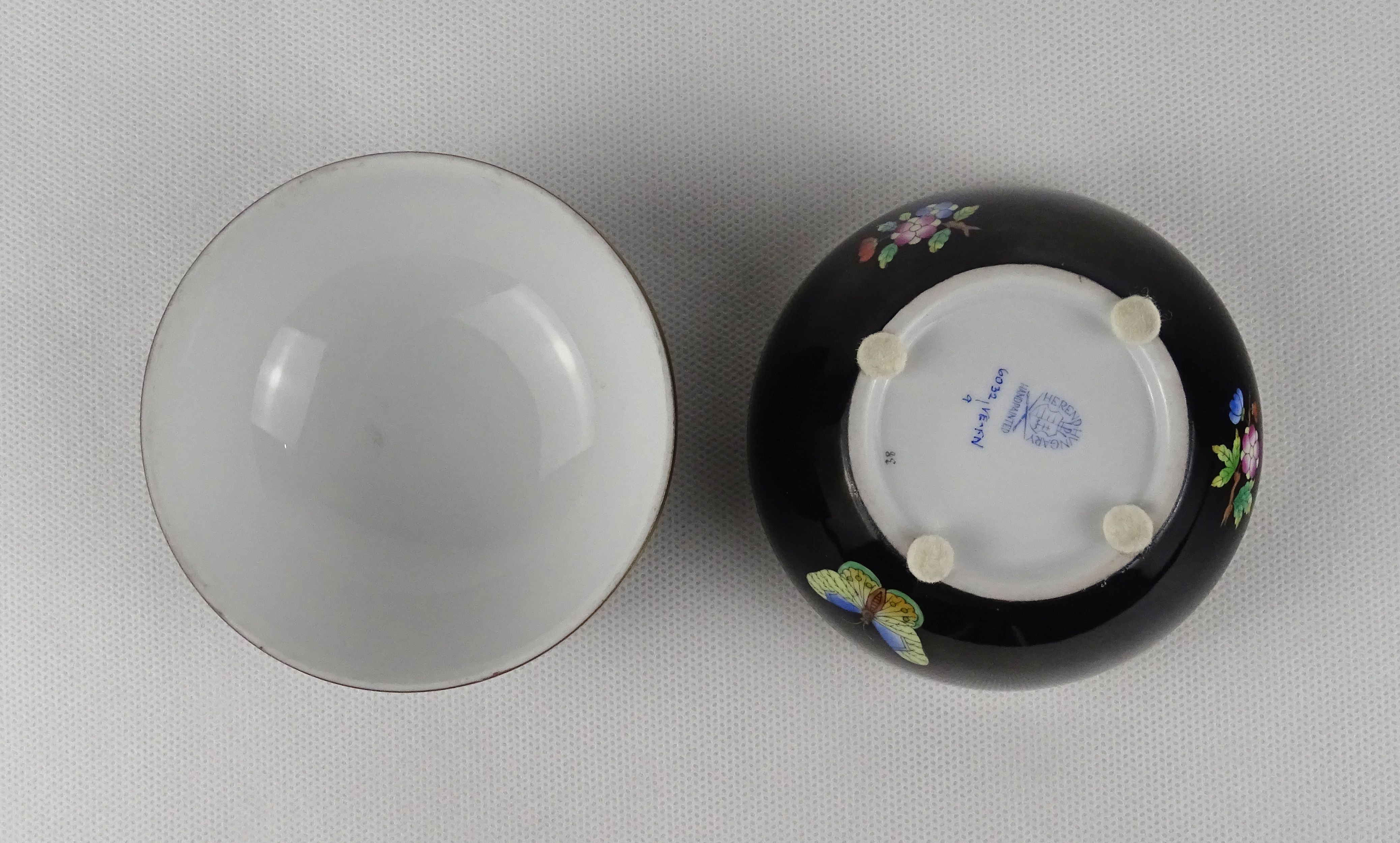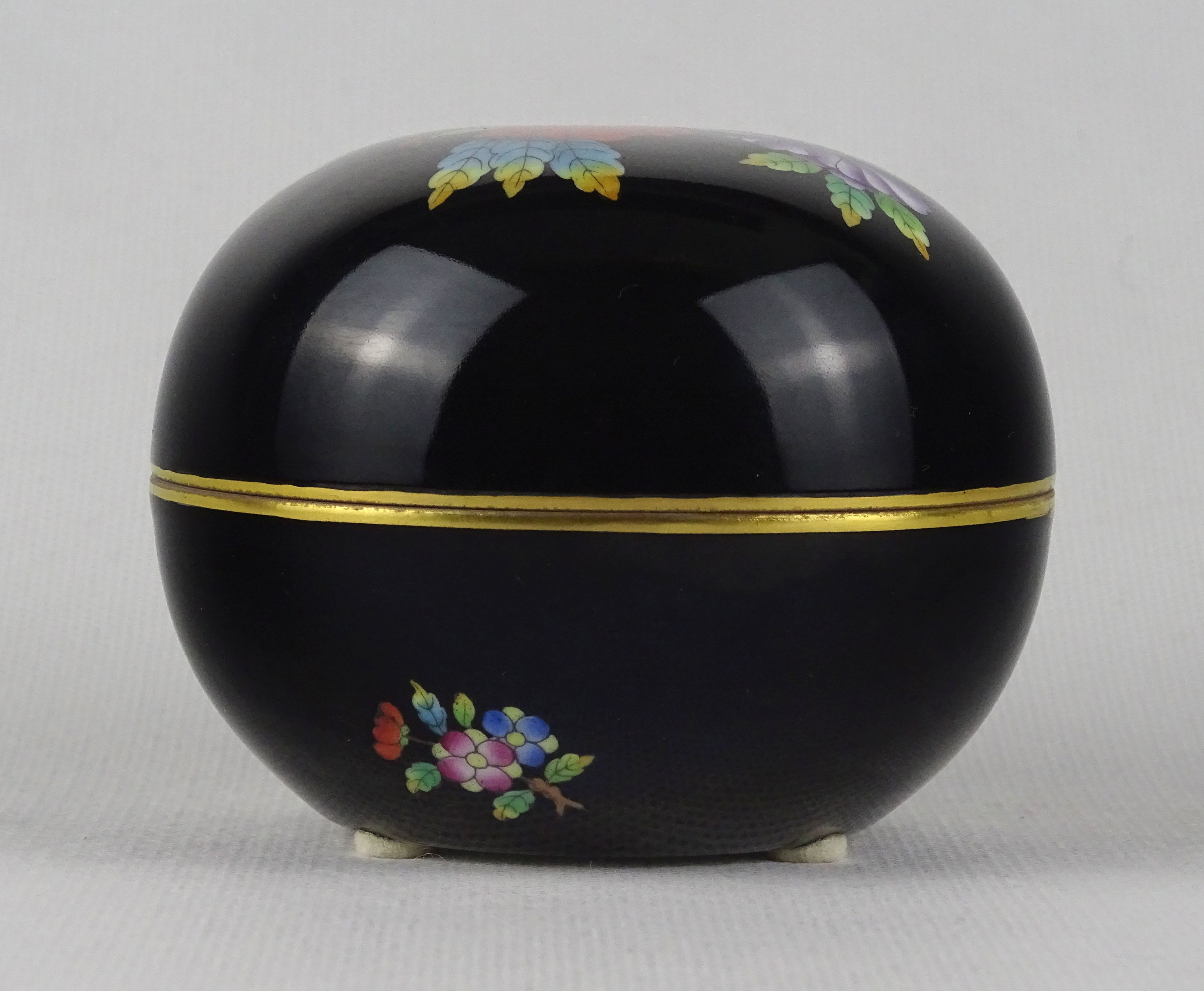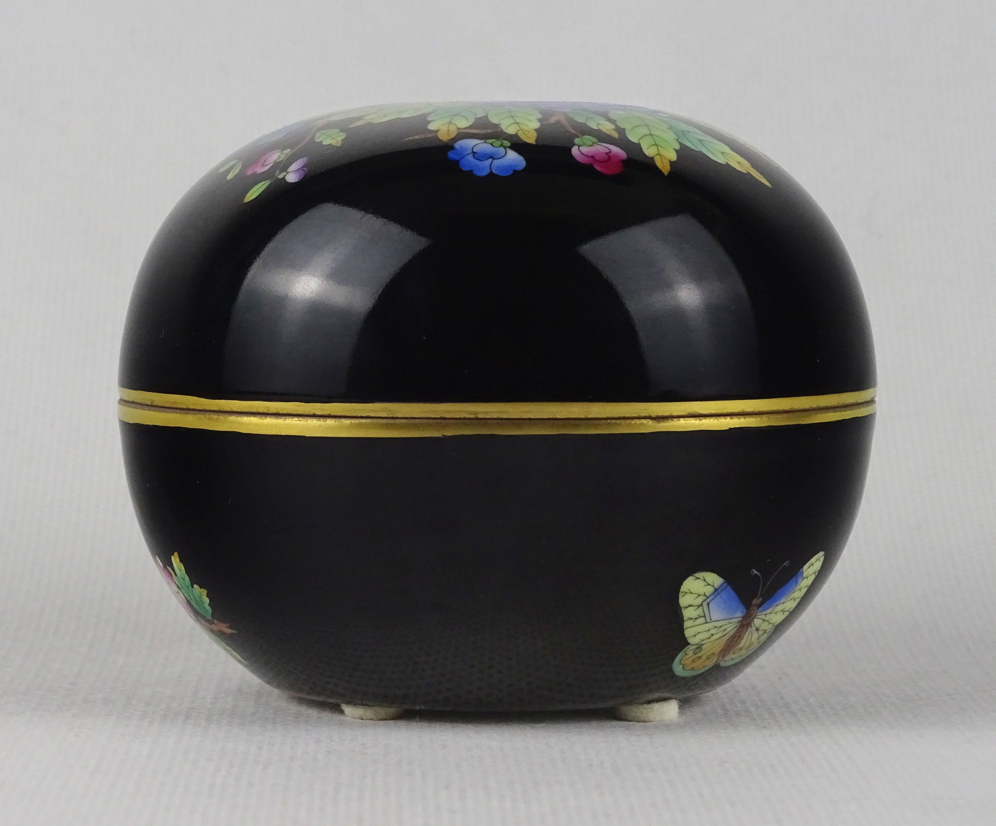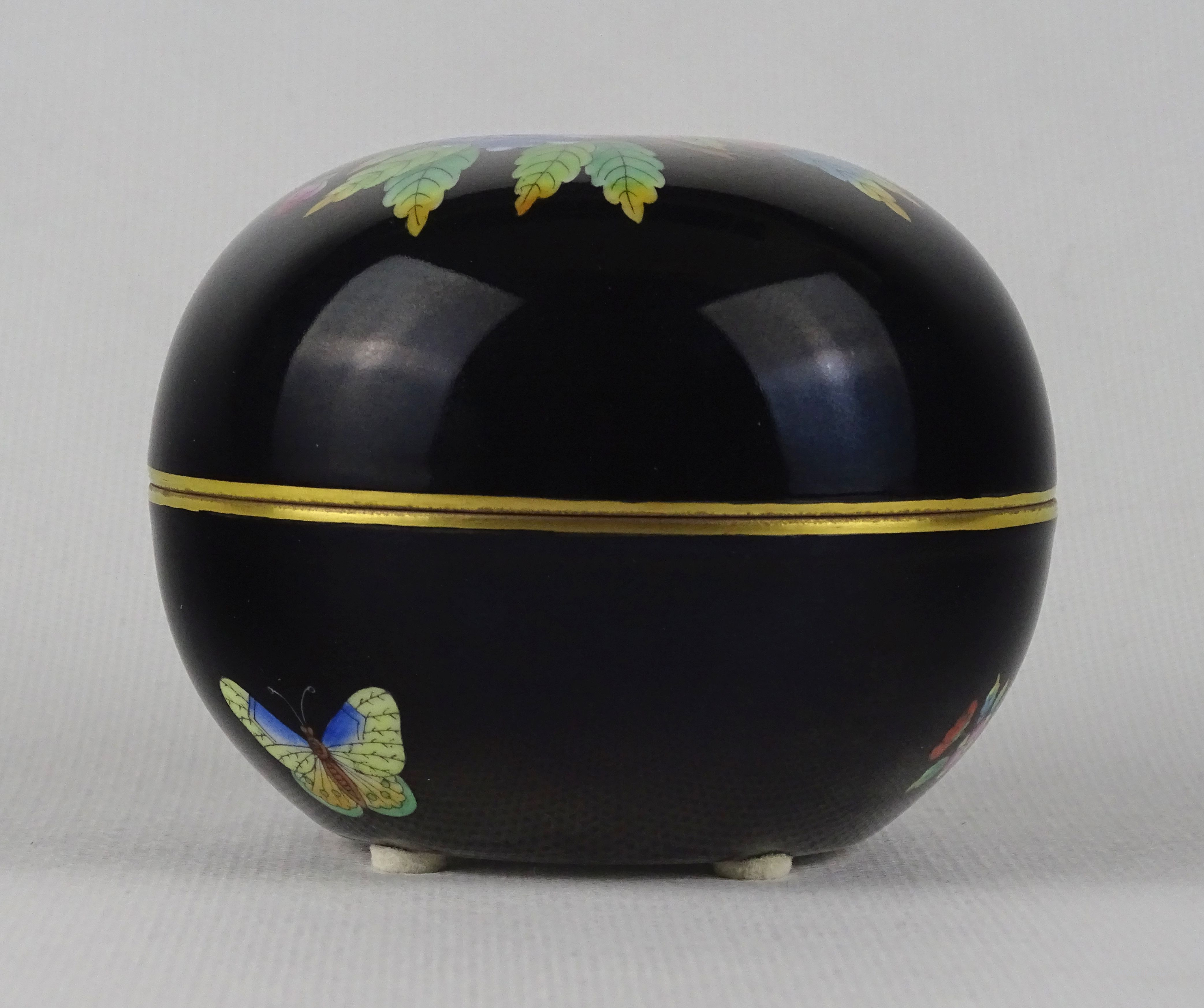 [1U140/Z016] Régi, hibátlan állapotú, jelzett, kézzel festett, aranyozott, Viktória mintás porcelán bonbonier. Alján kék Herendi márkajelzés: HEREND HUNGARY HANDPAINTED Formaszám pirossal: 6032/VE-FN Magasság: 7.2 cm Szélesség: 9 cm Súly: 0.23 kg