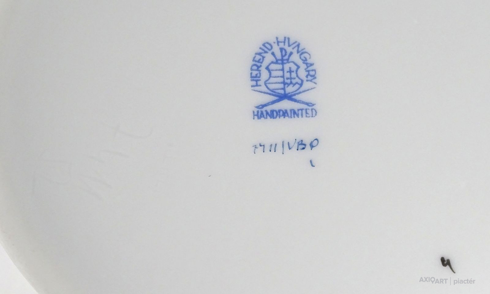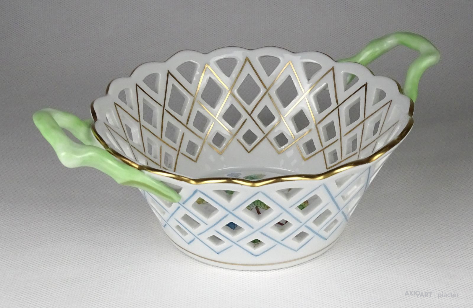 [1K242/X333] Hibátlan állapotú, áttört, két füles viktória mintás Herendi porcelán kosár, kínáló tál. Alján kék Herendi jelzés: HEREND HUNGARY HANDPAINTED Mélynyomással: HEREND Formaszám: 7411/VBO Teljesen hibátlan, azonnal ajándékba adható állapotban van. Magasság: 7.5 cm Szélesség: 21 cm Hosszúság: 15.2 cm Súly: 0.3 kg
