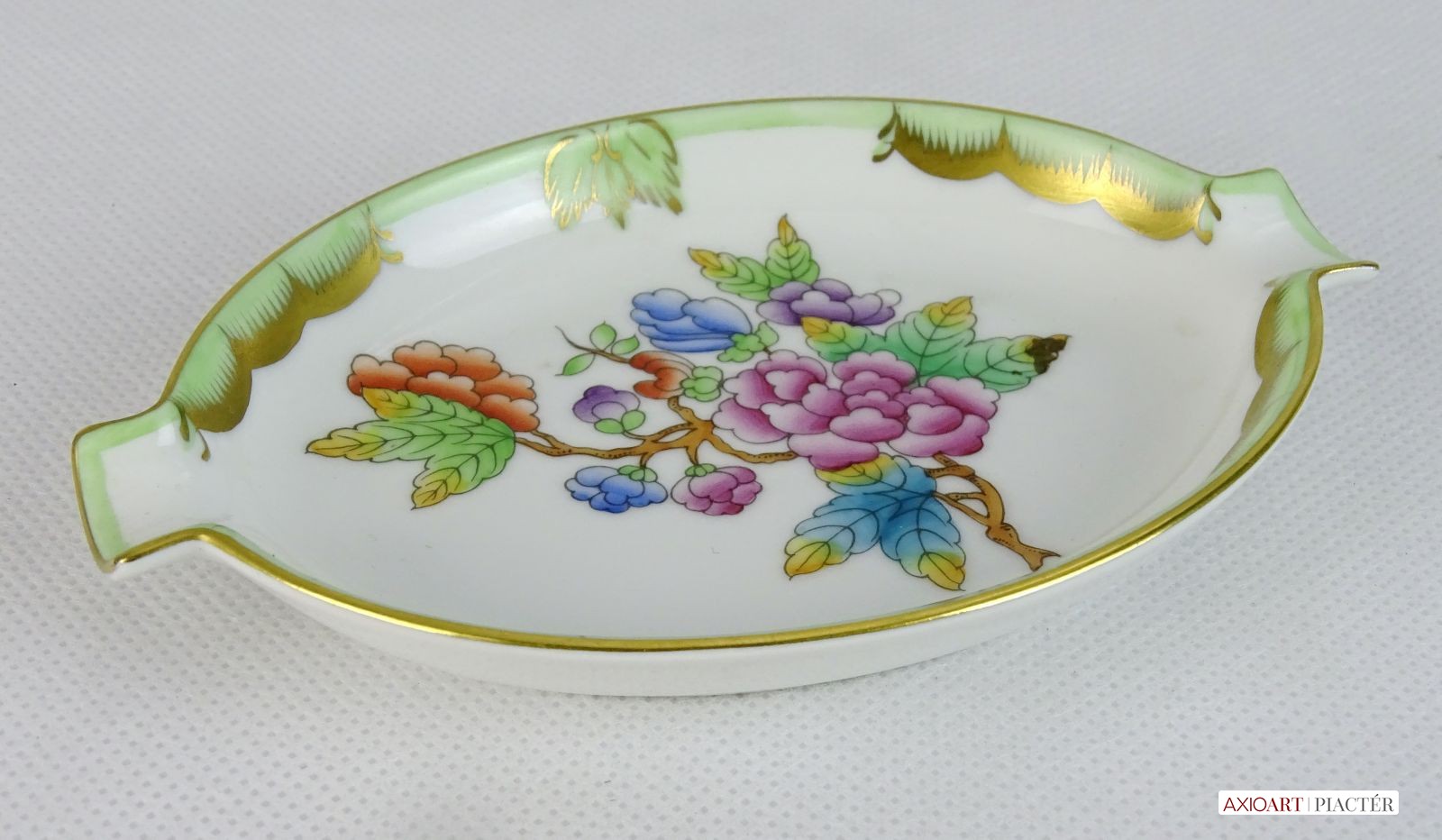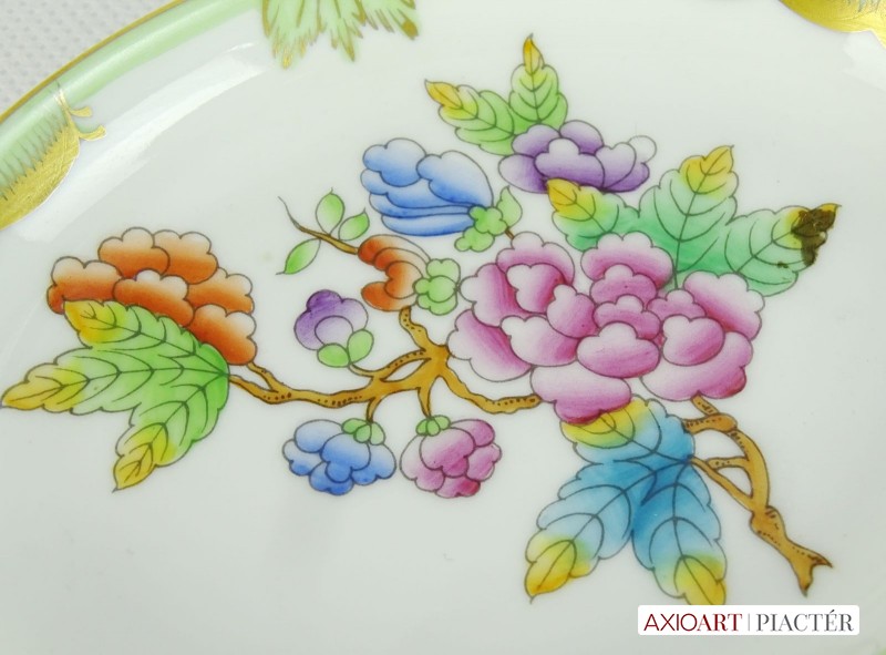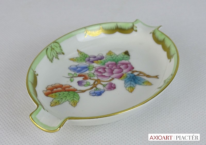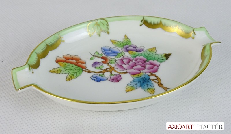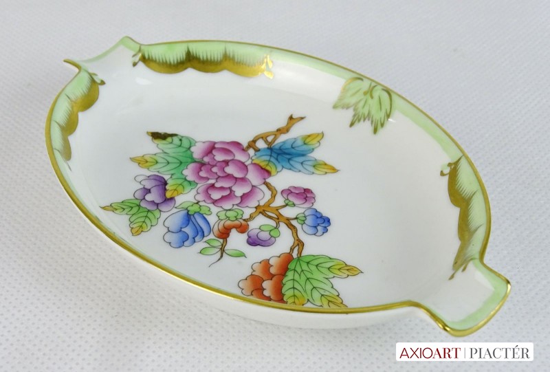 [0J434/VTR-15] Hibátlan állapotú, Viktória mintás porcelán tál, tálka, hamutartó, Alján kék herendi jelzés: HEREND HUNGARY HANDPAINTED Formaszám: 7783/VBO Mélynyomással: HEREND Szélesség: 9 cm Hosszúság: 13.5 cm Súly: 0.083 kg
