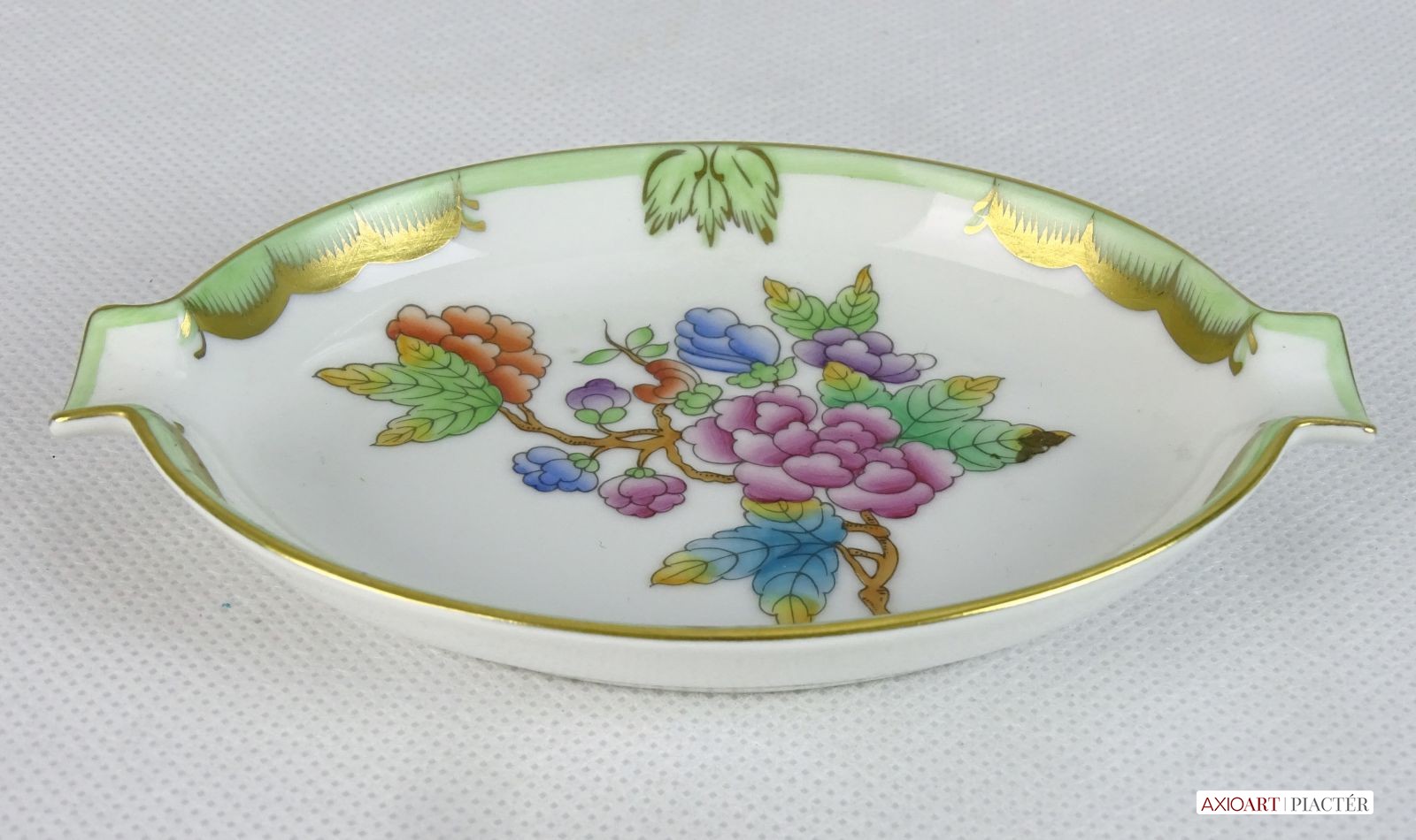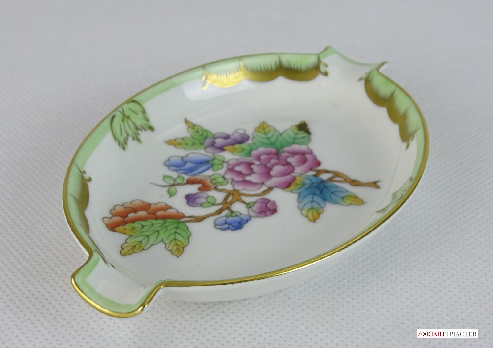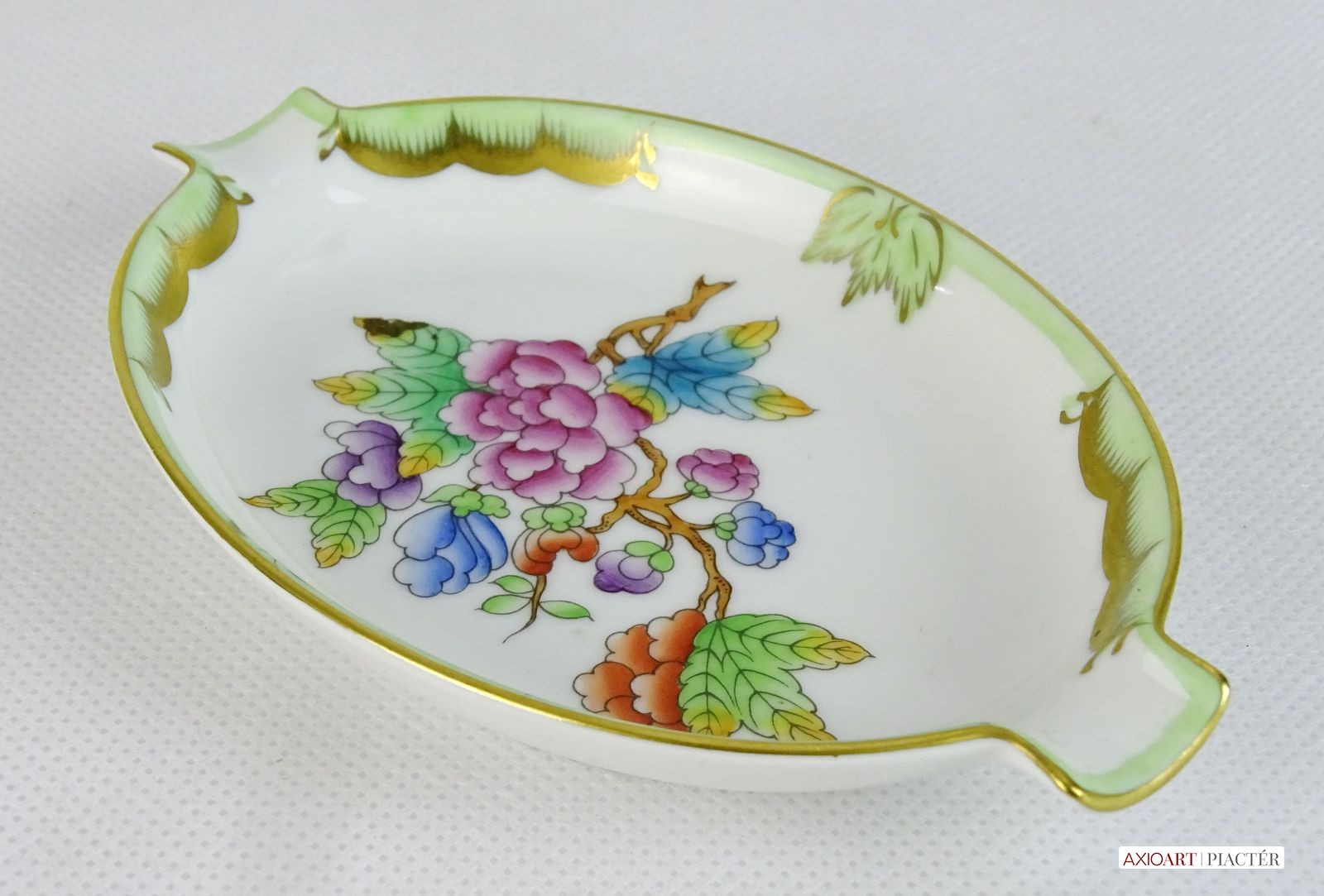 [0J434/VTR-15] Hibátlan állapotú, Viktória mintás porcelán tál, tálka, hamutartó, Alján kék herendi jelzés: HEREND HUNGARY HANDPAINTED Formaszám: 7783/VBO Mélynyomással: HEREND Szélesség: 9 cm Hosszúság: 13.5 cm Súly: 0.083 kg