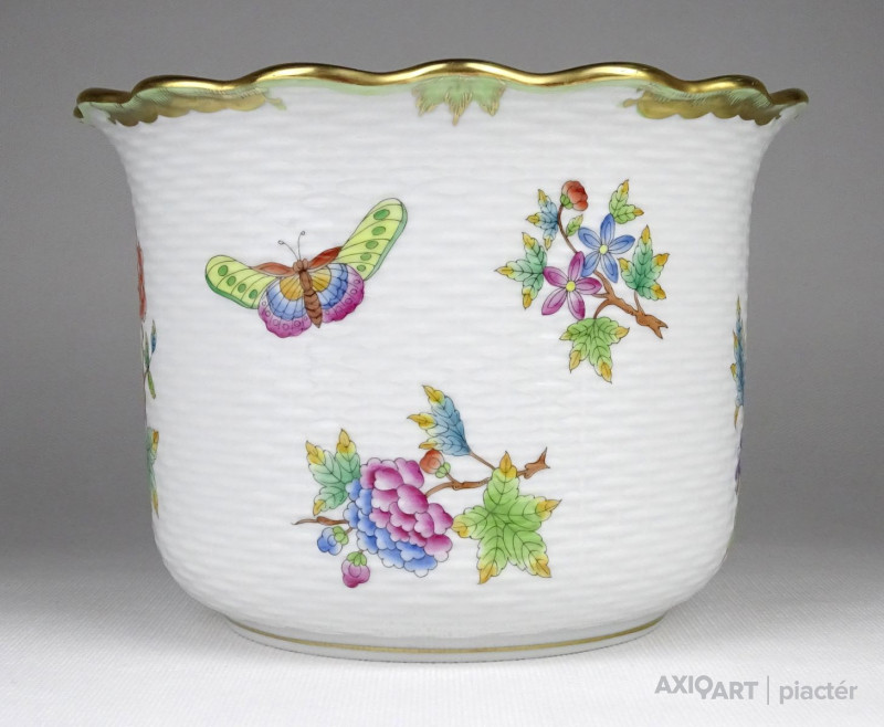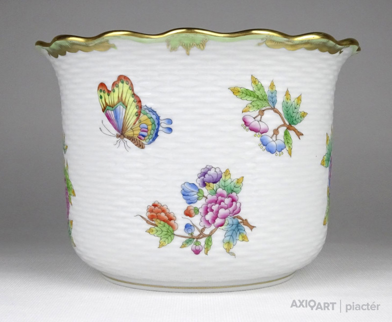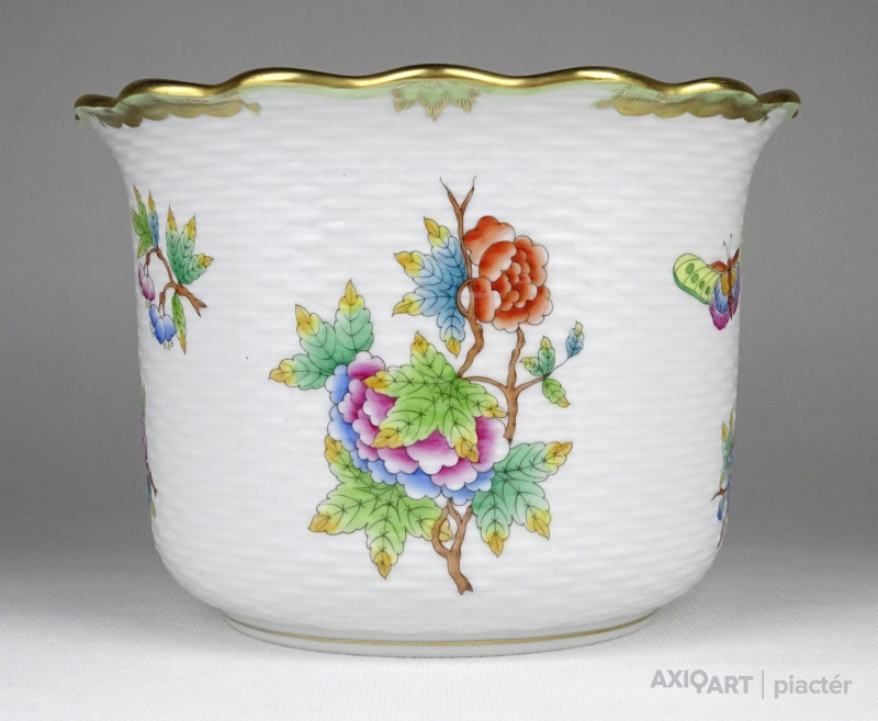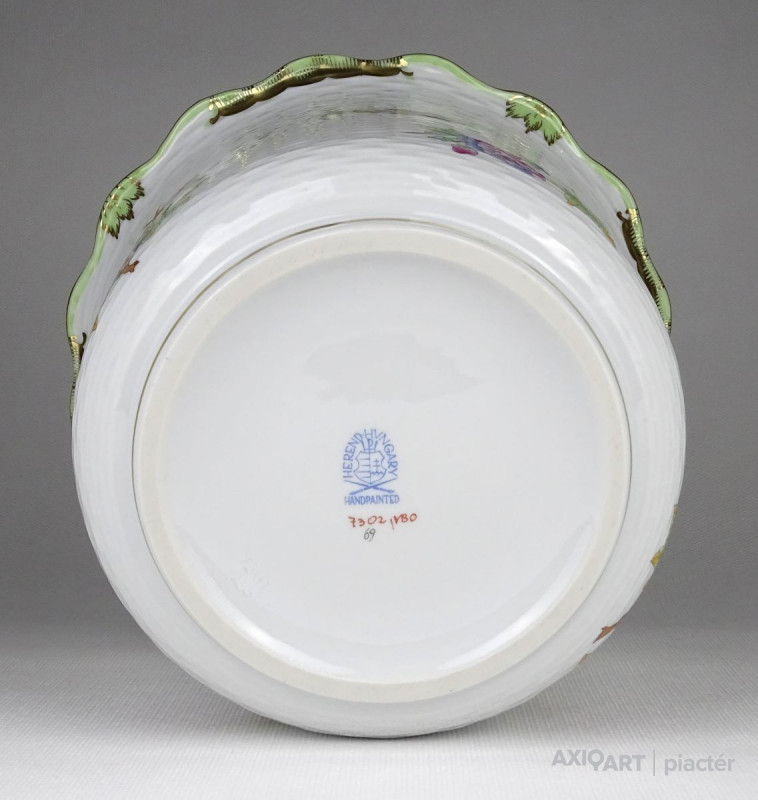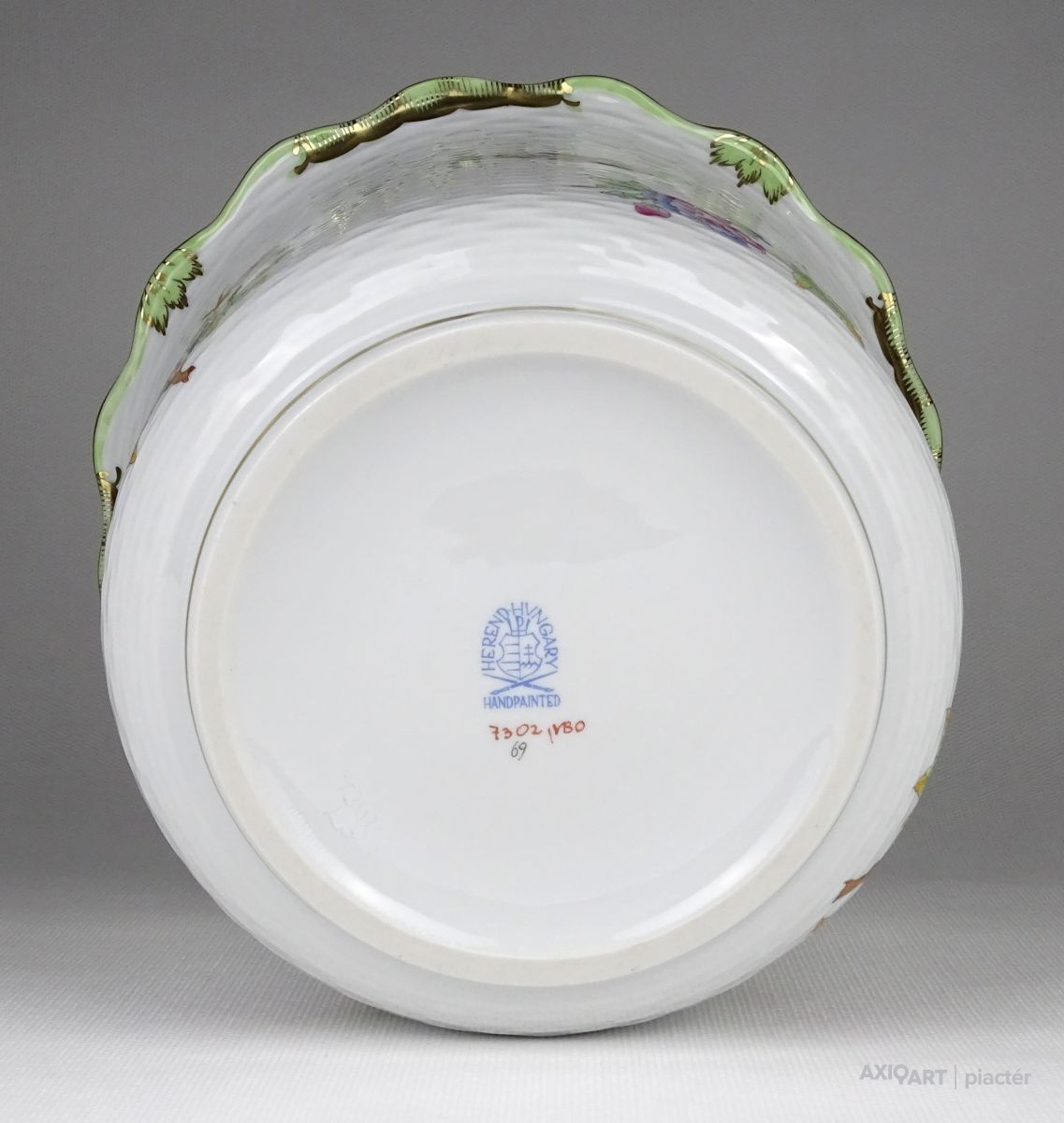 [1M796/X333] 25% ÁRENGEDMÉNY MINDEN TERMÉKÜNKRE Dec. 17-ig Hibátlan állapotú, aranyozott, dús Viktória mintás porcelán kaspó. Alján kék Herendi jelzés: HEREND HUNGARY HANDPAINTED Mélynyomással: HEREND Formaszám pirossal: 7302/VBO Magasság: 13.5 cm Szélesség: 19 cm Súly: 0.935 kg