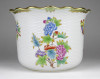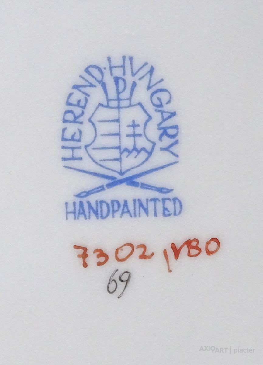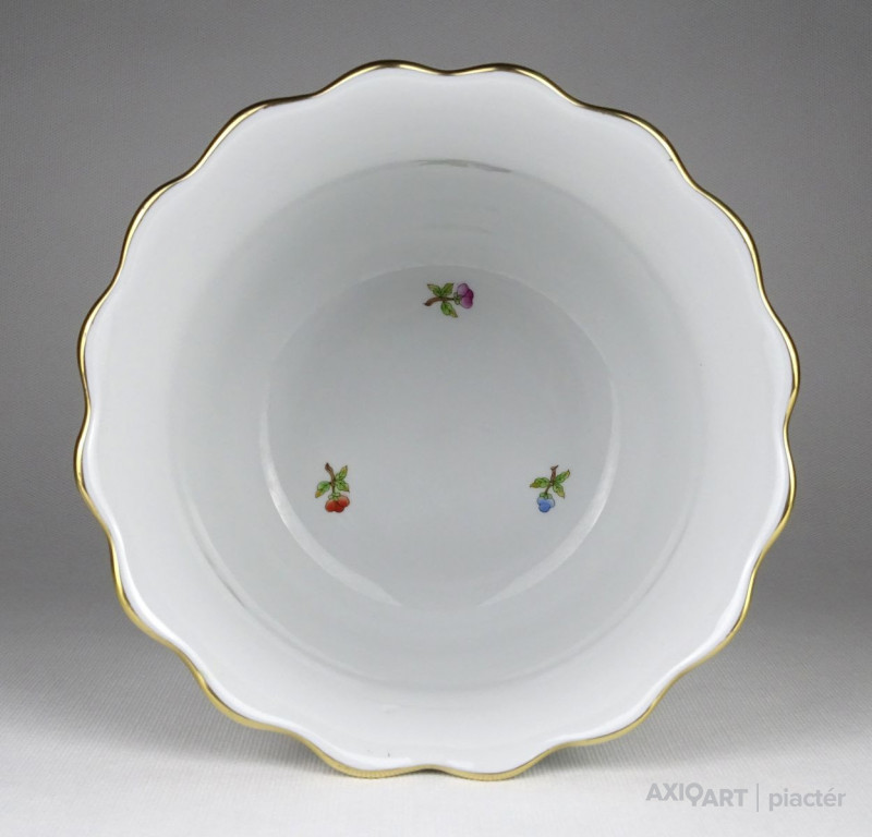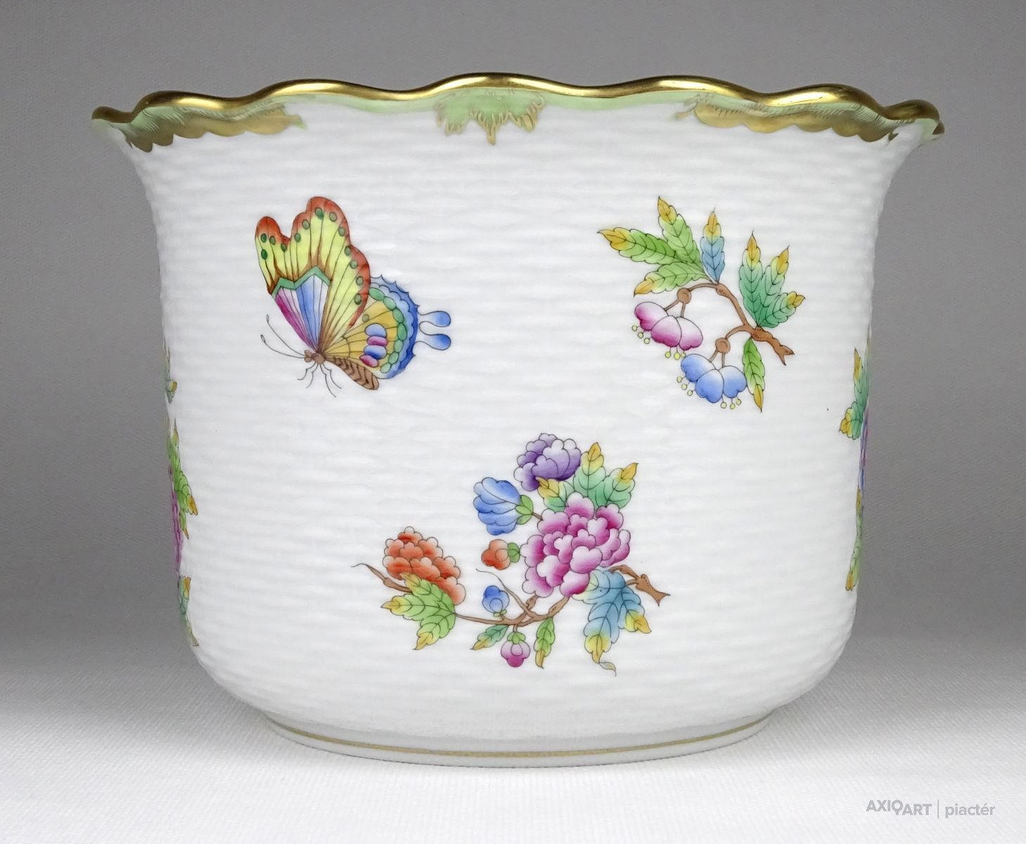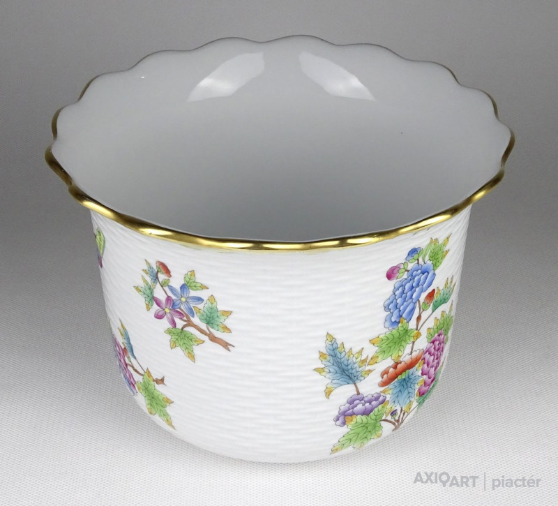 [1M796/X333] 25% ÁRENGEDMÉNY MINDEN TERMÉKÜNKRE Dec. 17-ig Hibátlan állapotú, aranyozott, dús Viktória mintás porcelán kaspó. Alján kék Herendi jelzés: HEREND HUNGARY HANDPAINTED Mélynyomással: HEREND Formaszám pirossal: 7302/VBO Magasság: 13.5 cm Szélesség: 19 cm Súly: 0.935 kg