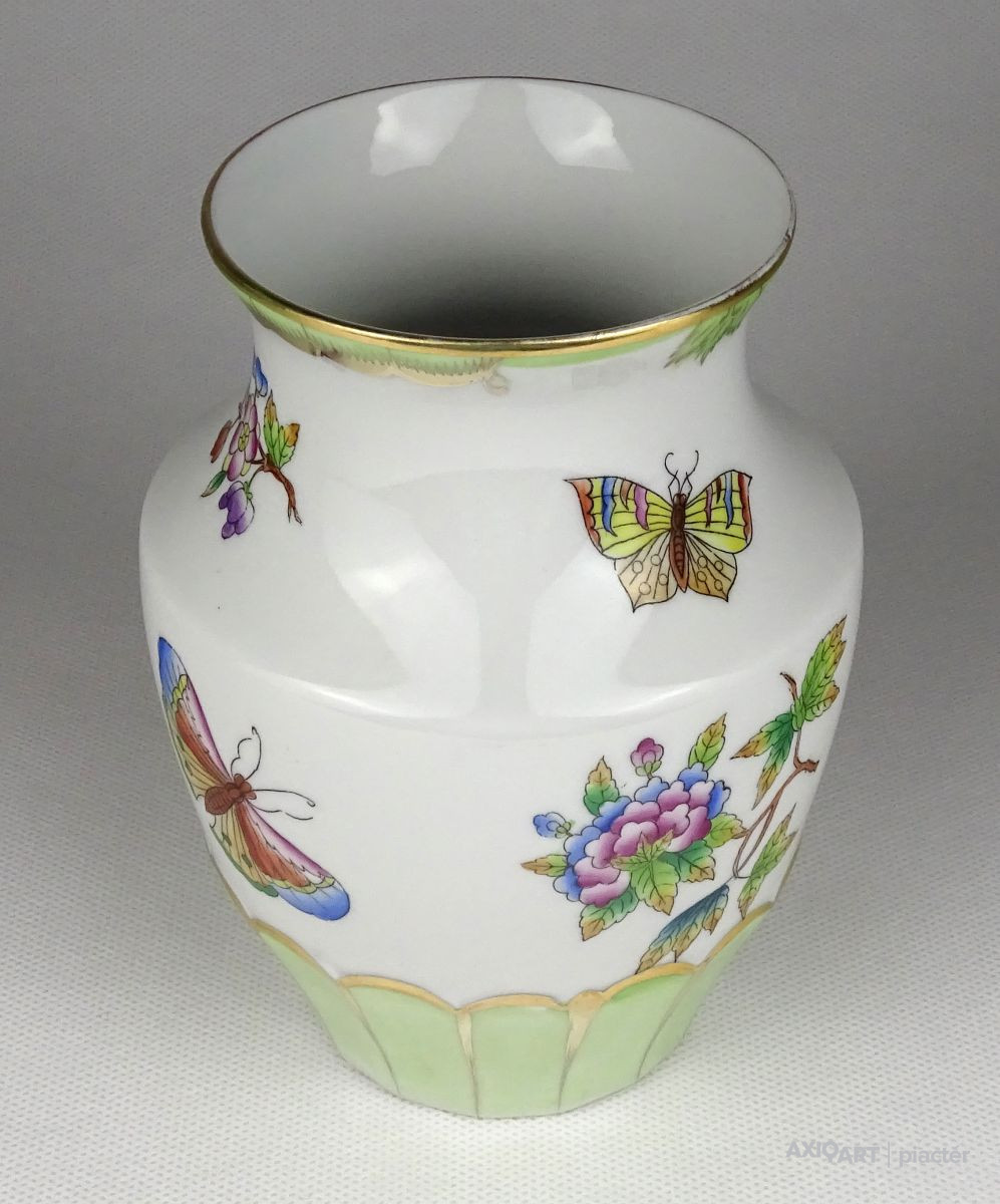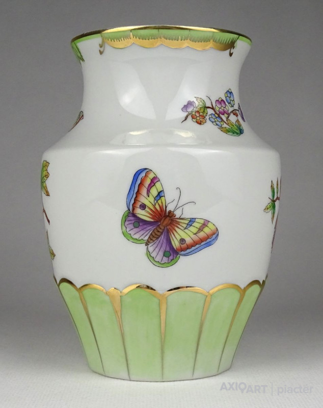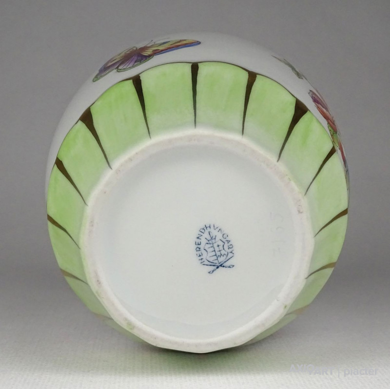 [1B457/VTR-12] Hibátlan állapotú, kézzel festett pillangós mintával díszített Herendi porcelán váza. Alján kék Herendi jelzés: HEREND HUNGARY Formaszám kékkel: 7003/LVF Mélynyomással: HEREND Díszítő motívum: LVF = VICTORIA, PAPILLONS ET FLEURS (Viktória, pillangók és virágok) Magasság: 14 cm Szélesség: 8.3 cm Súly: 0.265 kg