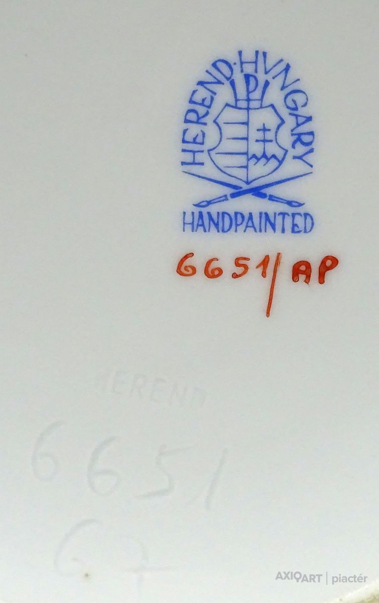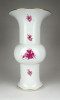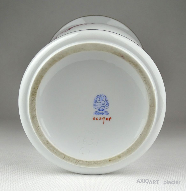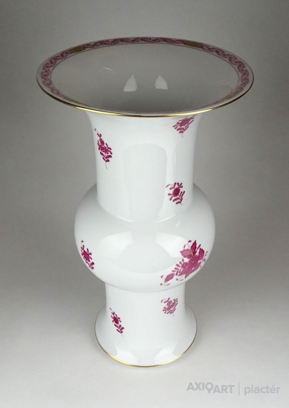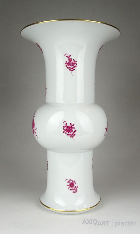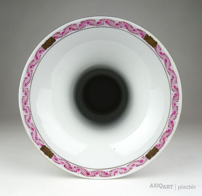 [1E489/BX-8] Hibátlan állapotú, nagy méretű lila Apponyi mintás Herendi porcelán váza, díszváza. Aranyozása is kopásmentes, ajándékozható állapotban van. Alján kék Herendi jelzés: HEREND HUNGARY HANDPAINTED Mélynyomással: HEREND Formaszám pirossal: 6651/AP Magasság: 34.5 cm Szélesség: 19.5 cm Súly: 1.665 kg