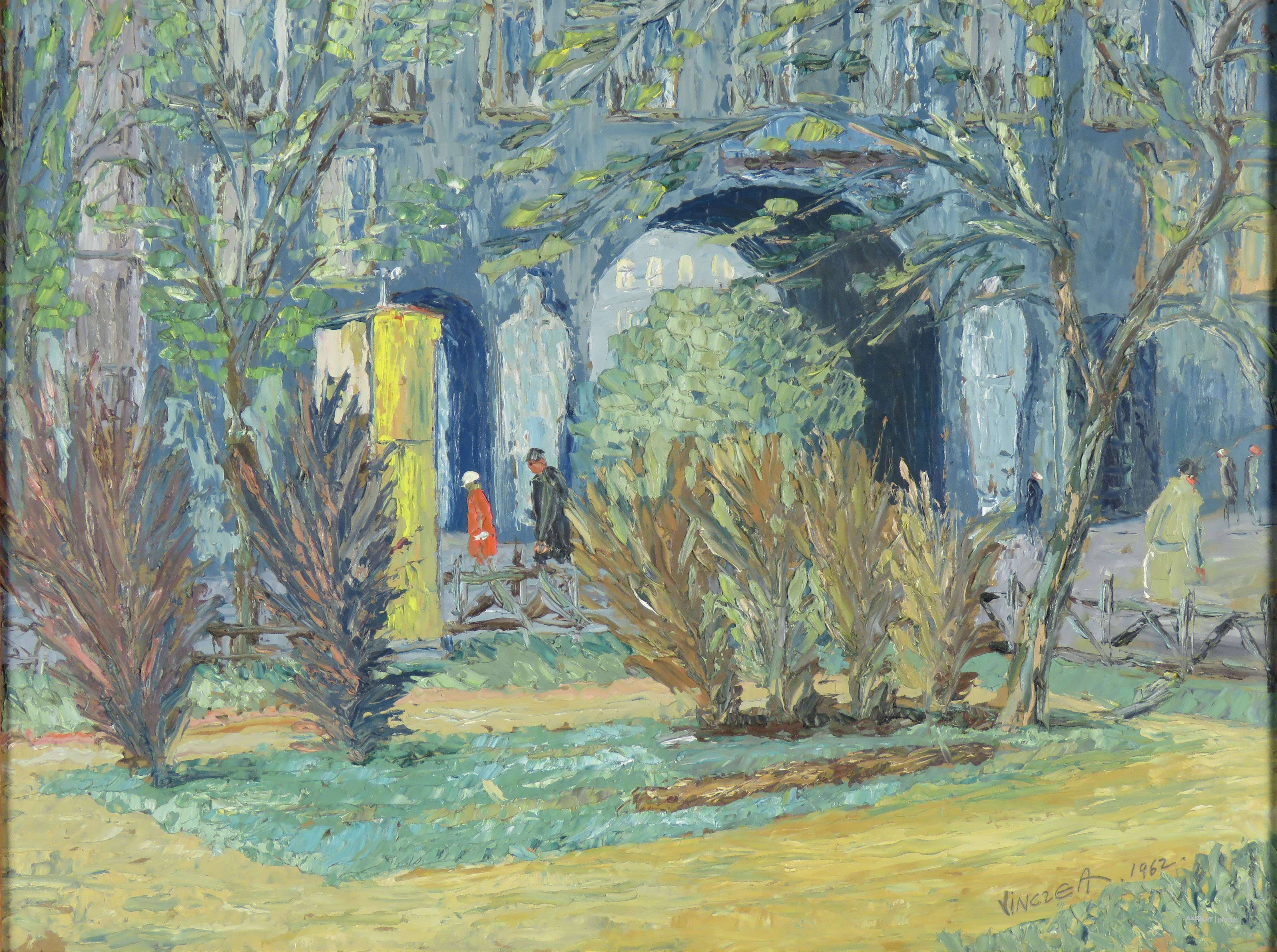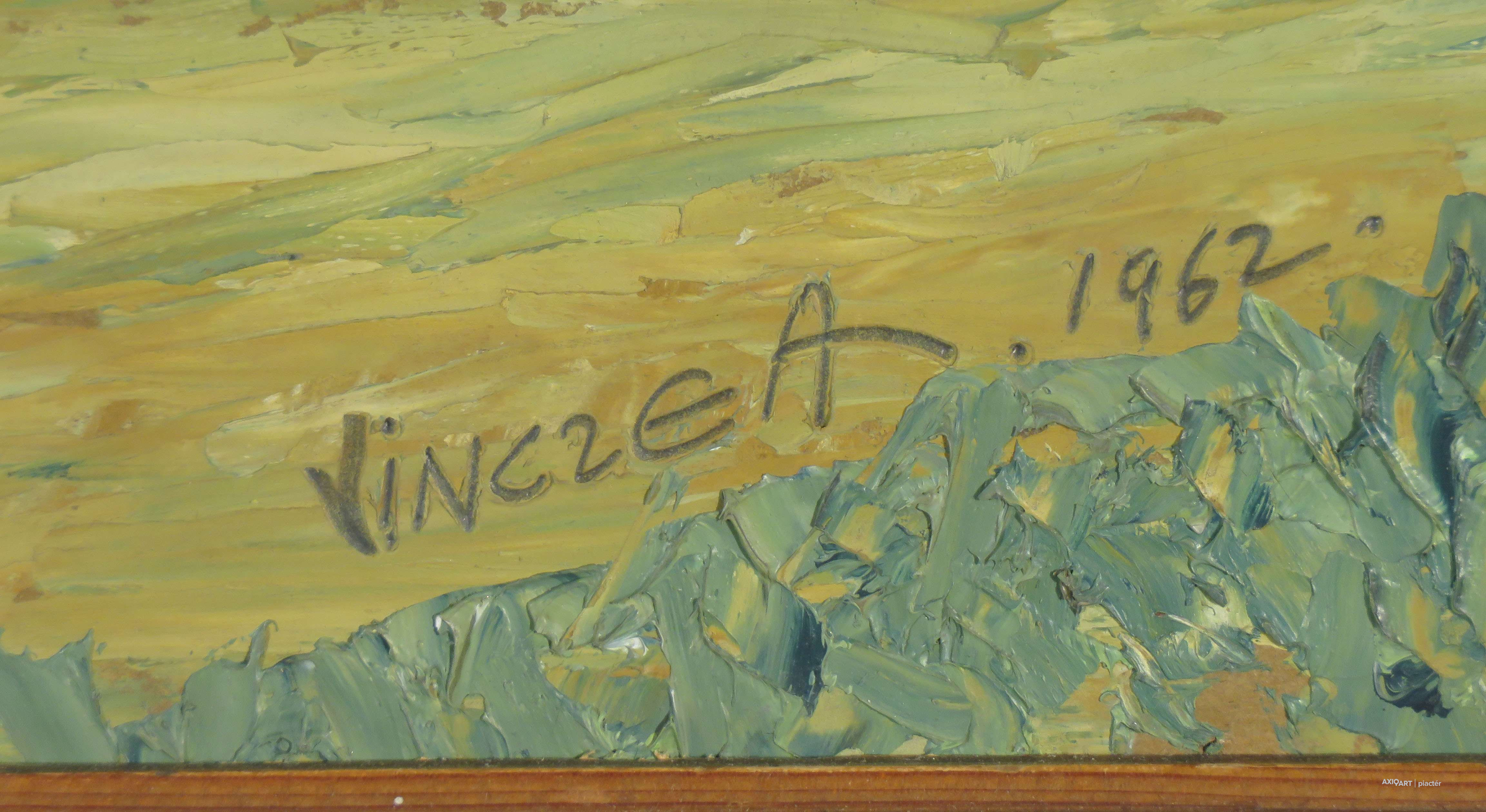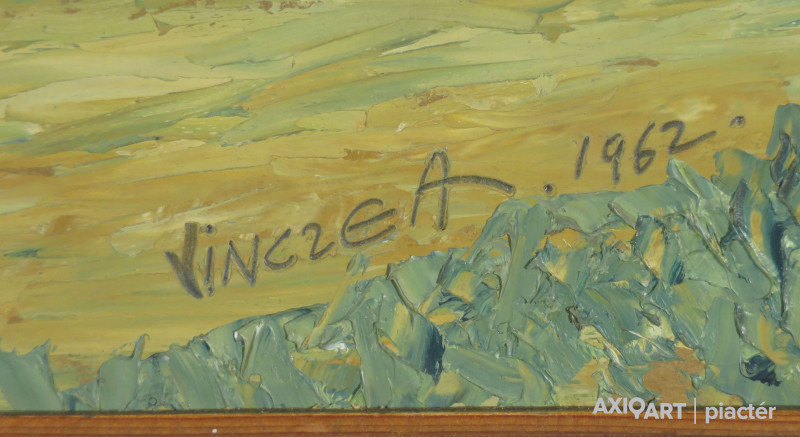 [FKC973/Bp67/36] A kép mérete: 40 x 53 cm keret nélkül. Készült: Olaj, Karton A kép Vincze András (Feled, 1914, Szeged, 1987) alkotása. Jelezve jobbra lent "Vincze A. 1962" A festmény jó állapotban van. Keret: Ép Magyar festők és grafikusok életrajzi lexikona I-II. Festő. Nagy István hatására kezdett festeni Baján, majd beiratkozott a fővárosi Képzőművészeti Főiskolára, ahol Rudnay tanítványa volt. Több mint két évtizeden keresztül Baján tevékenykedett, ezért munkáiban szereplő bajai témák révén az itteni táj és környezet, haláláig híven tükröződtek. 1954-ben Szegedre került. 1949-től rendszeresen szerepelt kiállításokon, egyéni és koll. rendezvényeken. Számos szegedi és bajai tárlatokon mutatta be munkáit, 1967-ben a Magyar Nemzeti Galériában is, a Szegedi Képzőművészek kiállítása keretén belül. Korai alkotásai főleg baja- és szeged-környéki tájképek voltak. Későbbi olajfestményein elvontabb, szürreálisabb képi világot alakított ki. Fametszeteket is készített, melyek témáját leggyakrabban az egyszerű emberek életéből merítette. 1973-ban a Szegedi Nyári Tárlaton kiállított alkotásaira Alkotói-díjat kapott. Több műve a szegedi és bajai múzeumokban, valamint a Magyar Nemzeti Galériában kapott helyet. (SzZ-SzK, Gyulai Gergely adatgyűjtése nyomán) Magyar festők és grafikusok életrajzi lexikona I-II. Műgyűjtők és kereskedők kézikönyve Festő. Nagy István hatására kezdett festeni Baján, majd beíratkozott a bp.-i Képzőművészeti Főiskolára, hol Rudnay Gyula tanítványa volt. Több mint két évtizeden keresztül Baján tevékenykedett, ezért alkotásaiban szereplő bajai témák révén az itteni táj, valam. környezet, mindmáig híven tükröződik. 1947-ben és 1950-ben mutatkozott be Baján. 1954-ben Szegedre került. 1973-ban a Szegedi Nyári Tárlaton bemutatott műveire Alkotói-díjat kapott. Több műve a szegedi és bajai múzeumokban, val. a MNG-ban kapott helyet. (SzZ-SzK) Magyar festők és grafikusok adattára Festeni Baján, Nagy István befolyására kezdett, majd Rudnay Gyula biztatására a képzőművészetet választotta hivatásul. 24 évig élt Baján, ezért festményeiben és grafikáiban szereplő bajai témák révén az itteni táj, környezet, mindmáig híven tükröződik. Ez elsősorban az 1947-ben, majd 1950-ben rendezett első bajai tárlatain mutatkozott meg. 1954-ben került Szegedre. Az 1973-as Szegedi Nyári Táraton szereplő festményeire Alkotói-díjat kapott. 1974 év végén a Móra Ferenc Képtárban gyűjteményes kiállítást rendezett. Művei közül több a szegedi és bajai múzeumokban, valamint a Nemzeti Galériába került. - Irod.: Szelesi Zoltán: Szeged Képzőművészete. Szeged, 1975. Művész életrajzok kortárs magyar képzőművészek Nagy István és Rudnay Gyula hatására kezdett festeni Baján, majd egy ideig Kecskeméten, jelenleg Szegeden dolgozik. 1948 óta szerepel kiállításokon; kisebb egyéni tárlatok mellett 1969-ben és 1974-ben Szegeden, 1970-ben Baján voltak gyűjteményes jelentkezései. Önálló tárlatokkal mutatkozott be Jugoszláviában, Lengyelországban és a Szovjetunióban. - Műveit a valóság motívumaiból absztrahált szubjektív megjelenítés, újabban filozófikus-szürrealisztikus hangvétel jellemzi. Nagyobb fameszet-sorozaton dolgozta fel a szegedi népélet eseményeit.
