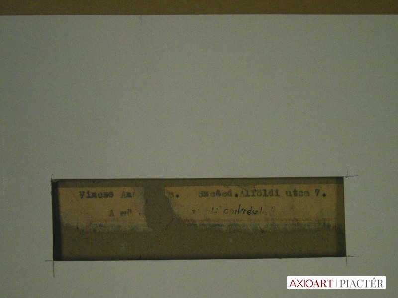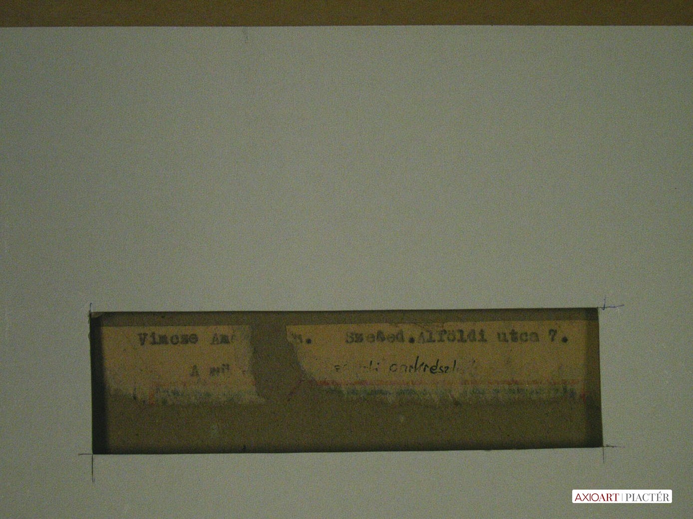 [FK1032/Bp62/6] A kép mérete: 40 x 49 cm keret nélkül. Készült: Pasztell, Papír A kép Vincze András (Feled, 1914, Szeged, 1987) alkotása. Jelezve: Jelzés nélkül A festmény jó állapotban van. Keret: Ép Hátoldalon a művész raglapjának maradványa látható. Magyar festők és grafikusok életrajzi lexikona I-II. Festő. Nagy István hatására kezdett festeni Baján, majd beiratkozott a fővárosi Képzőművészeti Főiskolára, ahol Rudnay tanítványa volt. Több mint két évtizeden keresztül Baján tevékenykedett, ezért munkáiban szereplő bajai témák révén az itteni táj és környezet, haláláig híven tükröződtek. 1954-ben Szegedre került. 1949-től rendszeresen szerepelt kiállításokon, egyéni és koll. rendezvényeken. Számos szegedi és bajai tárlatokon mutatta be munkáit, 1967-ben a Magyar Nemzeti Galériában is, a Szegedi Képzőművészek kiállítása keretén belül. Korai alkotásai főleg baja- és szeged-környéki tájképek voltak. Későbbi olajfestményein elvontabb, szürreálisabb képi világot alakított ki. Fametszeteket is készített, melyek témáját leggyakrabban az egyszerű emberek életéből merítette. 1973-ban a Szegedi Nyári Tárlaton kiállított alkotásaira Alkotói-díjat kapott. Több műve a szegedi és bajai múzeumokban, valamint a Magyar Nemzeti Galériában kapott helyet. (SzZ-SzK, Gyulai Gergely adatgyűjtése nyomán) Magyar festők és grafikusok életrajzi lexikona I-II. Műgyűjtők és kereskedők kézikönyve Festő. Nagy István hatására kezdett festeni Baján, majd beíratkozott a bp.-i Képzőművészeti Főiskolára, hol Rudnay Gyula tanítványa volt. Több mint két évtizeden keresztül Baján tevékenykedett, ezért alkotásaiban szereplő bajai témák révén az itteni táj, valam. környezet, mindmáig híven tükröződik. 1947-ben és 1950-ben mutatkozott be Baján. 1954-ben Szegedre került. 1973-ban a Szegedi Nyári Tárlaton bemutatott műveire Alkotói-díjat kapott. Több műve a szegedi és bajai múzeumokban, val. a MNG-ban kapott helyet. (SzZ-SzK) Magyar festők és grafikusok adattára Festeni Baján, Nagy István befolyására kezdett, majd Rudnay Gyula biztatására a képzőművészetet választotta hivatásul. 24 évig élt Baján, ezért festményeiben és grafikáiban szereplő bajai témák révén az itteni táj, környezet, mindmáig híven tükröződik. Ez elsősorban az 1947-ben, majd 1950-ben rendezett első bajai tárlatain mutatkozott meg. 1954-ben került Szegedre. Az 1973-as Szegedi Nyári Táraton szereplő festményeire Alkotói-díjat kapott. 1974 év végén a Móra Ferenc Képtárban gyűjteményes kiállítást rendezett. Művei közül több a szegedi és bajai múzeumokban, valamint a Nemzeti Galériába került. - Irod.: Szelesi Zoltán: Szeged Képzőművészete. Szeged, 1975. Művész életrajzok kortárs magyar képzőművészek Nagy István és Rudnay Gyula hatására kezdett festeni Baján, majd egy ideig Kecskeméten, jelenleg Szegeden dolgozik. 1948 óta szerepel kiállításokon; kisebb egyéni tárlatok mellett 1969-ben és 1974-ben Szegeden, 1970-ben Baján voltak gyűjteményes jelentkezései. Önálló tárlatokkal mutatkozott be Jugoszláviában, Lengyelországban és a Szovjetunióban. - Műveit a valóság motívumaiból absztrahált szubjektív megjelenítés, újabban filozófikus-szürrealisztikus hangvétel jellemzi. Nagyobb fameszet-sorozaton dolgozta fel a szegedi népélet eseményeit.