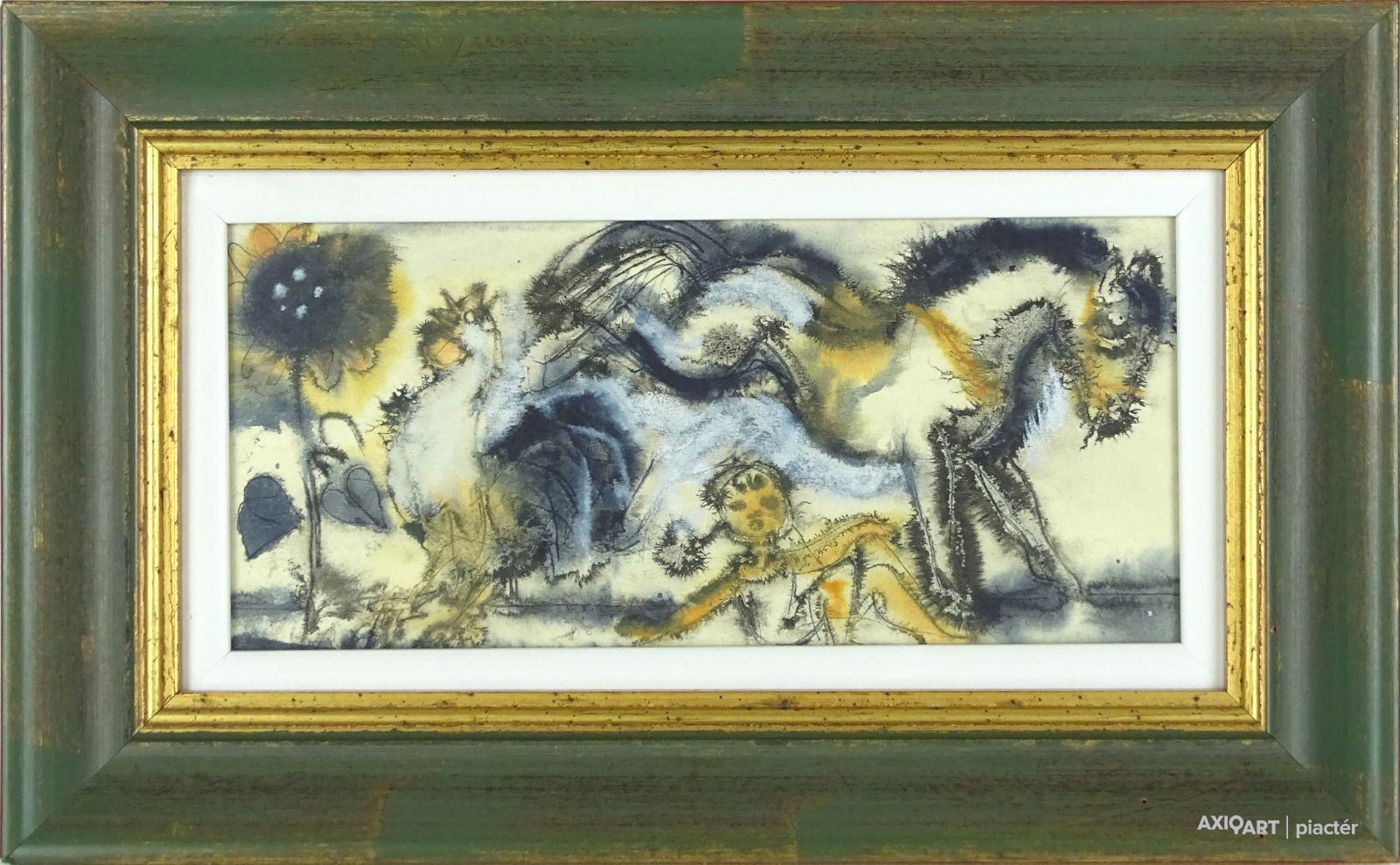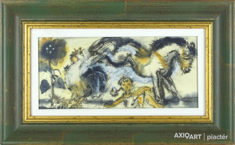 Papír tus, akvarell vegyestechnika üveglap mögött, zöld keretben. Azonnal falra akasztható állapotban van.