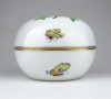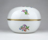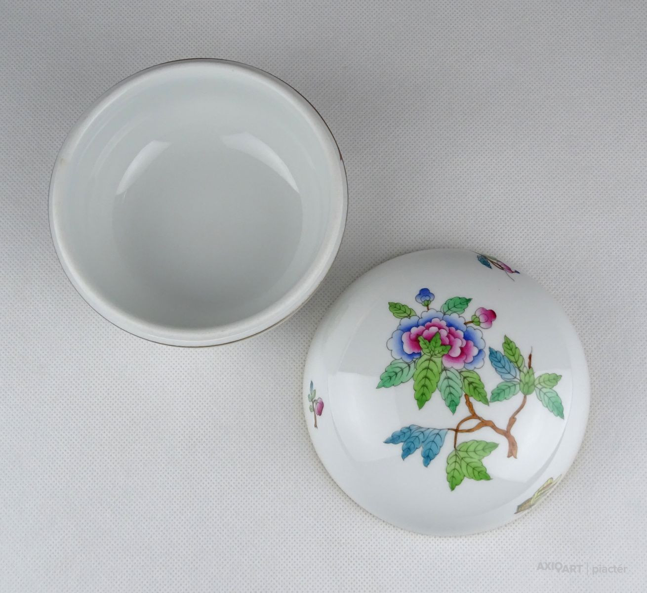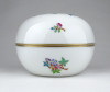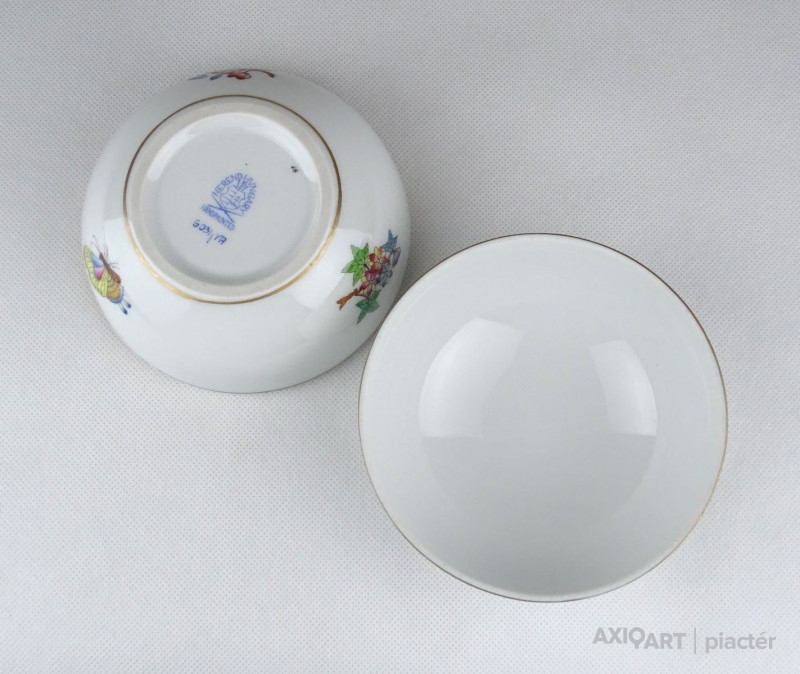 [0Z427/BX-8] Hibátlan állapotú, jelzett, nagyméretű, aranyozott, kézzel festett, virág mintás Herendi porcelán bonbonier. Teljesen hibátlan, azonnal ajándékba adható állapotban van. Alján kék Herendi márkajelzés: HEREND HUNGARY HANDPAINTED Formaszám: 6031/VA Magasság: 8.5 cm Szélesség: 11.5 cm Súly: 0.39 kg