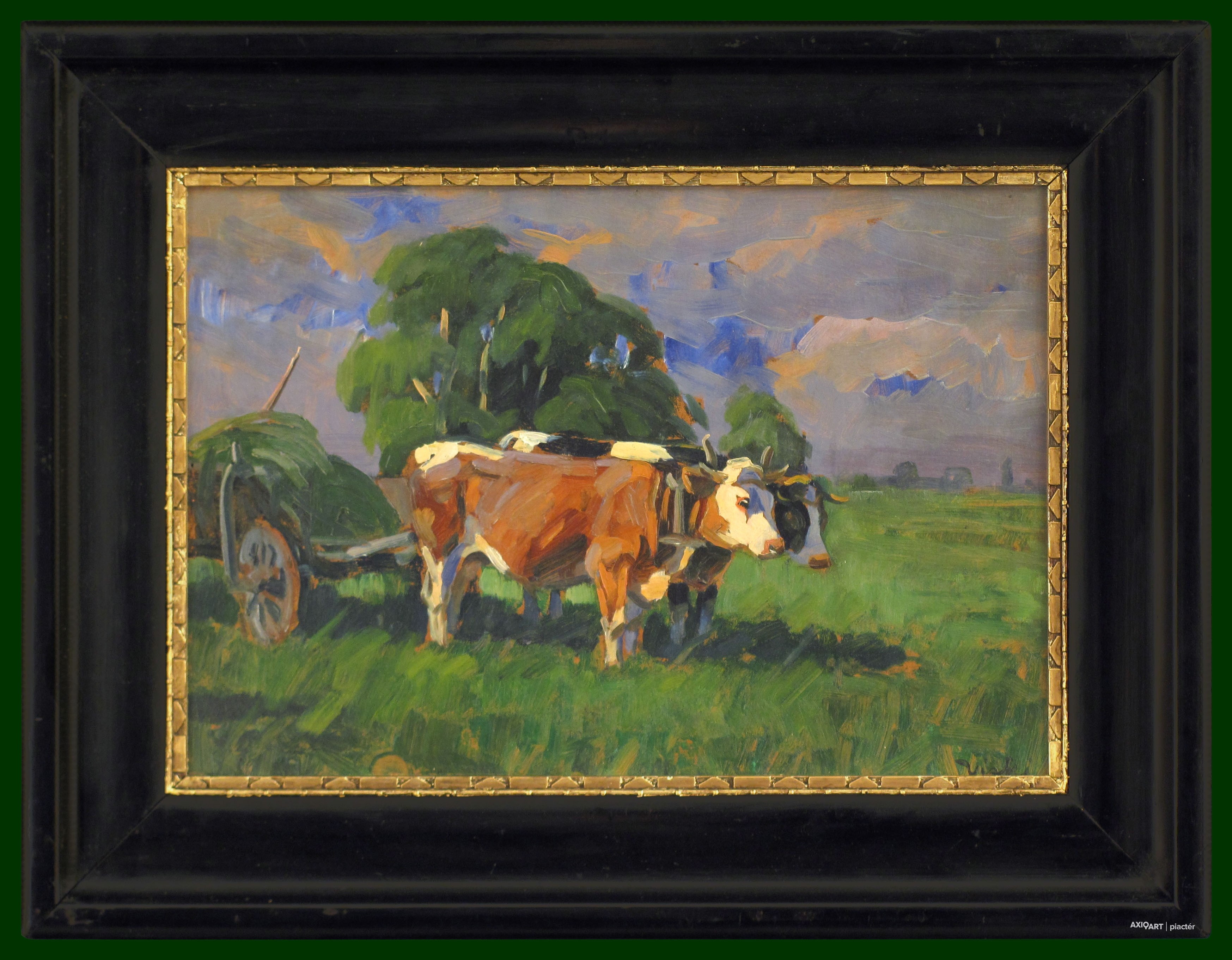 [FK2739/FL-4] A kép mérete: 33 x 48,5 cm keret nélkül. Készült: Olaj, Karton A kép Viski János (Szokolya, 1891, Budapest, 1970) alkotása. Jelezve Jobbra lent "Viski" A festmény jó állapotban van. Keret: Ép Magyar festők és grafikusok életrajzi lexikona I-II. Festő. A budapesti Képzőművészeti Főiskola Rajztanárképző szakán Zemplényi Tivadar növendéke volt. 1912-ben a kecskeméti művésztelep nyári tanfolyamán Olgyai Ferenc és Iványi-Grünwald Béla korrigálta. Tanulmányúton járt Franciaországban. 1913-tól főleg naturalista állatképeket állított ki a budapesti Műcsarnokban és a Nemzeti Szalonban. Számos tájképet is festett. A háború után több évig Dél-Amerikában dolgozott. 1929-től Budapesten tevékenykedett. 1930-ban a Független Művészek Társasága klubjában volt gyűjteményes tárlata. 1934-ben a Műcsarnokban "Hazafelé" című alkotására megkapta a Halmos Izor zsánerdíjat. "Terelés a Hortobágyon" című képének reprodukciója az 1934-es 50 pengős bankjegyet díszítette. Az állat (főleg a ló) karaktere, mozgási formaproblémái, a szabadtéri világítás színhatásai érdekelték impresszionista festőiséggel. Leggyakoribb modellje a ló. Több munkája a Magyar Nemzeti Galéria tulajdona. Művészete a természetből indul ki, annak formáihoz hű marad, képeiből mégis kiérezhető az egyéni temperamentumformáló ereje. (Éber, PZ-SzMF, KM) Magyar festők és grafikusok adattára A Képzőművészeti Főiskolán Zemplényi Tivadar növendéke. Tanulmányutakat tett Franciaországban és Dél-Amerika számos városában. 1913 óta állított ki. Főképpen állatképeket fest, bár témakörében más műfajok is szerepelnek. Az állat karaktere, mozgási és formaproblémái, a szabadtéri világítás színhatásai érdeklik impresszionista festőiséggel. Leggyakoribb modellje a ló. Festészete a természetből indul ki, annak formáihoz hű marad, képeiből mégis kiérezhető az egyéni temperamentumformáló ereje. - Irod:: Pipics Zoltán: Száz magyar festő. Bp. 1943. Magyar festők és grafikusok életrajzi lexikona I-II. Műgyűjtők és kereskedők kézikönyve Festő. A bp.-i Képzőművészeti Főiskolán Zemplényi Tivadar növendéke volt. Tanulmányúton járt Franciaországban. 1913-tól főleg naturalista állatképeket állított ki a Műcsarnokban és a Nemzeti Szalonban. A háború után több évig Dél-Amerikában dolgozott. 1929-től Budapesten tevékenykedett. 1930-ban a Független Művészek Társasága klubjában volt gyűjteményes kiállítása. 1934-ben a Műcsarnokban "Hazafelé" című festményére megkapta a Halmos Izor genreredíjat. "Terelés a Hortobágyon" c. képének reprodukciója az 1934-es 50 pengős bankjegyet díszítette. Az állat karaktere, mozgási formaproblémái, a szabadtéri világítás színhatásai érdekelték impresszionista festőiséggel. Leggyakoribb modellje a ló. Egy képe a MNG tulajdona. Festészete a természetből indul ki, annak formáihoz hű marad, képeiből mégis kiérezhető az egyéni temperamentumformáló ereje. (Éber, PZ-SzMF) Művészeti lexikon I-IV. Festő. A Képzőművészeti Főiskolán Zemplényi Tivadarnál tanult. 1913-tól főleg naturalista állatképeket állított ki a Műcsarnokban és a Nemzeti Szalonban. 1919-29 között D-Amerikában dolgozott. 1933-ban A Független Művészek Társasága klubhelyiségében volt gyűjt. kiállítása. Történelmi témákat is festett: Koppány leveretése (1938), Rákóczi búcsúja (1941). Várakozó kocsi c. képét a Nemz. Gal. őrzi.