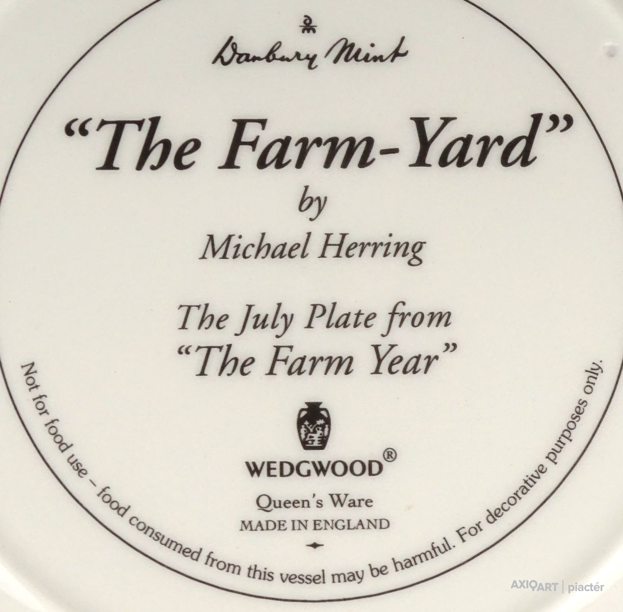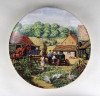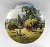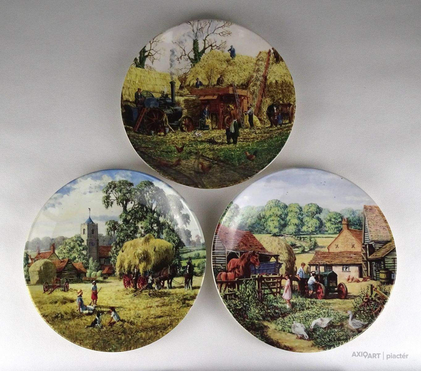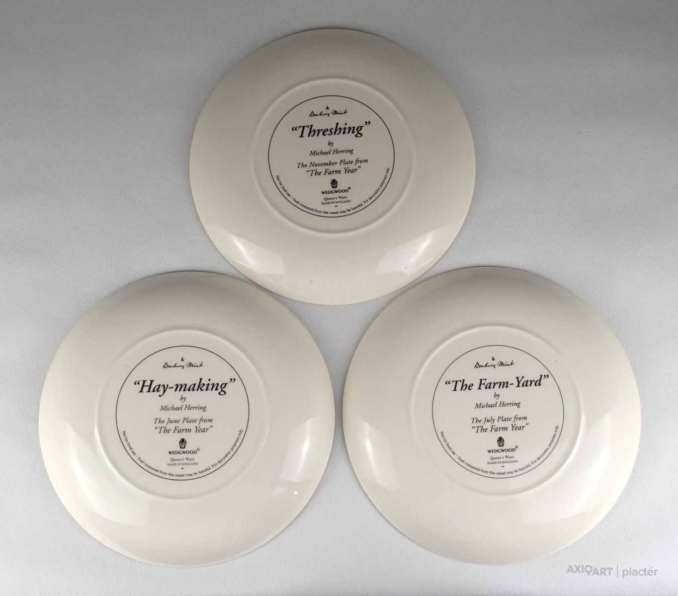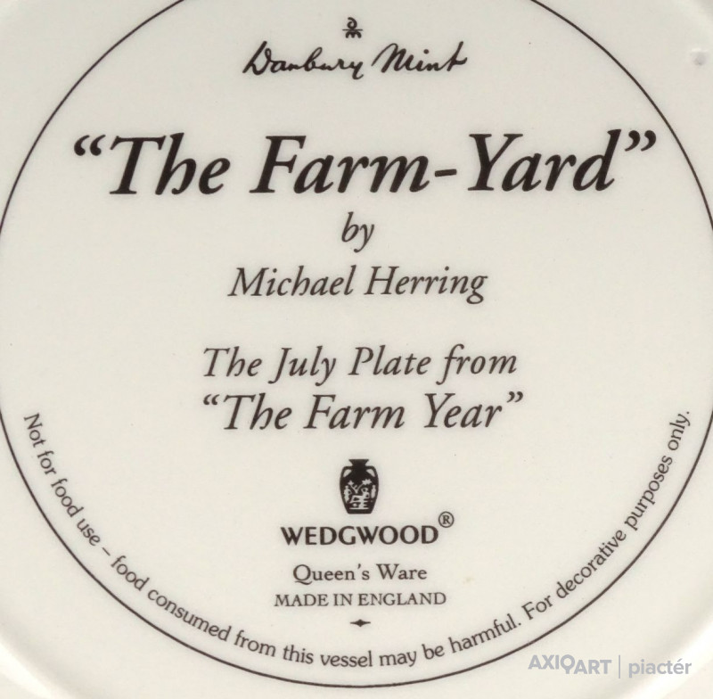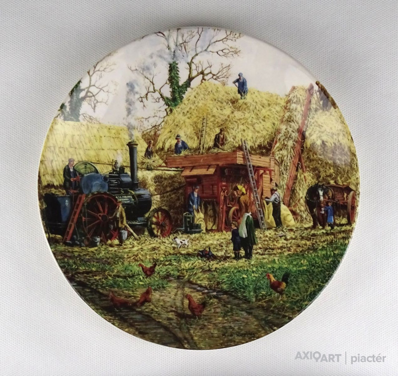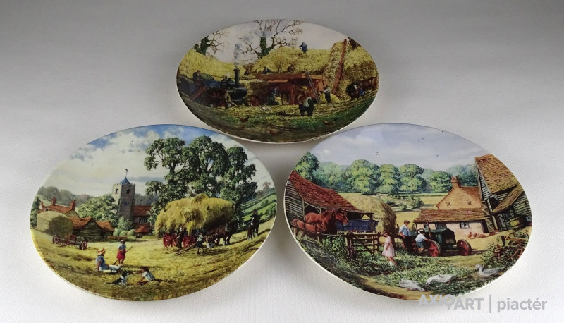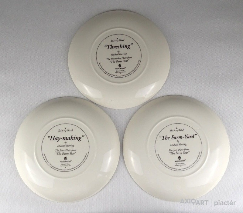 [1R628/Z041] Hibátlan állapotú, jelzett, három darab gyönyörű angol porcelán dísztányér: - HAY-MAKING (Aratás) - THRESHING (Cséplés) - THE FARM-YARD (Tanya udvar) ...BY MICHAEL HERRING THE JUNE - JULY - NOVEMBER PLATE FROM "THE FARM YEAR" Alján jelzés, felirat: WEDGWOOD QUEEN'S WARE MADE IN ENGLAND Szélesség: 20 cm Súly: 1.13 kg