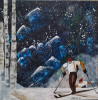 A kék „üveghegyek”, a síelők, a ragyogó hó, a végtelen terek, a mélységek kék és hófehér árnyalataival ötvöztem a téli síelés izgalmát és csendes magányát. Absztrakt és szürreális elemeket keverve idéztem meg a jeges leheletet és a friss éjszakai levegőt. A kavargó csillagok és a fagyos kék formák energiával pulzálnak, míg a síelők álomszerű hóban szelik át az utat. Szeretném, ha ez a festmény elvinné Önhöz a kalandvágyat és a nyugodt elmélkedést.