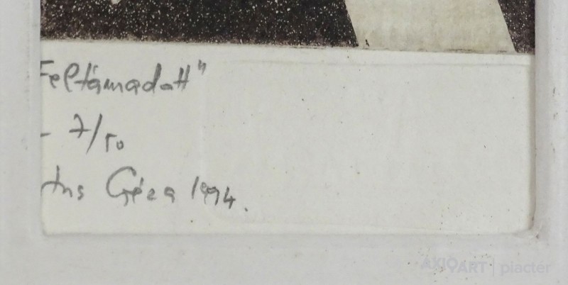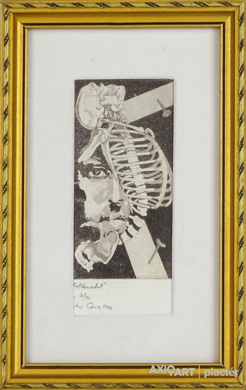 [0T560/W030] Papír rézkarc, akvatinta, mélynyomású vegyes technika, üveglap mögött, aranyozott keretben. Sorszámozott példány. Jelzés balra lent: XANTUS GÉZA "FELTÁMADOTT" CR 7/50 1994 Jelzés, száraz pecséttel: XANTUS G. Magasság: 21 cm Szélesség: 13.5 cm Súly: 0.22 kg Xantus Géza festő- és grafikusművészCsíkszereda [Miercurea Ciuc, RO], 1958-12-17Szerző: Gyulai Gergely, Gebauer Imola Honlap: http://www.xantusgeza.com/   1982-86 között kezdte el művészeti tanulmányait, mesterei: Beczásy Antal, Márkos András. 1991–95: Pázmány Péter Katolikus Egyetem, teológiai tanulmányok. 1999–2003 között római ösztöndíjas. 2003-ban a római Accademia di Belle Arti festészeti karán diplomázik, mestere prof. Nunzio Solendo. Tagja a Kisgrafika-Barátok Körének, a rot­ter­da­mi Continental Art Egye­sü­let­nek és a Ma­gyar Al­ko­tó­mű­vé­szek Or­szá­gos Egye­sü­le­té­nek. 1990-től szerepel kiállításokon. Művészetét kezdetben vallásos, transzcendentális lelkületű, sokszor balladai-szimbolikus hangvételű figurális kompozíciók jellemezték (Erdély, 1998), de római tanulmányai után a világi témák is nagy teret nyertek művészetében.  Kedvelt technikája a színes tusrajz, a pasztell, és az olaj, szívesen dolgozik aquatintával is. Foglalkozik monumentális műfajokkal: freskófestészettel, színes-üvegablak és belsőépítészeti tervezéssel, valamint köztéri szobrokat is készít. Díjak 1993 • Dicsérő Oklevél – „Varsaviana” Nemzetközi Ex libris pályázat, Varsó • II. díj –„Mohács 900 éves” Ex libris kiállítás, Mohács • A Magyar Művelődési és Közoktatási Minisztérium díja –Ex libris kiállítás, Gyula 1995 • I. díj – Ferencvárosi Művészek Pályázata, Budapest 1996 • III. díj – Rege a csodaszarvasról” meseillusztráció, Magyar Kultúra Alapítvány, Budapest 2003 • Premio Internazionale Beato Angelico, Sermoneta (I) Irodalom GÁSPÁR D.: ~ művei (kat., bev. tan., Vármegye Galéria, Budapest, 1998) KERNY T.: ~ alkotásai (kat., bev. tan., Vármegye Galéria, Budapest, 1998) SZÜCS György: Kettős honfoglalás. In: Új művészet, 1999/3, 37–39.p. SALLAY Dóra: Utak – Xantus Géza kiállítása a Római Magyar Akadémián. In: Kisgrafika, 40, 2001/2. 3–4. p. NAGY Miklós Kund: Mágikus festészet... (kat., bev. tan.), Csíkszereda Megyei Jogú Város Önkormányzata, 2006 Xantus: Égi dimenziók. szerk.: Szatmári László, Tipographic, Csíkszereda, 2008. Egyéni kiállítások Egyéni kiállítások 1991 • Köz­pon­ti Egye­te­mi Könyv­tár Ki­ál­lí­tó­ter­me, Kiel [Nemcsics Ákossal] 1993 • Művelődési Központ [Hervai Katalinnal], Szeged 1994 • Ma­gyar Kul­tu­rá­lis In­té­zet, Hel­sin­ki 1995 • Ferencvárosi Pincetárlat, Budapest 1996 • Hotel Gellért Galéria, Budapest • Ma­gyar Kul­tú­ra Ala­pít­vány, Budapest 1997 • Hadtörténeti Múzeum, Budapest 1998 • Vármegye Galéria, Budapest [Miholcsa Józseffel] (kat.) 1999 • Győri Könyvtár [Miholcsa Józseffel], Győr 2001 • Római Magyar Akadémia, Róma • Pro Art Galéria, Gyergyószentmiklós 2002 • Caffè Pe­rù [Kesselyák Ri­tá­val], Ró­ma 2003 • Pro Art Galéria, Gyergyószentmiklós 2004 • Bernády Ház, Marosvásárhely • Vármegye Galéria, Budapest 2006 • Csíki Székely Múzeum, Csíkszereda 2008 • Helios Galéria, Temesvár • Művészeti Múzeum, Arad • Ave Art Galéria, Csíkszereda.   Válogatott csoportos kiállítások Válogatott csoportos kiállítások 1990 • Biblioteca Nazionale Universitaria di Torino, Torino (I) 1991 • Fung Ping Shan Museum, Honkong 1992 • Hokkaido Municipal Library, Sapporo (J) • Casa Golfreichs, Barcelona 1993 • The First International Print Biennal, Maasricht (NL) • Sint Niklaas (B)   1995 • Museum of Applied Arts, Belgrád 1996 • Céhtörténeti Múzeum, Kézdivásárhely 1997 • Muzeum Miastra Ostrowa Wielkopolskiego, Ostrów Wielkopolski (PL) 2000 • Rassegna Internazionale de Arte contemporanea, Rocca di Cava (I) 2002 • Galeria Desirèe, Frascati (I) 2004 • Csíki Székely Múzeum, Csíkszereda 2006 • Csíki Székely Múzeum, Csíkszereda 2007 • Vármegye Galéria, Budapest 2008 • Iparművészeti Múzeum, Budapest 2009 • Vármegye Galéria, Budapest. Forrás: artportal.hu