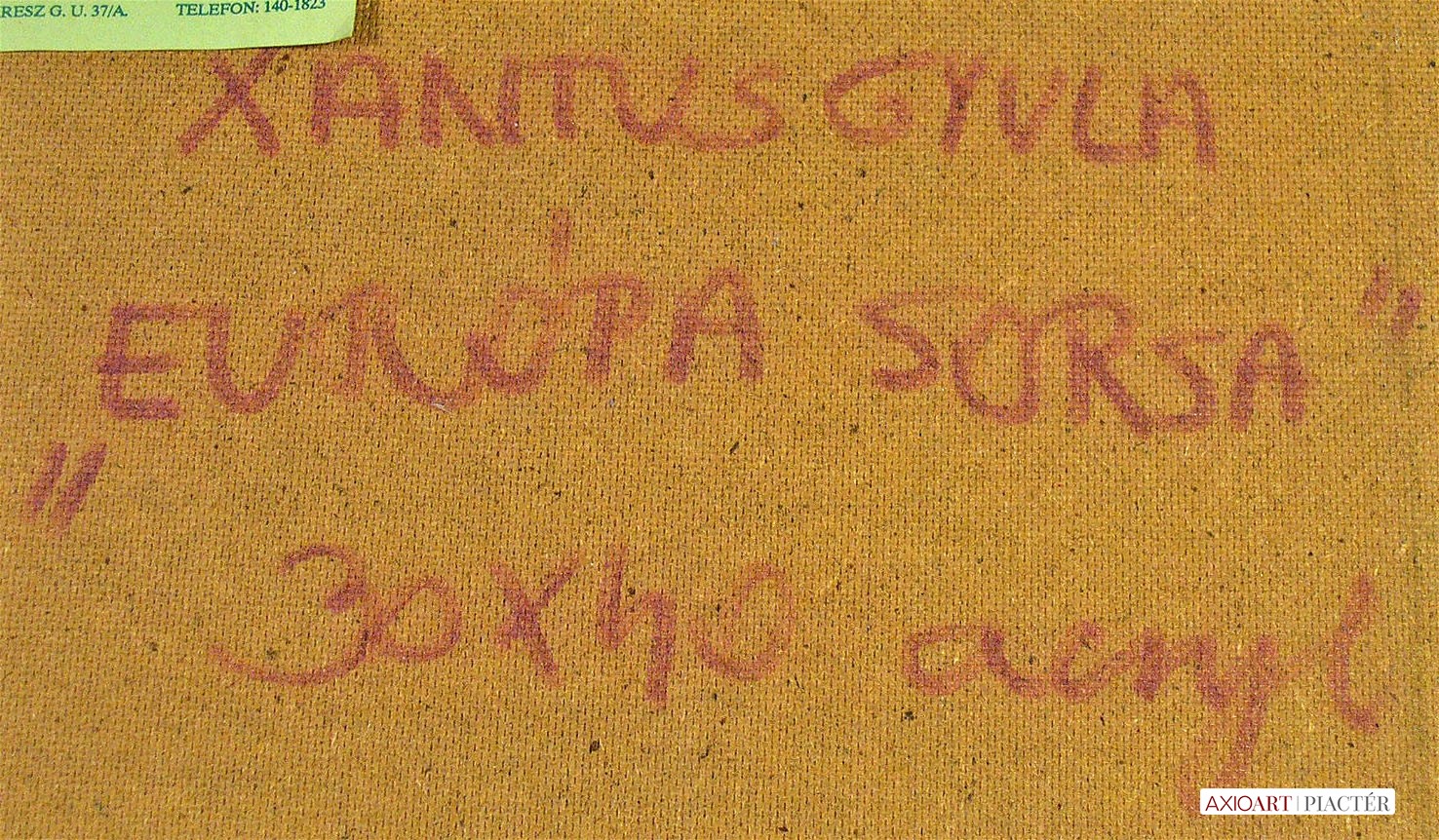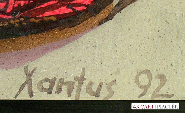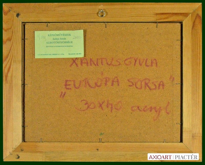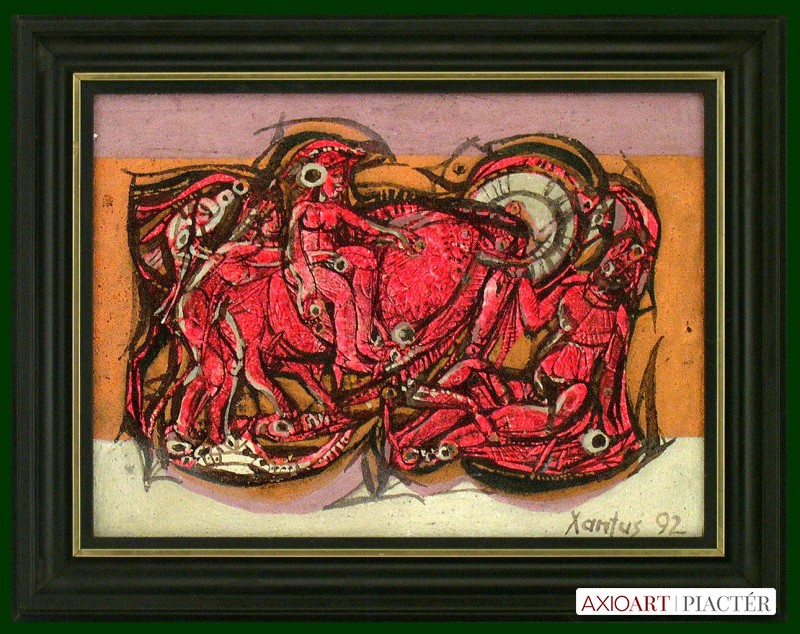 [FK1418/Bp49/1] A kép mérete: 30 x 40 cm keret nélkül. Készült: Akrill, olaj, tempera, Farost A kép Xantus Gyula (Borosbenedek, 1919, Budapest, 1993) alkotása. Jelezve Jobbra lent "Xantus 92" A festmény jó állapotban van. Keret: Új A festmény hátoldalán a Szőnyi I. Alkotóközösség raglapja található. Magyar festők és grafikusok életrajzi lexikona I-II. Festő, grafikus. A Magyar Képzőművészeti Főiskolán Szőnyi István és Varga Nándor Lajos oktatta. 1946-ban végzett. 1947-50 között középiskolai tanár volt, 1960-62 között az Országos Pedagógiai Intézet Vizuális Nevelési Tanszékének vezetőjeként működött. 1963-tól nyugdíjazásáig a Képzőművészeti Főiskola tanára volt. Tanulmányúton járt számos kelet- és nyugat-európai országban. 1954 óta szerepel egyéni (Fényes Adolf Terem, Csók Galéria, Ernst Múzeum, Mednyánszky Terem, Somogyapáti, Siklós, Mohács, Szigetvár, Kaposvár, Veszprém, Miskolc, Tata, Salgótarján, Hódmezővásárhely, Pécs, Tokaj, Debrecen, Békéscsaba, Kisvárda, Mátészalka, Nyíregyháza, Vásárosnamény, Szerencs, Kazincbarcika, Boglárlelle, Cegléd, Kapuvár, Győr, Csorna, Biharkeresztes, Simontornya, Mosonmagyaróvár, Rakamaz, Fehérgyarmat, Kisújszállás, Nyírbátor, Berettyóújfalu, Nagykálló, stb.) tárlatokon. Festészetére hatott a klasszikus művészet, gyakorta jelentek meg képein a mitológia alapjai, éppúgy, mint a népművészet formavilága és hiedelmei. Igen nagy kompozíciós fegyelemmel építette fel képszerkezeteit. Díjak: SZOT-díj; Székely Bertalan-díj és -emlékérem; Kiváló Népművelő kitüntetés; a Munka Érdemrend fokozata. A tokaji római katolikus templomba seccót festett. Műveit őrzi a Magyar Nemzeti Galéria, a Bihari Múzeum, a Simontornyai Vármúzeum, a csornai Városi Műgyűjtemény és a győri Xantus János Múzeum. (Szíj Rezső: X. Gy./Budapest, 1977, MÉ) Magyar festők és grafikusok életrajzi lexikona I-II. Műgyűjtők és kereskedők kézikönyve Festő és grafikus. A bp.-i Képzőművészeti Főiskolán Szőnyi István tanítványa volt. Szimbólikus, szűrrealisztikus festményeket és grafikákat készít. 1954-1963 k. az Országos Pedagógiai Intézet vizuális nevelési tanszékének vezetőjeként tevékenykedett. 1963-tól a bp.-i Képzőművészeti Főiskola tanára. Tanulmányúton járt számos kelet- és nyugat európai országban. 1954 óta szerepel hazai és külföldi tárlatokon (Fényes Adolf Terem-1957, Csók Galéria-1961, Ernst Múzeum-1968 gyűjteményes kiállítások). 1968-ban SZOT-díjat, 1969-ben Székely Bertalan-emlékérmet kapott. (MÉ) Magyar festők és grafikusok adattára A Képzőművészeti Főiskolán Szőnyi István növendéke volt. Szimbolikus, szürrealisztikus festményeket és grafikákat készít. A művészeti nevelés és a rajzoktatás problémáival is foglalkozik. 1945-1963 között az Országos Pedagógiai Intézet vizuális nevelési tanszékének vezetője volt. 1963 óta a Képzőművészeti Főiskola tanára. Tanulmányúton járt számos kelet- és nyugat-európai országban. 1954 óra kiállító művész, számos vidéki bemutatója (Hódmezővásárhely, Debrecen, Pécs, Szeged, Veszprém, Kaposvár stb.) mellett 1957-ben a Fényes Adolf Teremben, 1961-ben a Csók Galériában, 1968-ban az Ersnt Múzeumban volt gyűjteményes kiállítása. Munkássága elismeréseként 1968-ban SZOT-díjat, 1969-ben Székely Bertalan-emlékérmet kapott. 1983. márciusában a Csók Galériában állította ki művét. Irod.: Szij Rezső: Xantus Gyula, Bp. 1977. P. Sz. T.: Művész életrajzok. Bp. 1985. Művészeti lexikon I-IV. Borosbenedek, 1919. dec. 28.- ): festő, a Képzőművészeti Főiskola pedagógiai tanszékének tanára. A Képzőművészeti Főiskolán Szőnyi István tanítványa volt. 1950-től szerepel kiállításokon. 1957-ben a Fényes Adolf Teremben, 1961-ben a Csók Galériában, 1967-ben Tokajon nyílt kiállítása. Konstruktív szellemű képein gyakran használ szimbolikus motívumokat. A művészeti nevelés kérdéseivel foglalkozik, a rajzoktatásról és a vizuális nevelés problematikájáról cikkei és kézikönyvei jelentek meg. Művész életrajzok kortárs magyar képzőművészek Festő, grafikus, SZOT-díjas, Borosbenedek, 1919. 1946-ban végzett Szőnyi István növendékeként és a művészetoktatásban vállalt állást. Tanított az Országos Pedagógiai Intézetben, és 1963-tól 1983-ig a Képzőművészeti Főiskolán. Számos kelet- és nyugat-európai országban megfordult tanulmányúton, többször járt az NDK-ban és Franciaországban. Eddig mintegy félszáz egyéni kiállítása volt, a legfontosabbak a Fényes Adolf Teremben (1957), a Csók Galériában (1961, 1983), az Ernst Múzeumban (1968), a Mednyánszky Teremben (1974) és Győrött (1981). Önálló anyaggal mutatkozott be Indiában (1969). 1968-ban SZOT-díjat, 1969-ben Székely Bertalan emlékérmet kapott. A Budapesti Műgyűjtők Egyesületének elnöke. - Művészete klasszikus és népművészeti ihletésű. Mitológiai alakjai csakúgy, mint a népművészeti motívumok, szimbolikus értékűek. E jelképes közlés a szigorú kompozíció és az érzékeny vonalvezetés nyelvén szólal meg. Kortárs magyar művészeti lexikon I-III. Festő, pedagógus. (Borosbenedek, 1919. dec. 28.-Bp., 1993. dec. 29.) 1946: MKF, mesterei: Szőnyi István, Varga Nándor. 1963: Kiváló Népművelő kitüntetés; 1968: SZOT-díj; 1969: Székely Bertalan-díj és emlékérem; 1979: Munka Érdemrend ezüst fokozata. 1947-50 között középiskolai tanár; 1950-54-ben a Bp.-i Pedagógiai Főisk. tanára; 1954-től a Pedagógiai Tud. Int. munkatársa volt. 1960-62-ben Orsz. Pedagógiai Int. Vizuális Nevelési Tanszékének vezetője; 1963-től nyugdíjazásáig az MKF tanára volt. Festészetére hatott a klasszikus művészet, gyakorta jelentek meg képein a mitológia alakjai, 