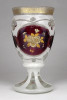 Antik talpas csiszolt bíborpácolt vastag falú Biedermeier pohár, Bieder kehely, kupa. XIX. századi kúrapohár, emlékpohár. Oldalán csiszolatok és kézi festésű díszítések láthatók.