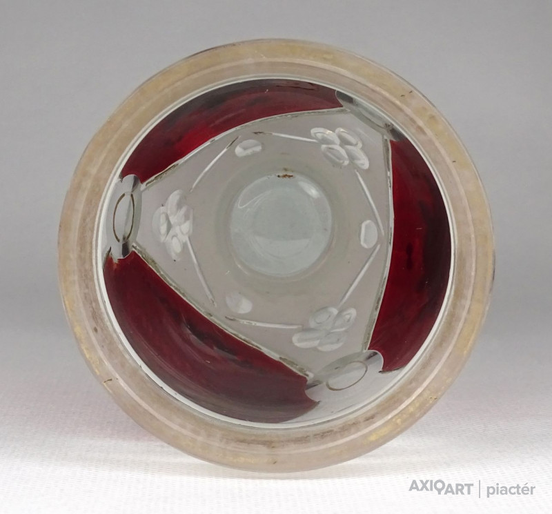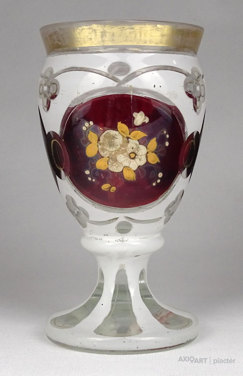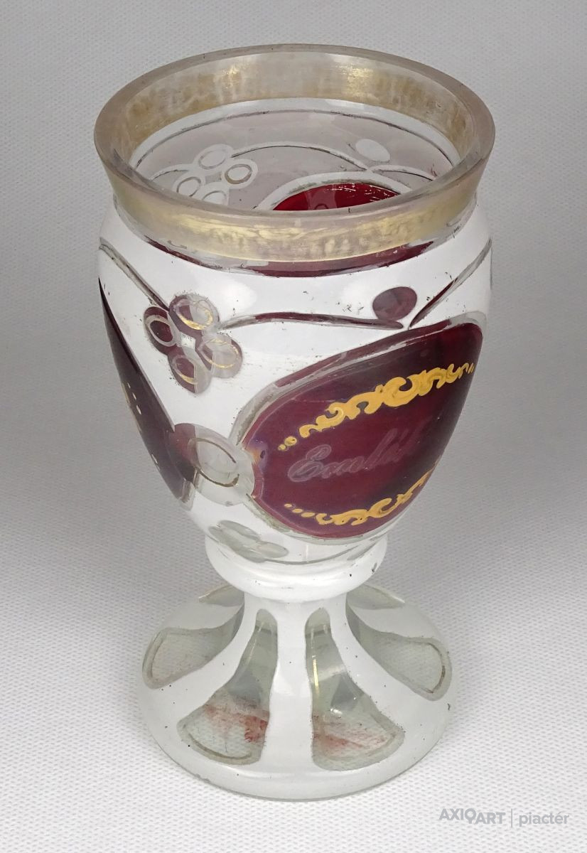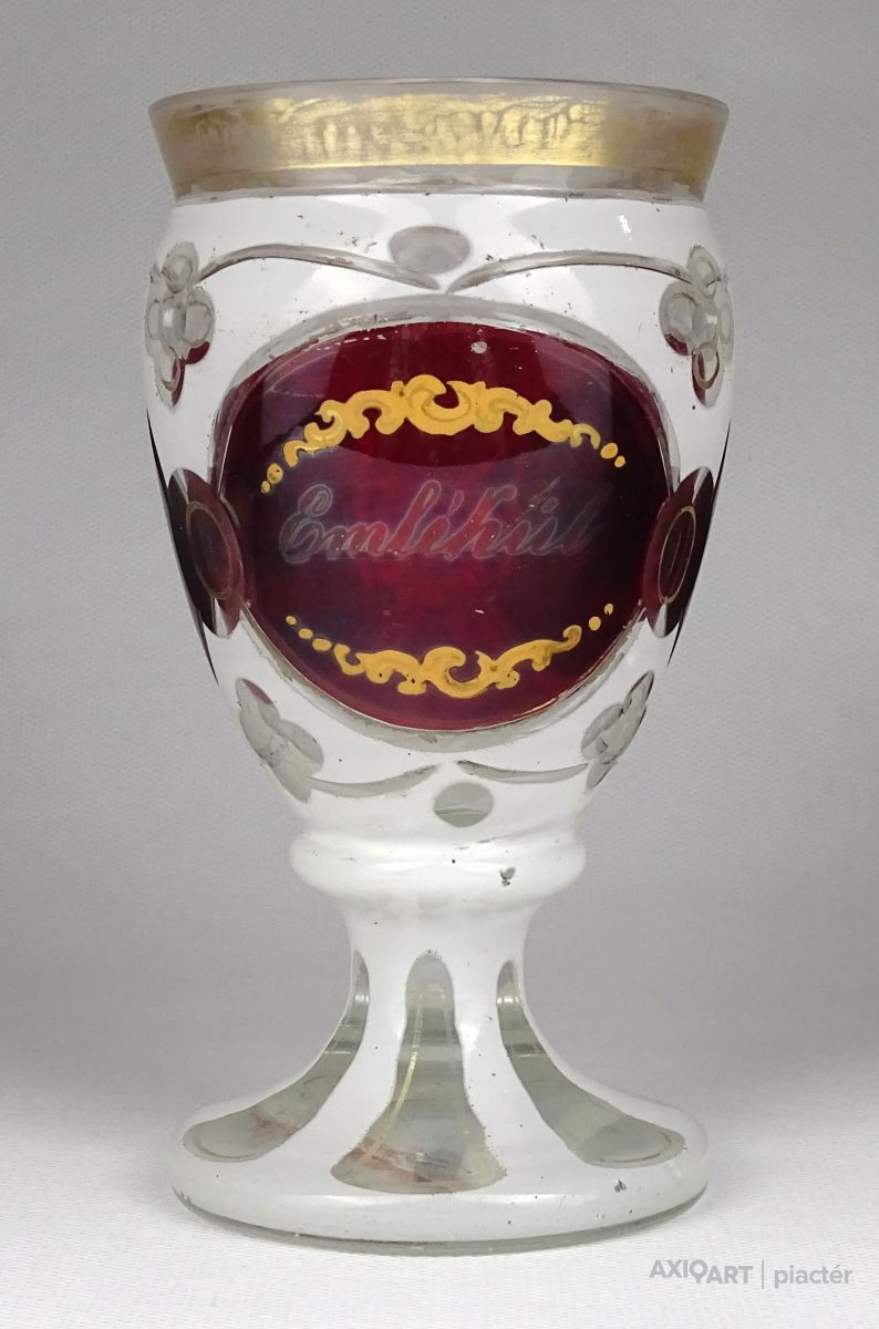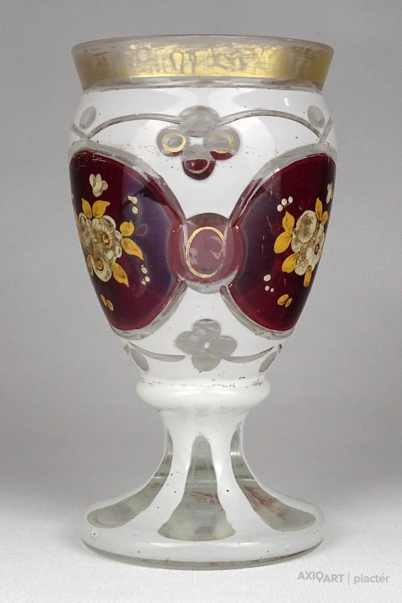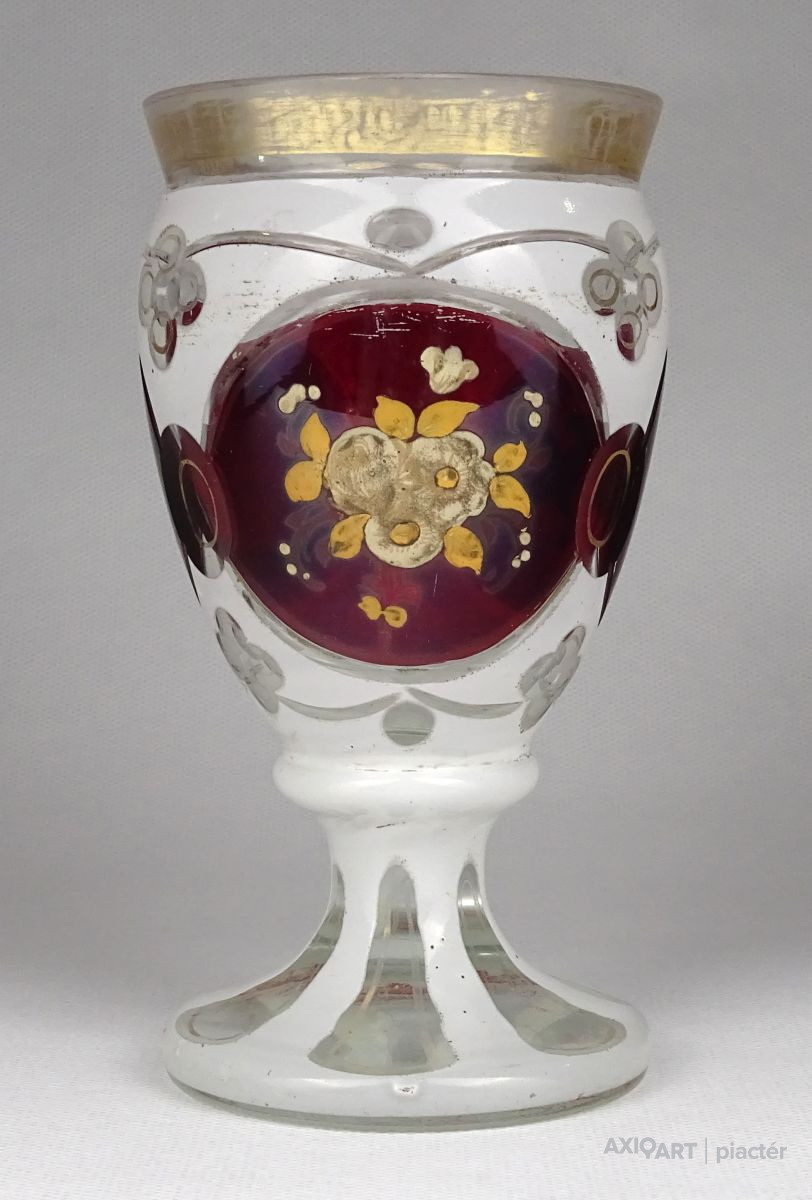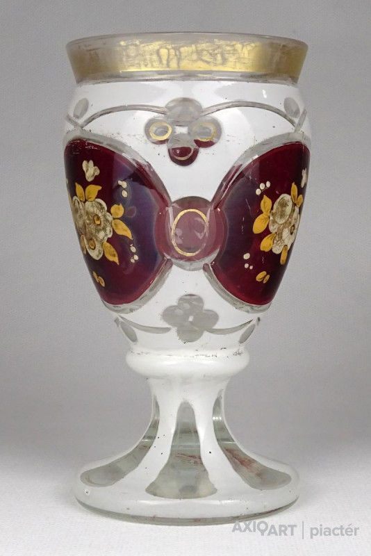 [1R734/Z040] Antik talpas csiszolt bíborpácolt vastag falú Biedermeier pohár, Bieder kehely, kupa. XIX. századi kúrapohár, emlékpohár. Oldalán csiszolatok és kézi festésű díszítések láthatók. Oldalán halvány felirat: EMLÉKÜL Magasság: 14.7 cm Szélesség: 8 cm Súly: 0.41 kg