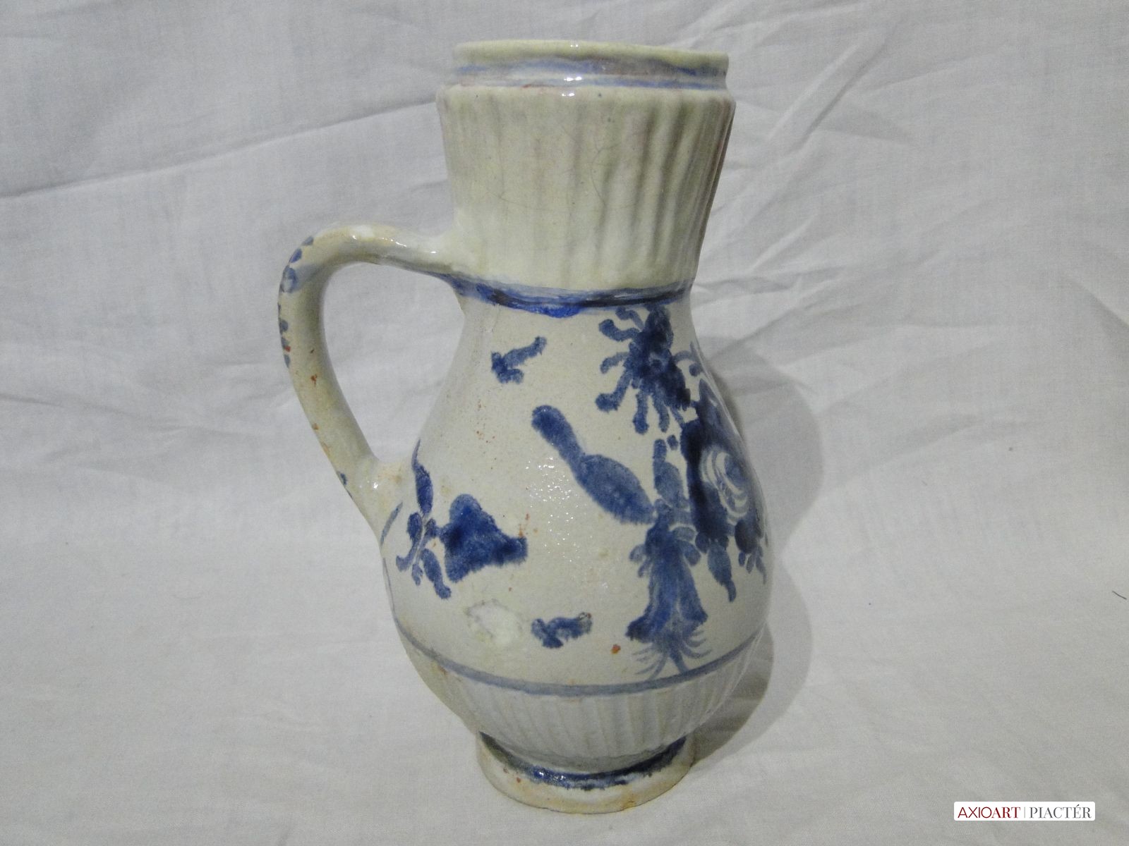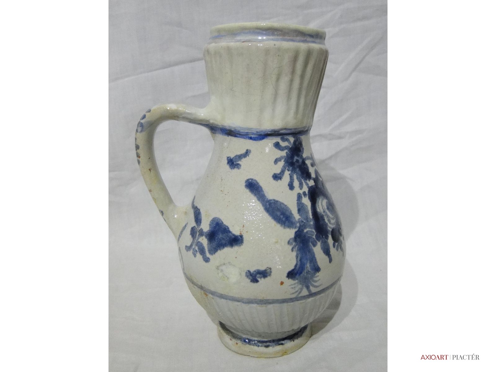 [3774/UZ-N] Virágmintás ónmázas bordázott bokály Ausztria, 1850 körüli. Restaurált a nyakánál. Magasság: 22 cm Súly: 0.637 kg