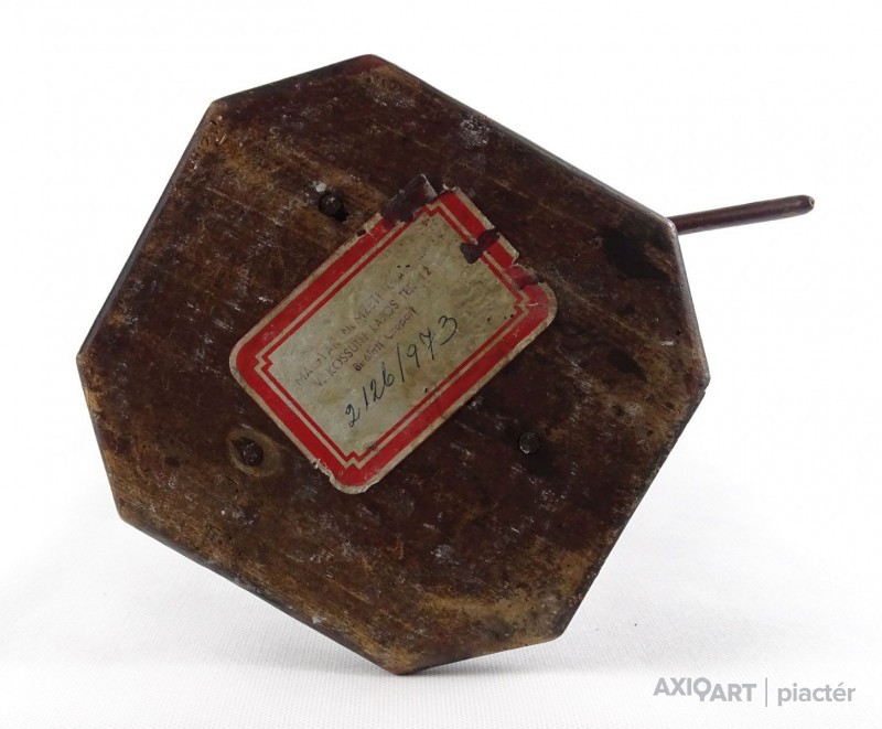 [1Y029/Z018] Olaj farost festmény, üveglap mögött, hibátlan képcsarnokos keretben. Hátoldalán Képcsarnok Vállalat papír címkéje: A művész neve: SCHÉNER MIHÁLY A kép címe: TÁJ Magasság: 66.5 cm Szélesség: 86 cm Súly: 6.54 kg Schéner Mihály festő, grafikus, szobrász, keramikus, bábtervező Medgyesegyháza, 1923-01-9 Elhalálozott: Budapest, 2009. május 11. Honlap: http://www.kormendigaleria.hu/kiadvany.html 1942-1947: Magyar Képzőművészeti Főiskola, tanára: Rudnay Gyula. 1978: Munkácsy-díj; 1984: érdemes művész; 1989: kiváló művész; 1995: Kossuth-díj. 1992-től a Magyar Művészeti Akadémia, 1993-tól a Széchenyi Irodalmi és Művészeti Akadémia tagja. 1956-ig tanított. 1982: Nagyatádi Faszobrász Alkotótelep, 1985: Nemzetközi Acélszobrász Alkotótelep, Dunaújváros. A stílusában felismerhető, mégis sokféle műtárgyat létrehozó ~ gazdag, állandóan alakuló életműve a folyton változó világban helyét kereső, az alkotói szabadságot megvalósító XX. századi képzőművész példázata lehetne. Magát expresszív-szürrealista alkotónak nevezi. Egyaránt dolgozik festékkel, textillel, fával, fémmel. Rajzol, szerkeszt, farag, épít, gyúr, varr és ragaszt, felhasználja a mézesbábok öntőformáit. Festő, rajzoló, textilszobor- és bábkészítő, fazekas, asztalos, esztergályos. Háromlépcsős folyamatban gondolkozik: rajzban tervez, majd fest, szobrot készít, “formába önt”, mindig a végső plasztikai megoldást keresi. Ami állandó és mégis játékosan változékony megjelenésű Schéner művészetében, az a gyermekkori emlékek által meghatározott népi mesterségek iránti tiszteletet kifejező motívumkincs, a tárgyi folklór formakészlete, amely már-már kézjegyként ismétlődik munkáin. Mitologikussá nőtt képzelete új lényeket teremt, pl: a Pigulát, amely disznótestű, emberfejű teremtmény. Schéner festményein a szürrealista motívumokat konstruktív szerkezetbe rendezi, a geometriát és az organikus természeti motívumokat egyaránt beépíti műveibe. A népi, népművészeti formakincsből merített lovas huszárok, betyárok, szegénylegények cifra szűr mentéje, piros csákója, fekete csizmája, az önálló életet élő zsinórdíszek és mézeskalács bábok, a kiskocsik a gyermekkori vásárok, búcsúk színes forgatagába vezet. A primér motívumokat aztán felváltják a vastagon felhordott felületbe karcolt jelek, vonalhálózatok, amelyek a játszó gyermek homokba rajzolt ábráit, a pásztorember fába vésett üzeneteit, az ősember barlang falába rótt mágikus jeleneteit idézik meg. A művész pillanatnyi érdeklődésének megfelelően a színek búvópatakként tűnnek el és jelennek meg ismét. A 60-as években leginkább a formákkal való játék érdekelte, a festmények felülete egyre gazdagodott: a táblaképek felületén applikációk jelentek meg, vagy lemállasztott rétegek hagyták maguk után hiányukat, motívumok nélküli ősformák, archetipikus képzetek bukkantak fel művészetében. A véletlenszerűnek látszó rétegekkel való játék azonban tudatos komponálás eredménye, amely később nyilvánvaló ritmusnak és formai szerkesztettségnek adja át a helyét, mint a Törvénytáblák c. sorozaton. A különböző művészi kifejezési formák egymásra termékenyítő hatással vannak, át- meg áthatják egymást. Textilszobrai, amelyekkel új műfajt teremtett, ugyanazzal az automatikus, expresszív-szürrealista módszerrel készülnek, mint festményei. A hagyományosan a népművészetben alkalmazott anyag, a filc lehetőséget ad a népi formakincs felelevenítésére, amely azonban a művész különös szürrealista átiratában jelenik meg. A szívekkel kivarrt, zsinórdíszes Posztókotlós c. művén mézesbábok lógnak, hátán huszárok lovagolnak. Egész sor textilből készült kéz-plasztikát alkot, amelyeket az ujjakra rávarrt díszekkel öltöztet, személyesít meg. A színes-különös világból aztán ~ újra puritán képi és formai rendbe juttatja el a nézőt, majd nemsokára tépett, gyűrt, vágott, csorgatott, repedezni hagyott szenvedélyesen vonagló képi felületeket hagy hátra. Schéner készített apró gyermekjátékokat, térstruktúra-tereket, mászókákat is. A magyar népi formák mellett szürreális játékaiban gyakran alkalmaz görög mitológiai alakokat, “elkentaurosodott” lovakat, Gorgó-fejeket, sellőket, hárpiákat, Pán-ábrázolásokat. Schéner nemcsak saját művészetéről publikál, hanem művésztársairól is számos írása jelenik meg, elsősorban az Új Auróra c. folyóiratban, amelynek egy ideig főmunkatársa volt. Irodalom kiállítása, Magyar Építőművészet, 1962/4. Húsz év után, Művészet, 1965/4. BOZÓKY M.: ~, Tiszatáj, 1968/5. PERNECZKY G.: Nincs uborkaszezon, Élet és Irodalom, 1969. augusztus 8. BARÁNSZKY-JÓB L.: ~, Művészet, 1969/9. LÁSZLÓ GY.: ~ kaposvári kiállítása, Jelenkor, 1969/4. MAJOR M.: Pásztorok, betyárok, huszárok - kezek, Tükör, 1970. szeptember 15. FRANK J.: Bemutatjuk ~t, Élet és Irodalom, 1972. május 6. ról kiállítása ürügyén, Képzőművészeti Almanach, Budapest, 1972 Sötétkék kokasok, Élet és Irodalom, 1973. szeptember 9. MAJOR M.: ~ játékai, Élet és Irodalom, 1974. július 27. BARTA J.: Egy különös művész, Alföld, 1974/6. VADAS J.: Szárnykészítők, Élet és Irodalom, 1975. október 4. JUHÁSZ F.: A halál ellen játszani, Élet és Irodalom, 1975. május 17. PAP G.: Kincsek és műkincsek, Művészet, 1975/6. P. SZŰCS J.: Az utak kettéválnak, Művészet, 1978/3. Békési művészet, Művészet, 1978/7. SZAMOSI F.: ~ [kismonográfia], Budapest, 1978 VADAS J.: Játék a játékkal, Élet és Irodalom, 1979. augusztus 18. NÉMETH L.: ~ műveiről, Művészet, 1979/4. MIKLÓS P.: Mit akar ez a múzeum?, Művésze